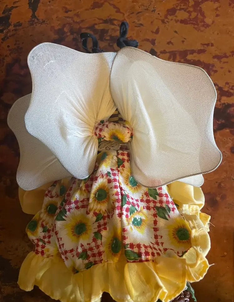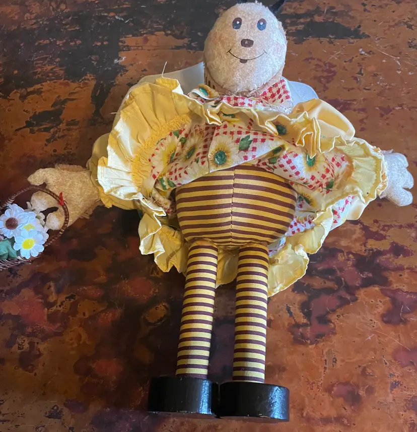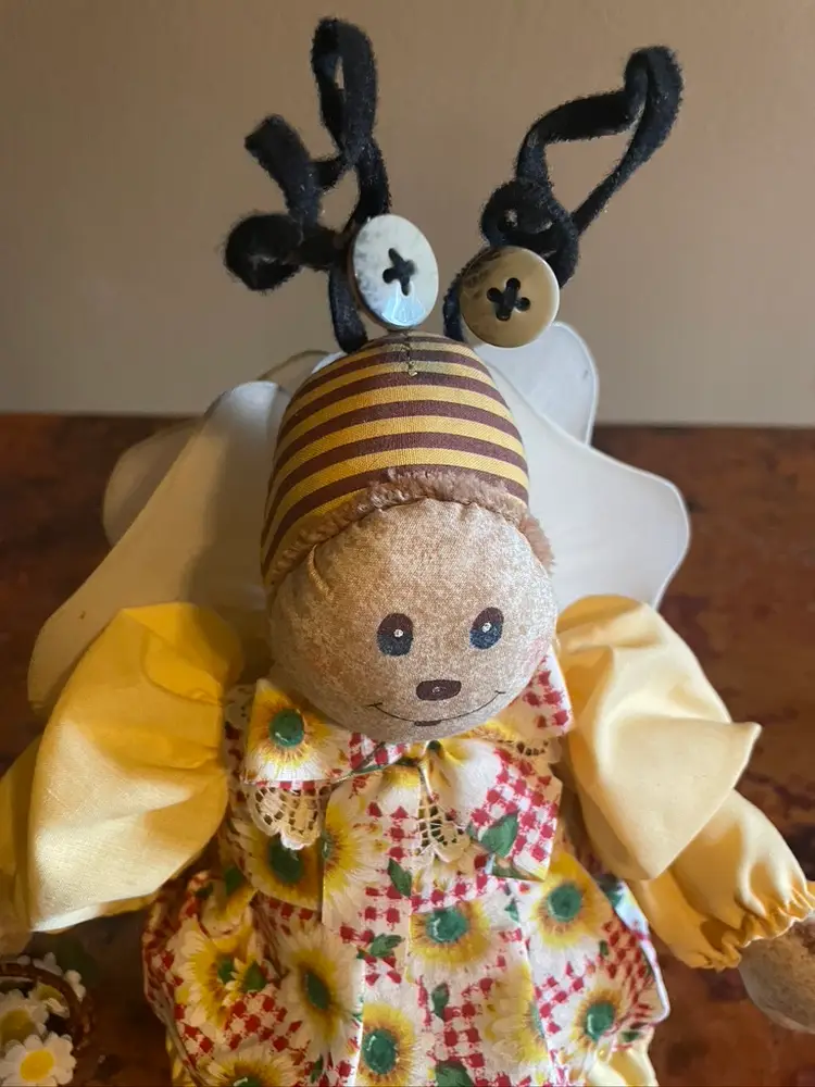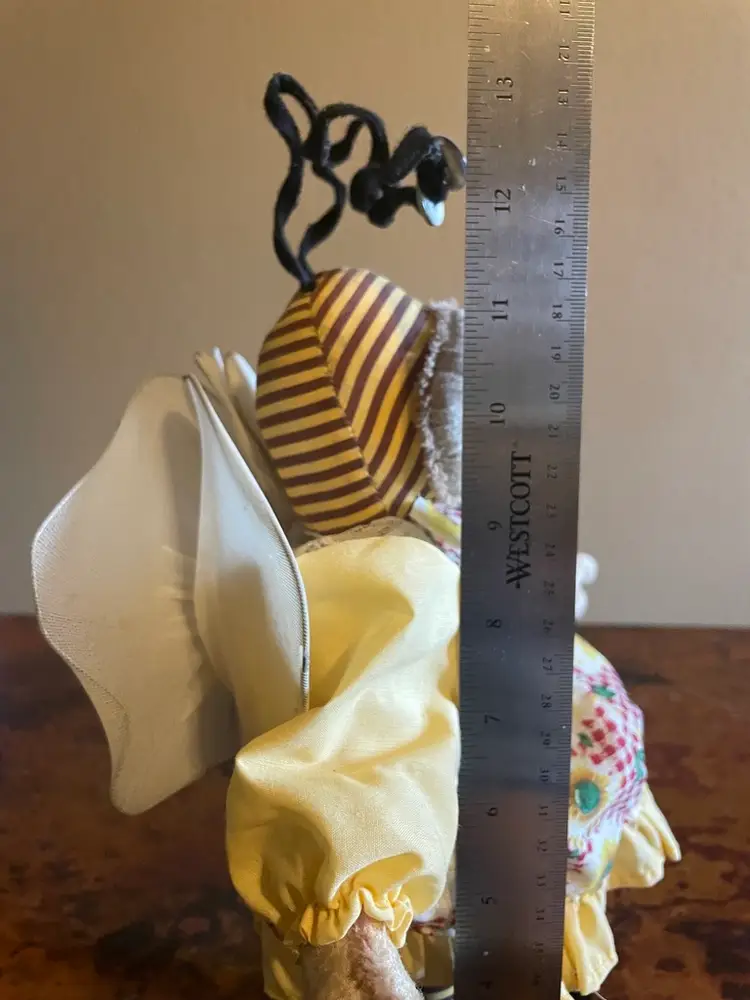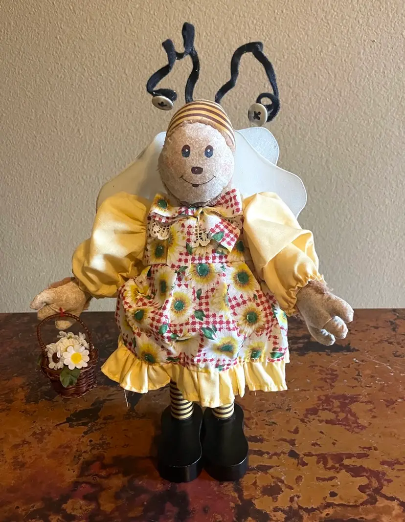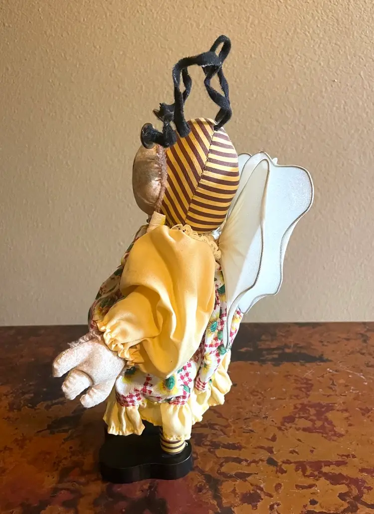 Stands 12" tall. Bends at waist. Slight wear on a wing. Wooden legs and shoes.