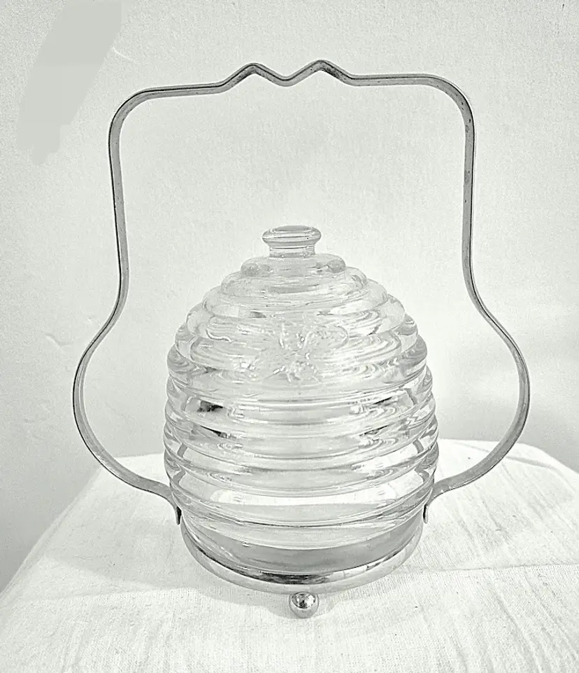 Art deco lidded honey pot jar with ridges and Bees for decoration. The dipper is wooden and a nice size. What makes this unique is the stainless steel server.