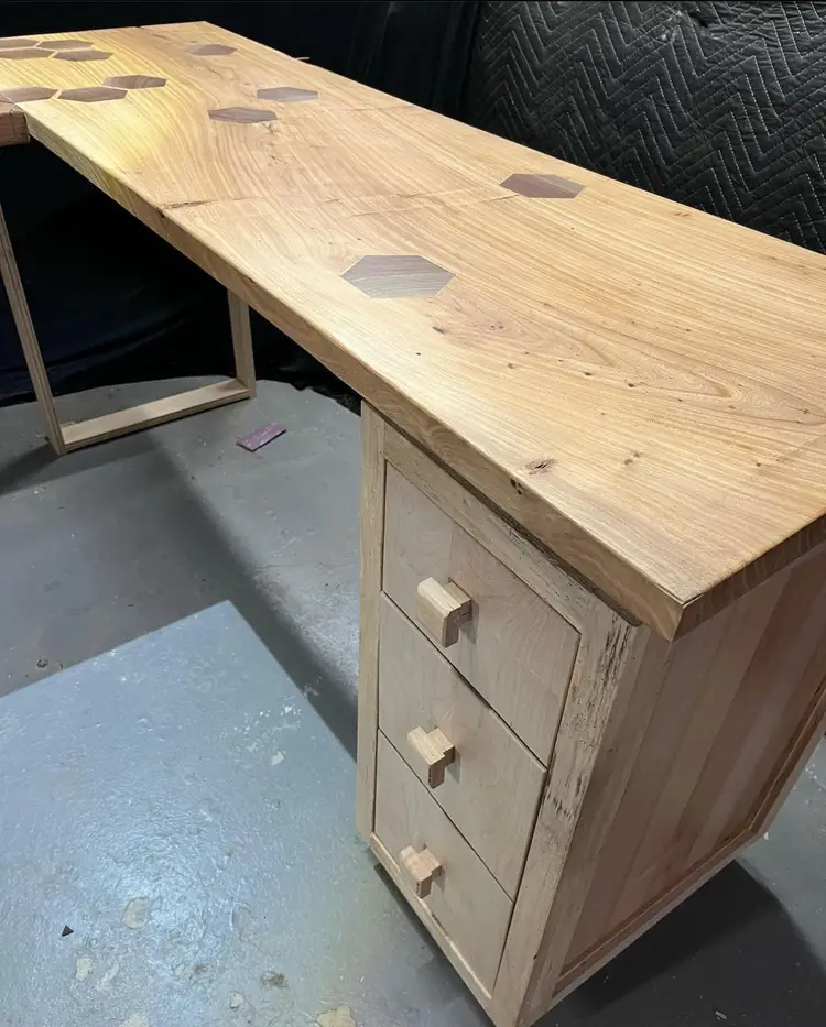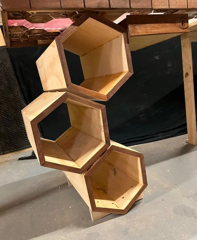 Unique Base: The left side sits atop a custom hexagonal honeycomb shelving unit, mirroring the desktop design.