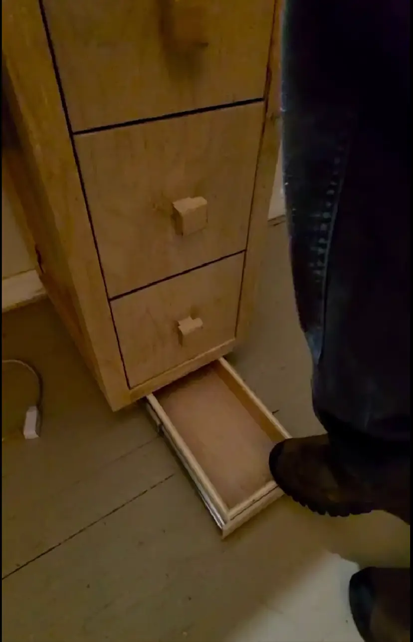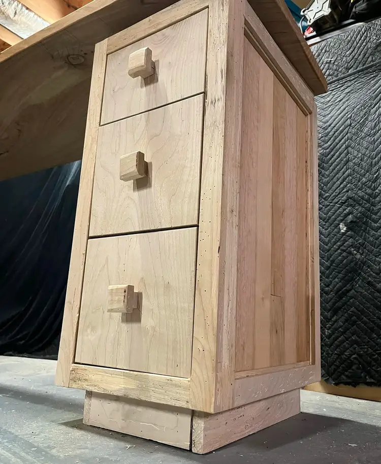Storage: The right side features a solid wood cabinet with three drawers and custom square pulls for essential storage. There is also a kick to open hidden compartment hidden behind the cabinet's lower kick board.