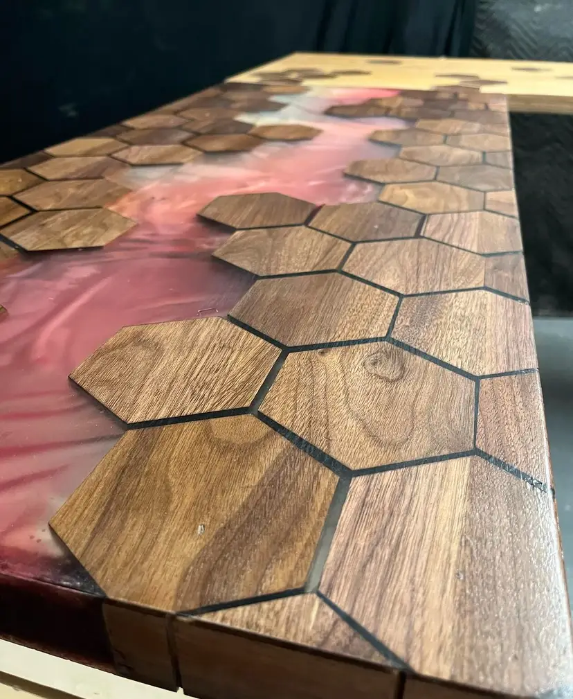 Elevate your workspace with this one-of-a-kind, handcrafted L-shaped desk. This statement piece features a stunning fusion of organic wood grain and modern resin art. The primary surface showcases a striking "blood red" epoxy river, populated by floating Walnut hexagonal tiles.
