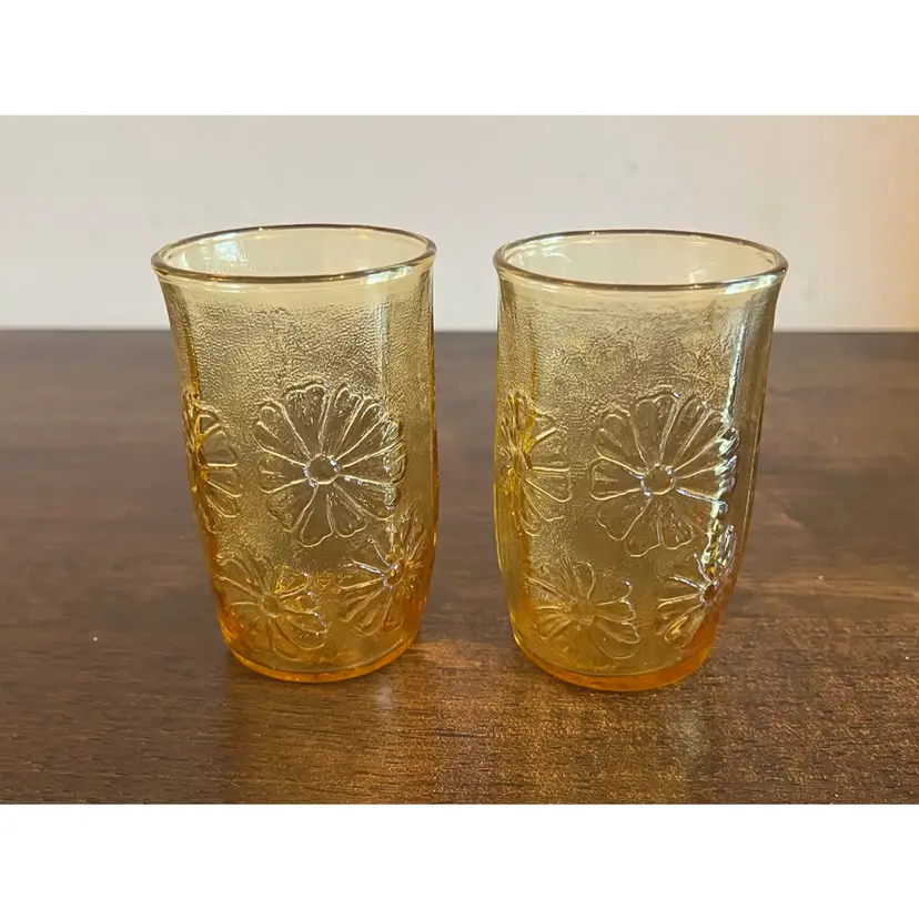 Super cute set of 2 vintage Anchor Hocking honey gold yellow juice glasses that feature a raised daisy pattern. Good condition, no chips cracks or noticeable flaws.