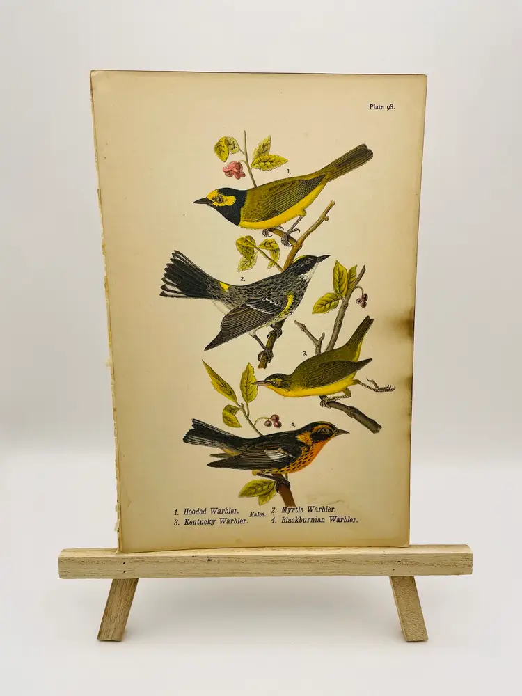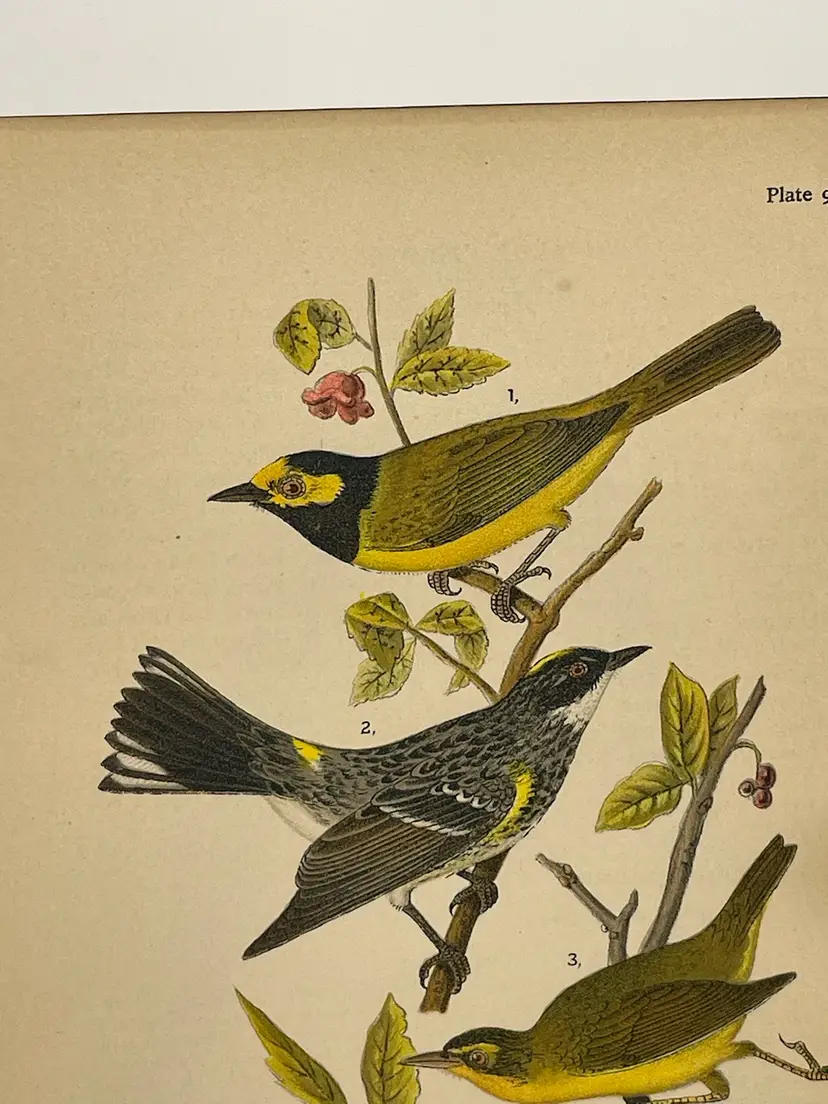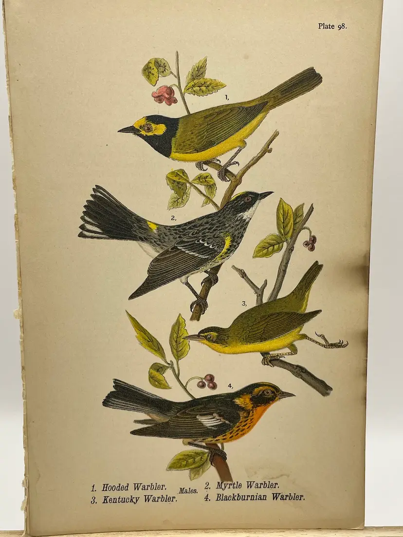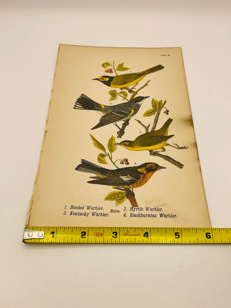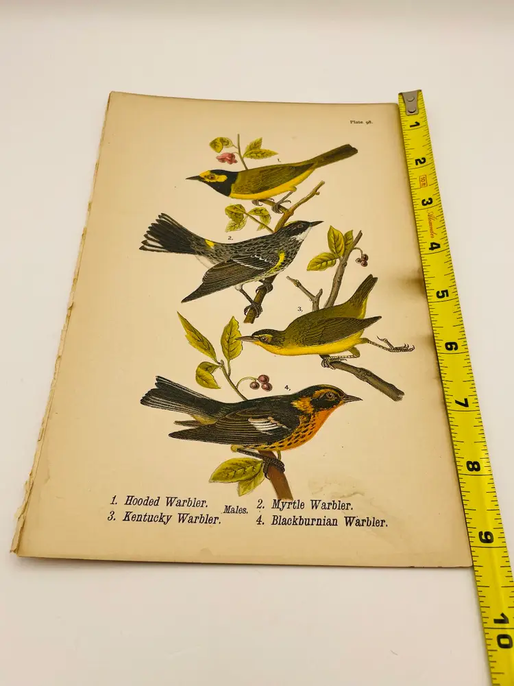 “Hooded Warbler/Myrtle Warbler/Kentucky Warbler/Blackburnian Warbler, Male, c. 1890 Color Plate Engraving, Plate 98, From An Antique Book Please see pictures for measurements.