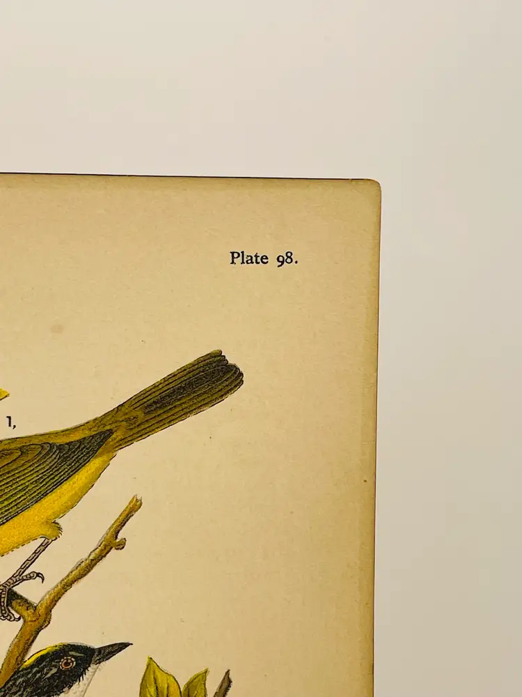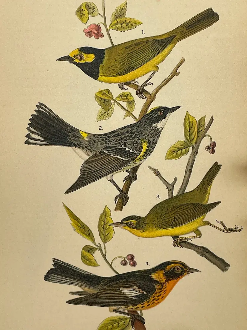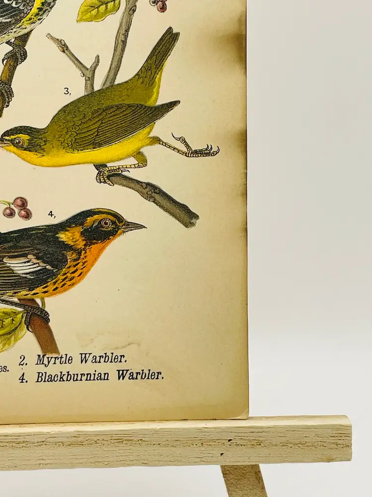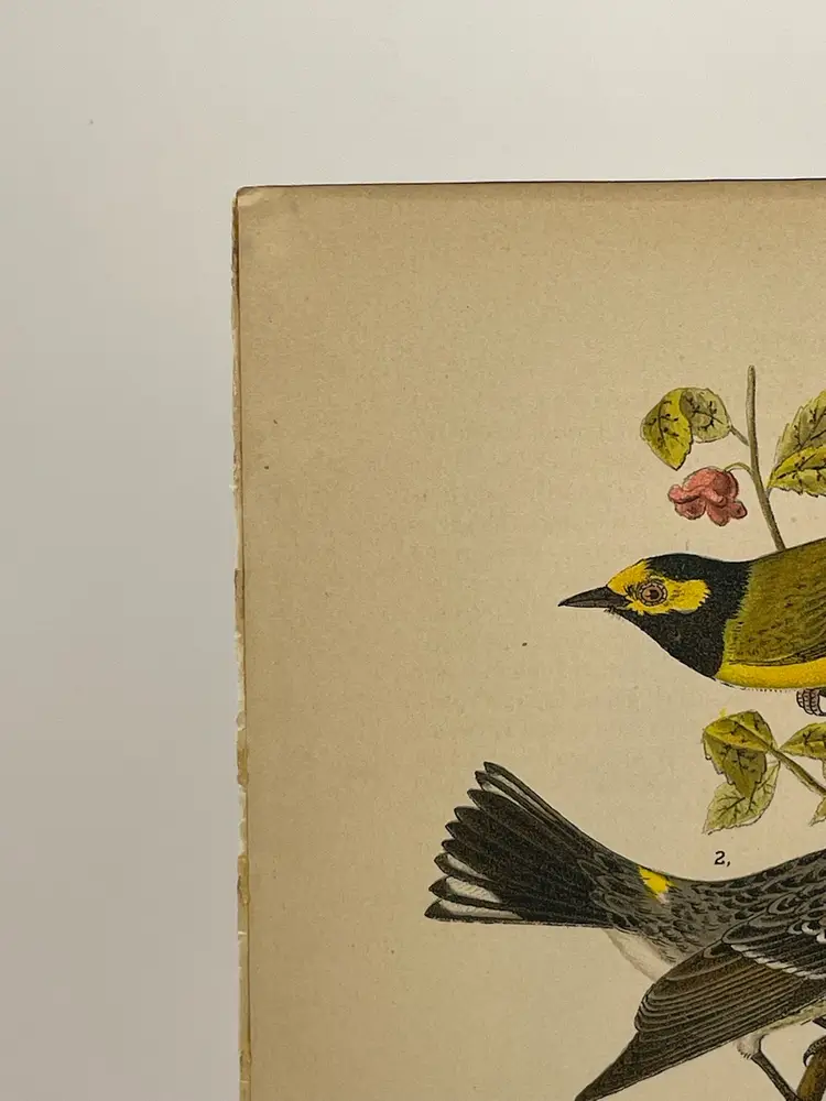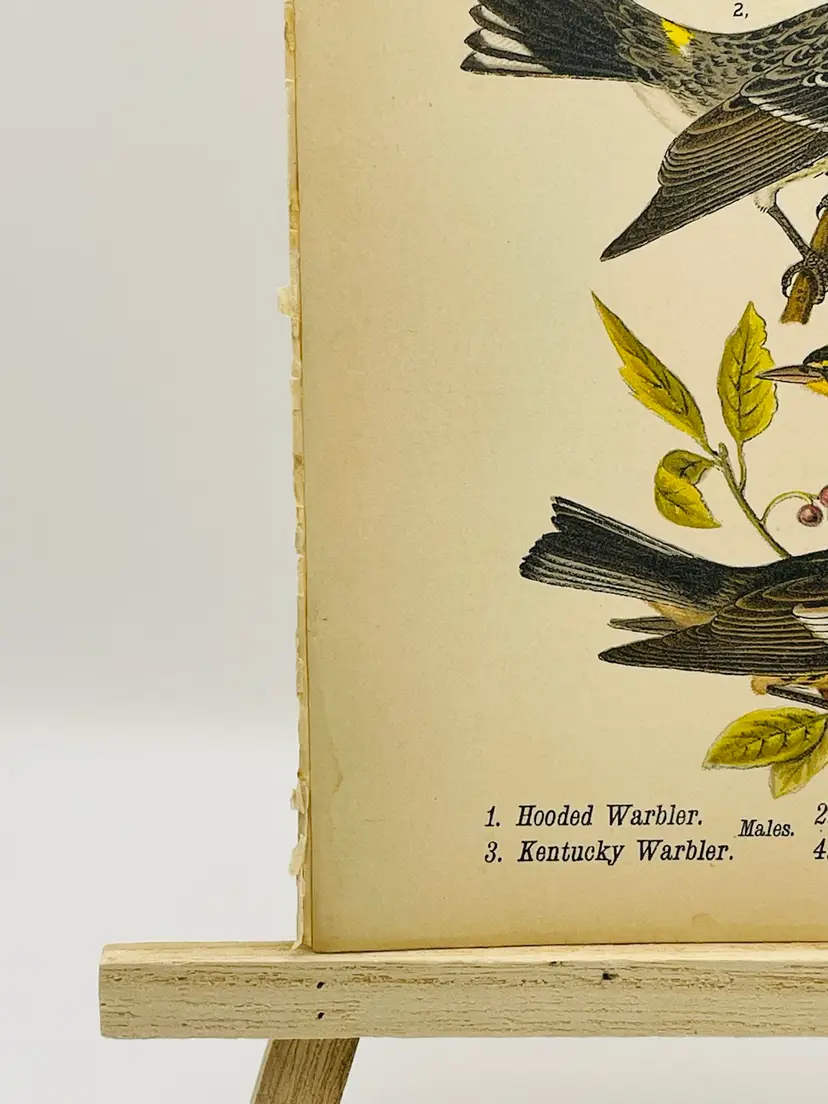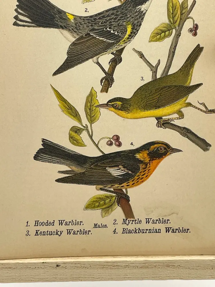 “Hooded Warbler/Myrtle Warbler/Kentucky Warbler/Blackburnian Warbler, Male, c. 1890 Color Plate Engraving, Plate 98, From An Antique Book Please see pictures for measurements.