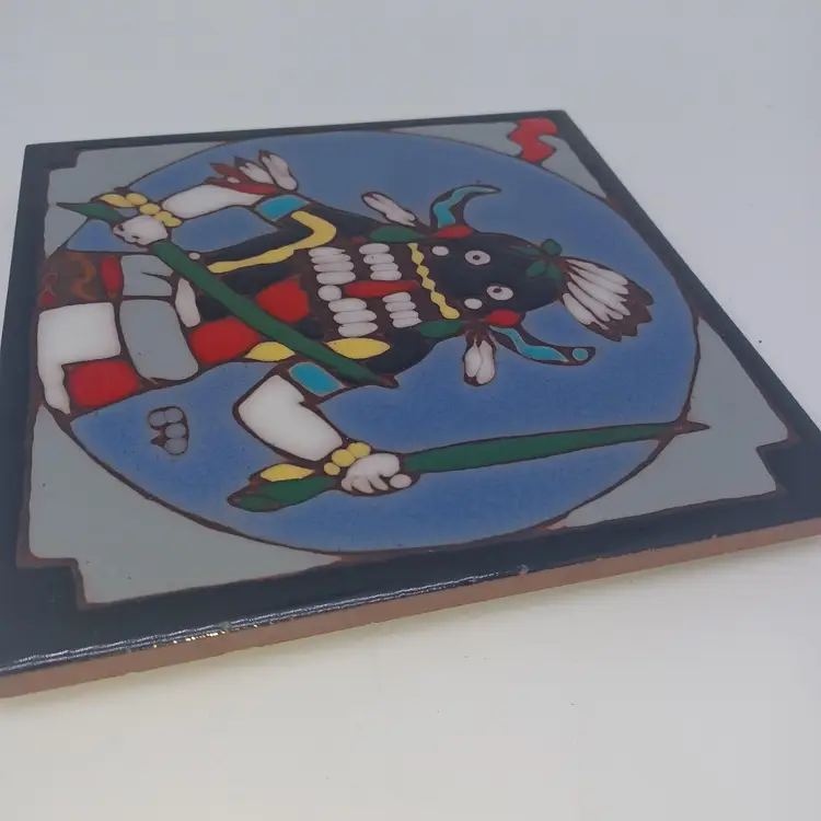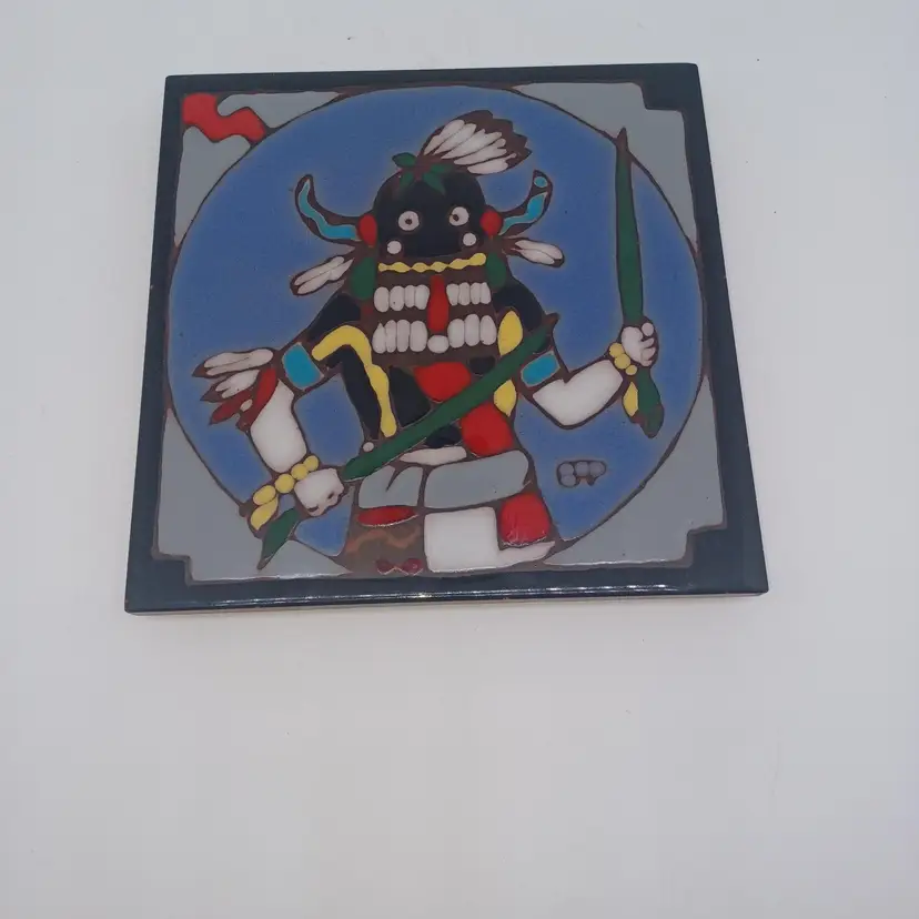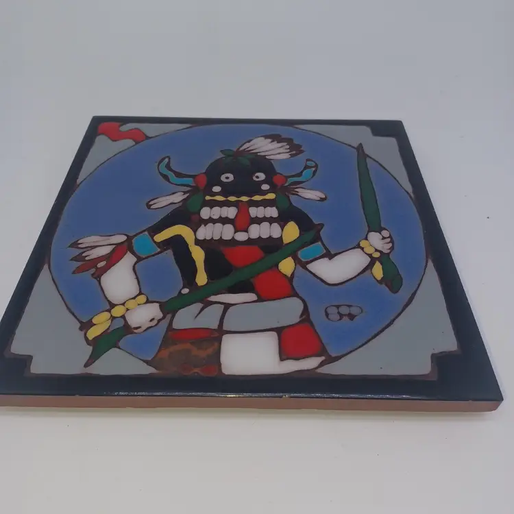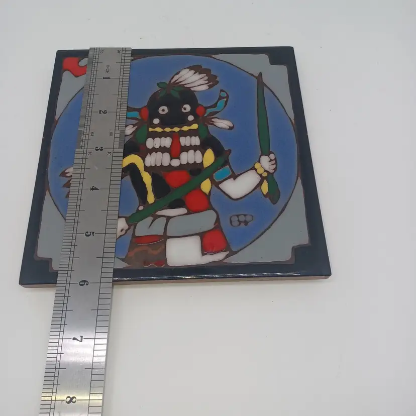 Hopi Indian Whipper Kachina Hand Painted Ceramic Tile Original Art Hot Plate ArtVintage Prusa Tile - Elany & Juri - Pachavu Hu' / Whipper Kachina