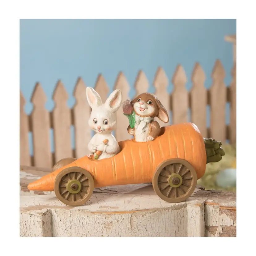 Sweet little bunnies ride around in their adorable Carrot Car. They are complete and a delightful addition to any Easter décor! (Shipping box: 12 x 12 x 8)