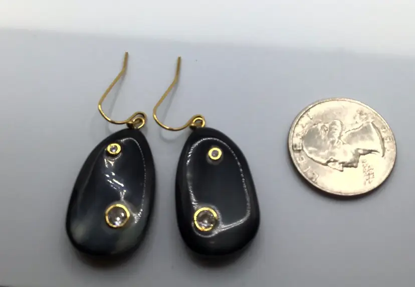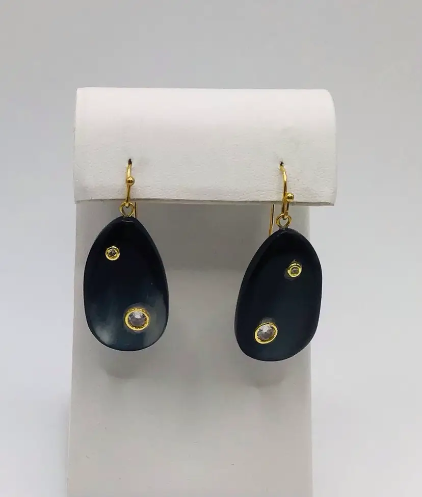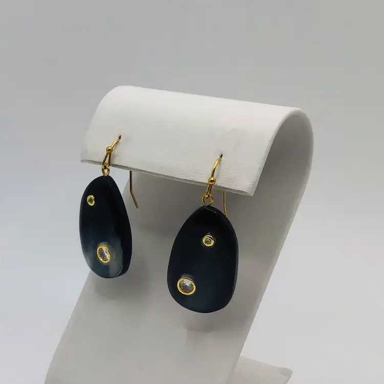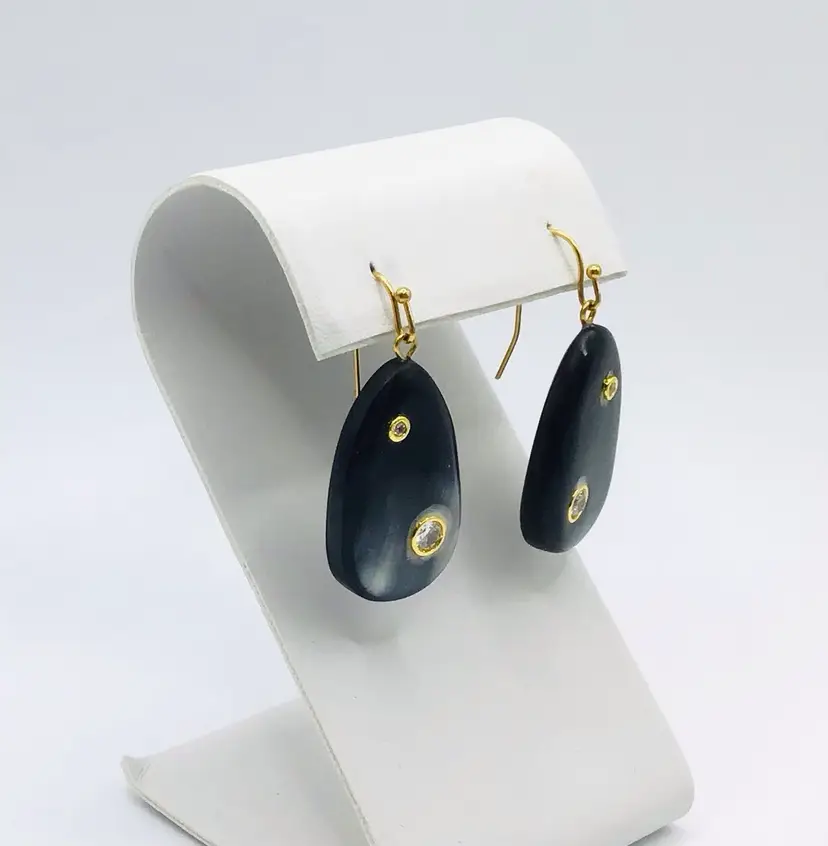 Duyen bull horn ethically sourced, made in Vietnam, adorned with clear rhinestones, gold tone French hooks. #226