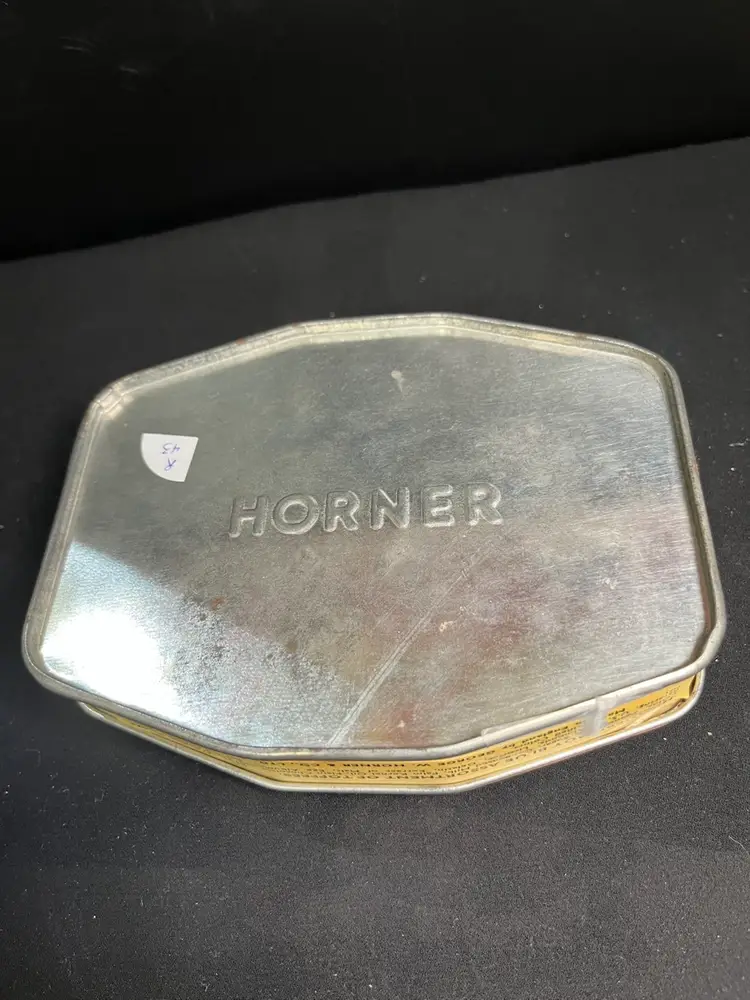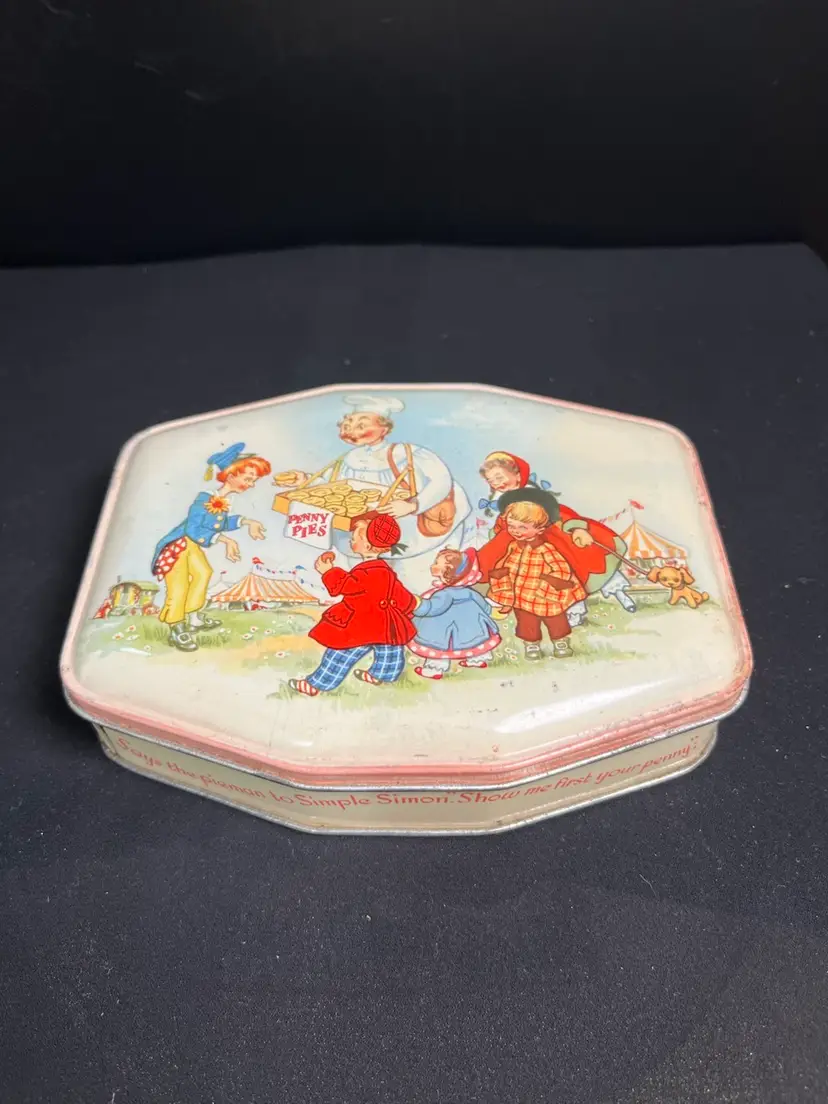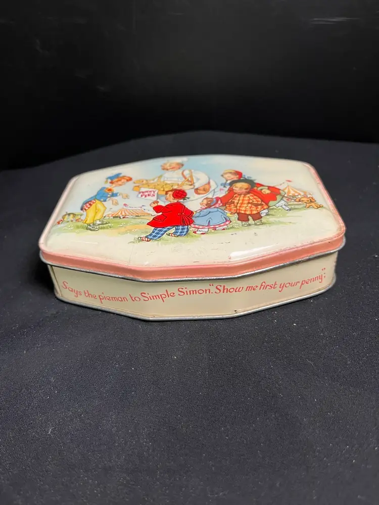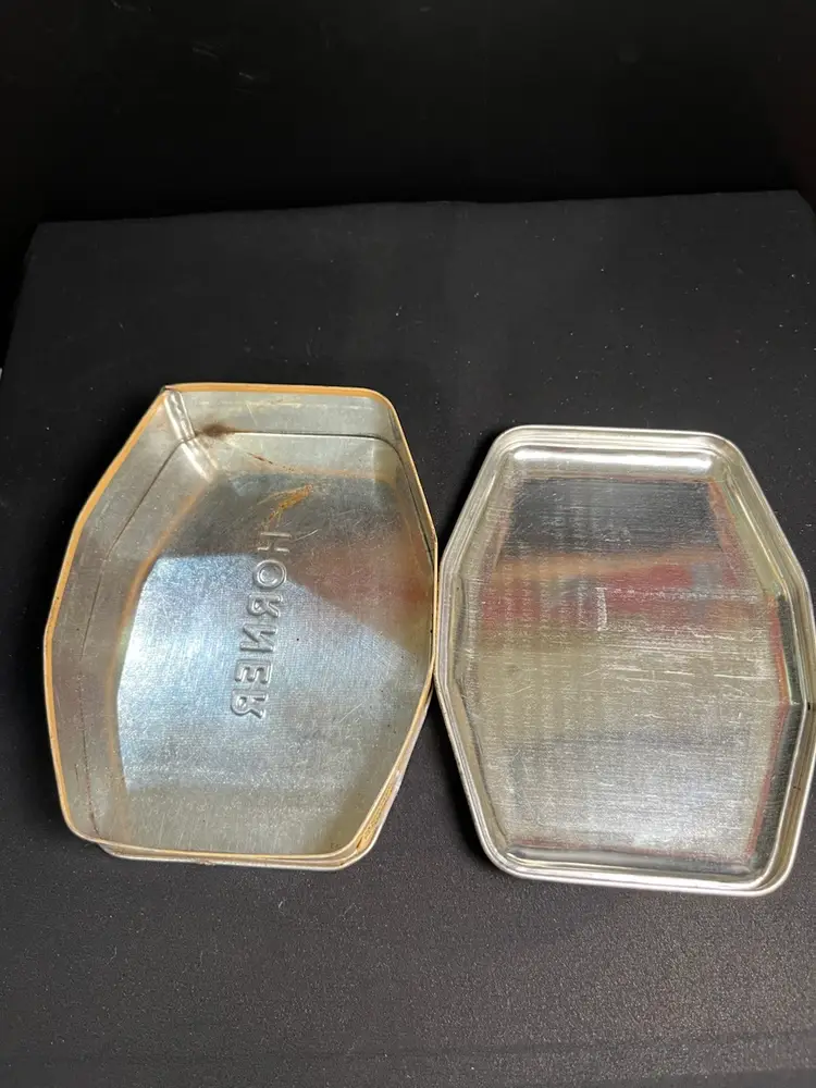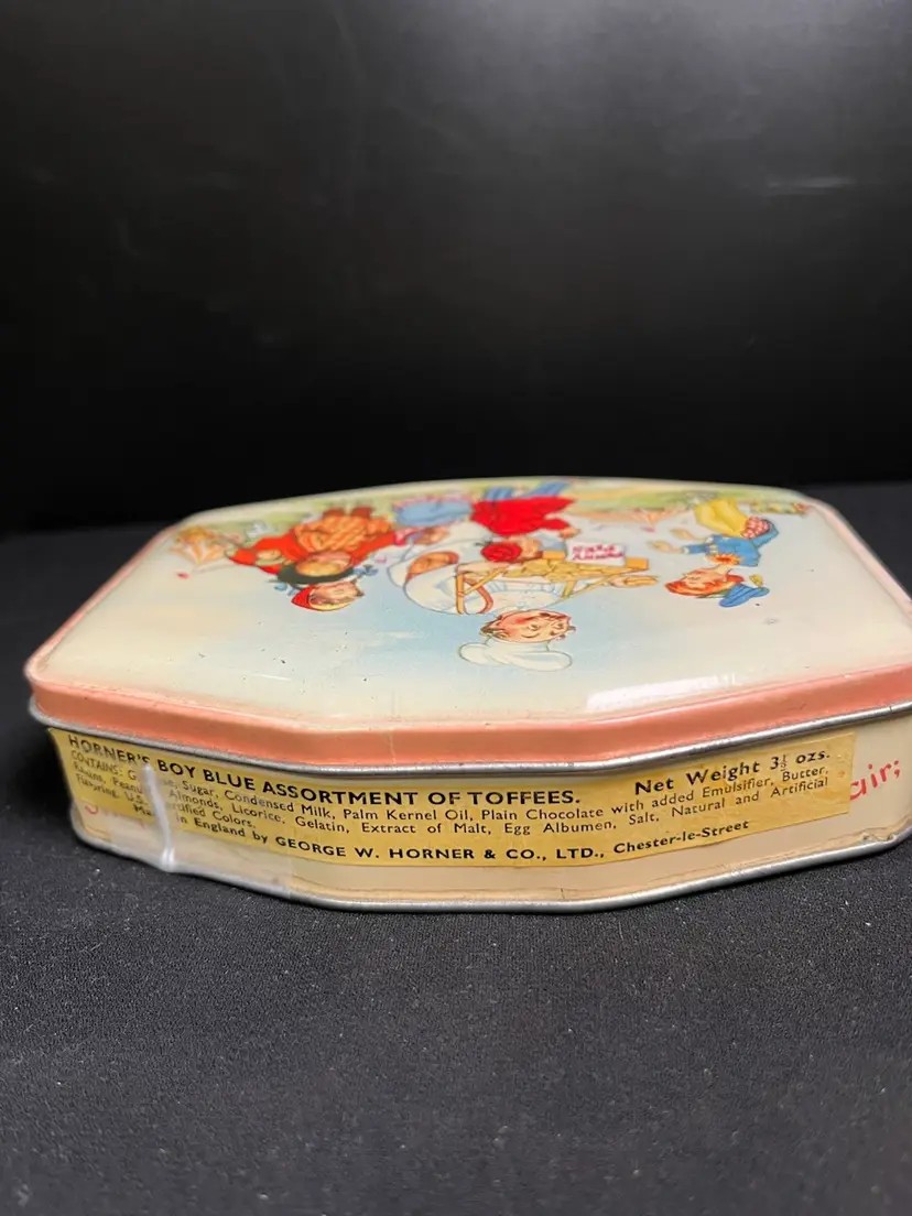 Original Toffee Label on the side. Slightly rusty crusty. Approx 5.5" L, 4.25"W, 1.5" H, 3.5 Oz