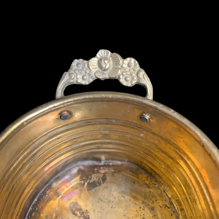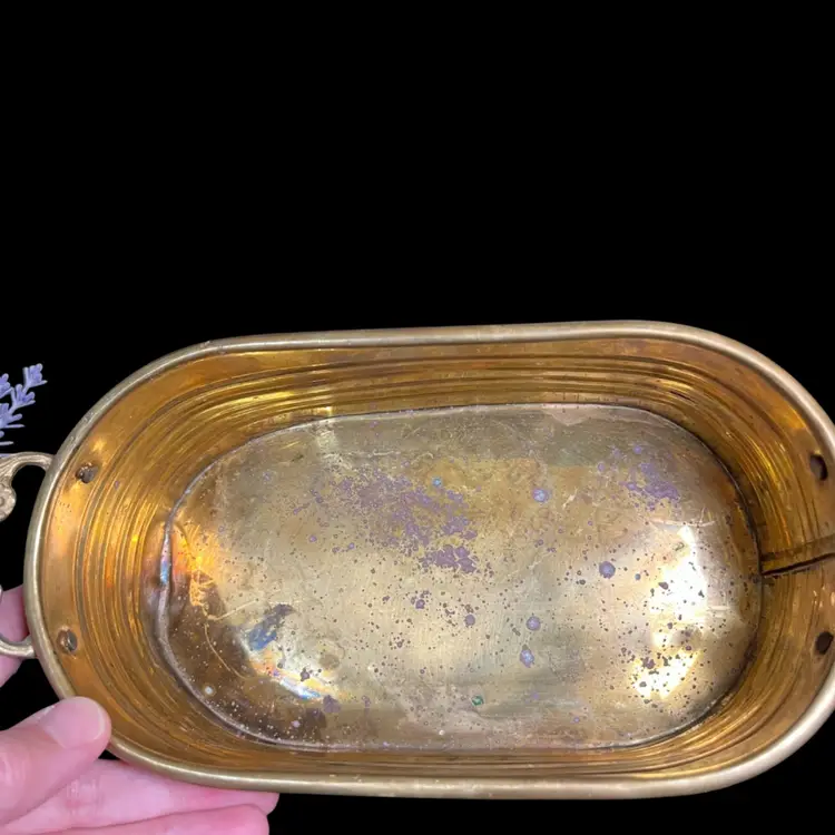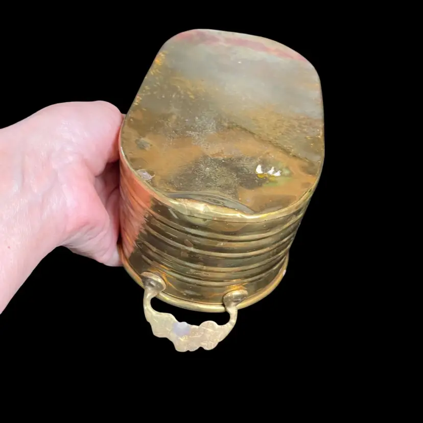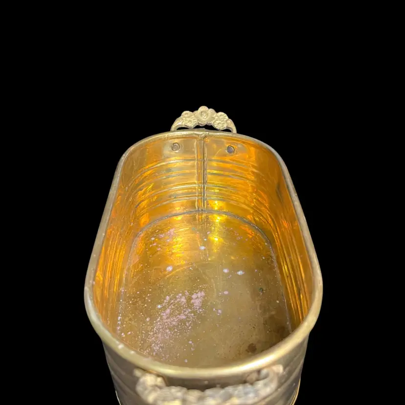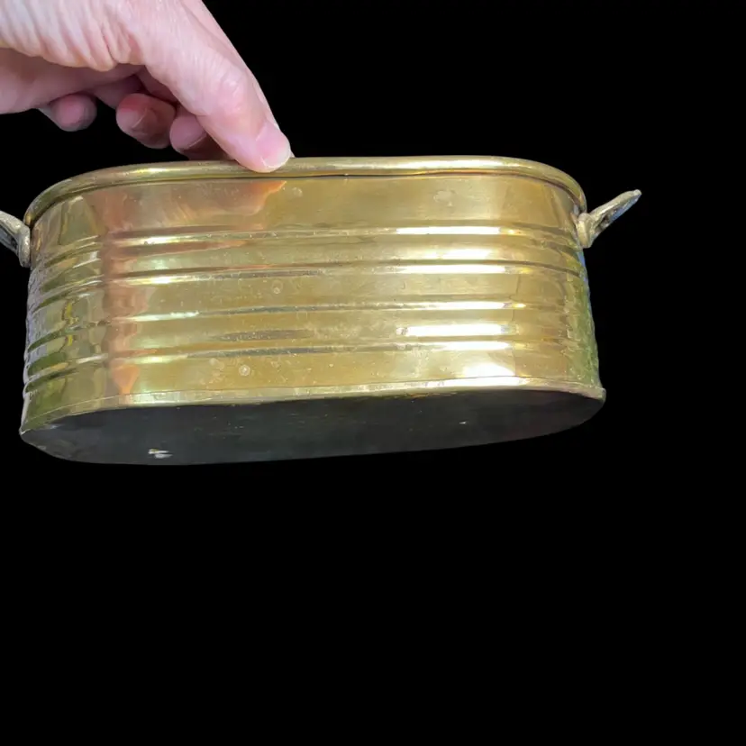 This has a nifty ribbed design. Then handles are a really nice touch. There is a dent on one end on bottom of planter. Some patina. It measures approx 9.5"L, 3"H, 4.25"Deep, 8 Oz