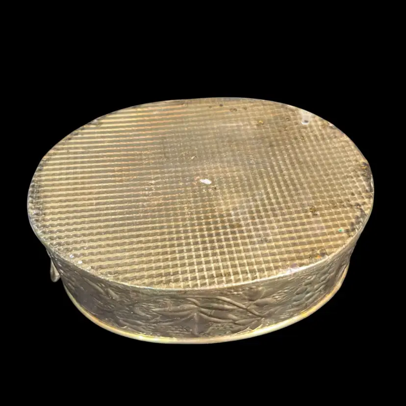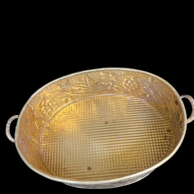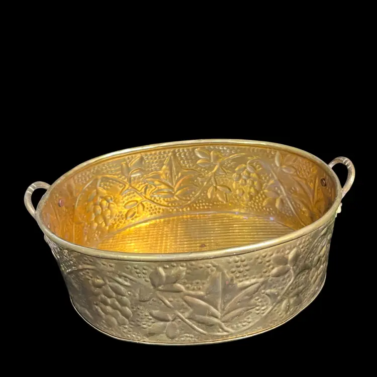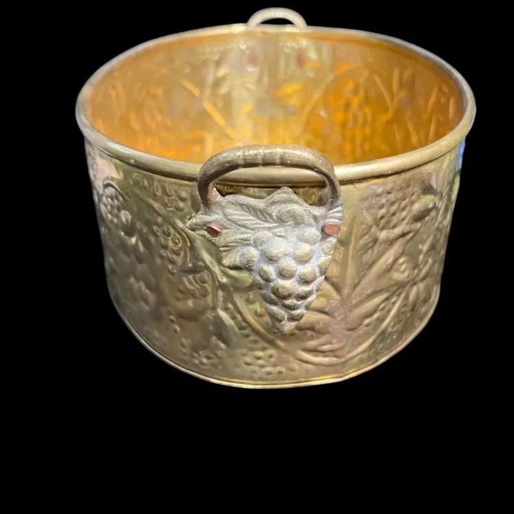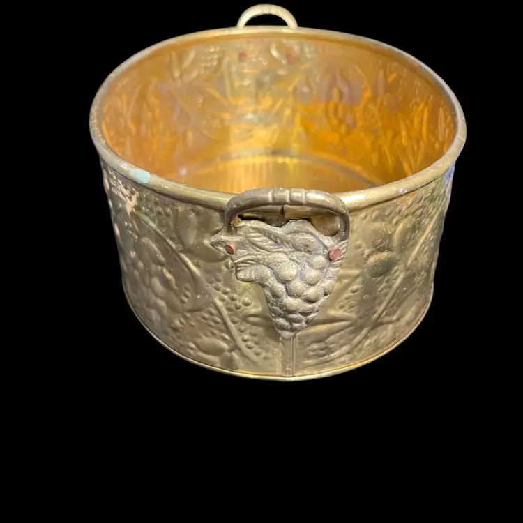 So many uses for this beauty. It has patina. Love the texture on this. Handles both have a brass grape cluster w/ leaves applied. Overall is in really good vintage condition. It measures approx 3.5"H, 9"W, 5.75" deep, 8 Oz