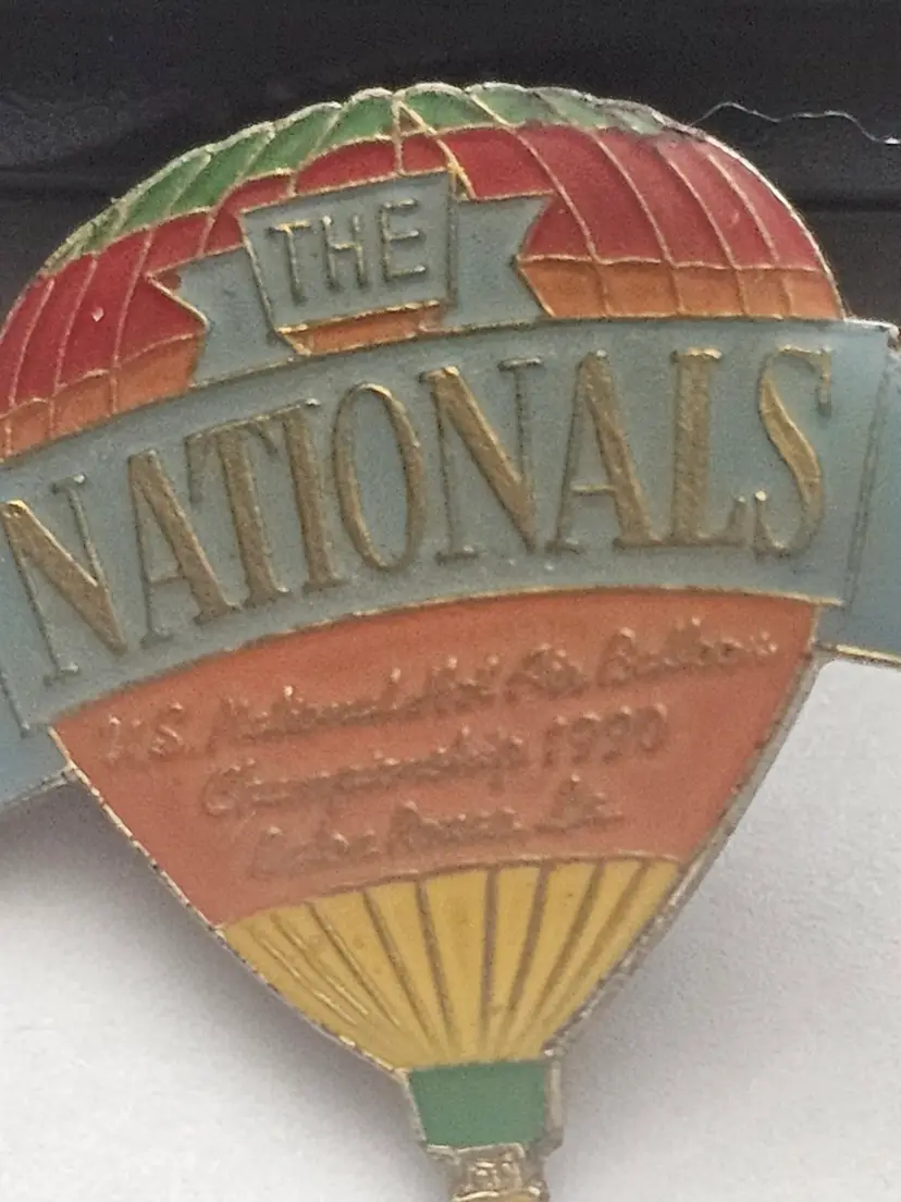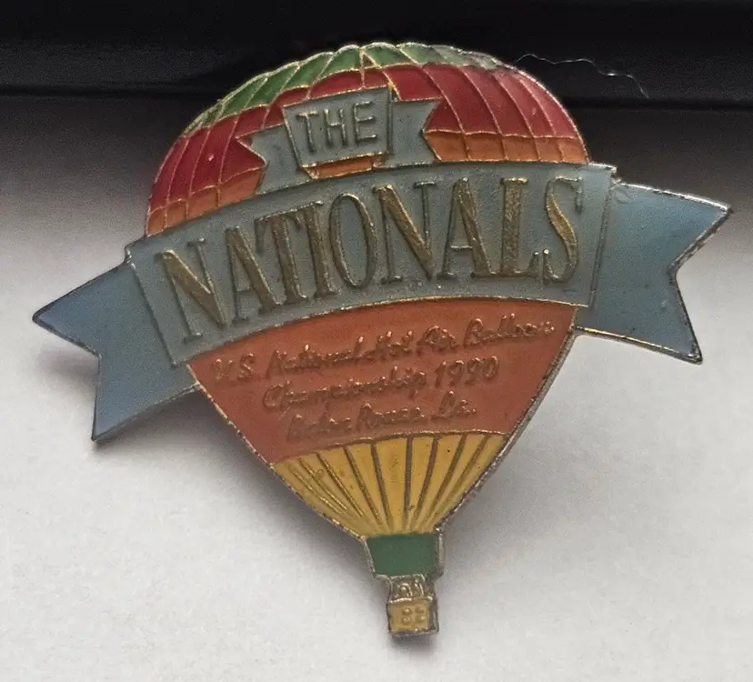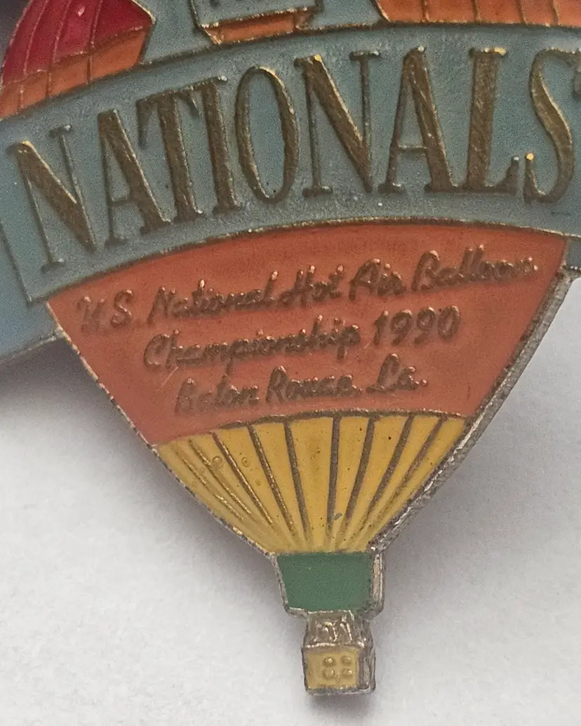 The Hot Air Balloon Pin Nationals U.S. National Championship 1990 in Baton Rouge, LA is a collectible pin showcasing the event held in 1990. This pin represents a piece of history from the U.S. National Championship, making it a unique and commemorative item for enthusiasts of hot air balloons and collectors of pinbacks. The design and imagery on the pin likely capture the excitement and spirit of the championship competition, making it a valuable addition to any collection of aviation memorabilia.