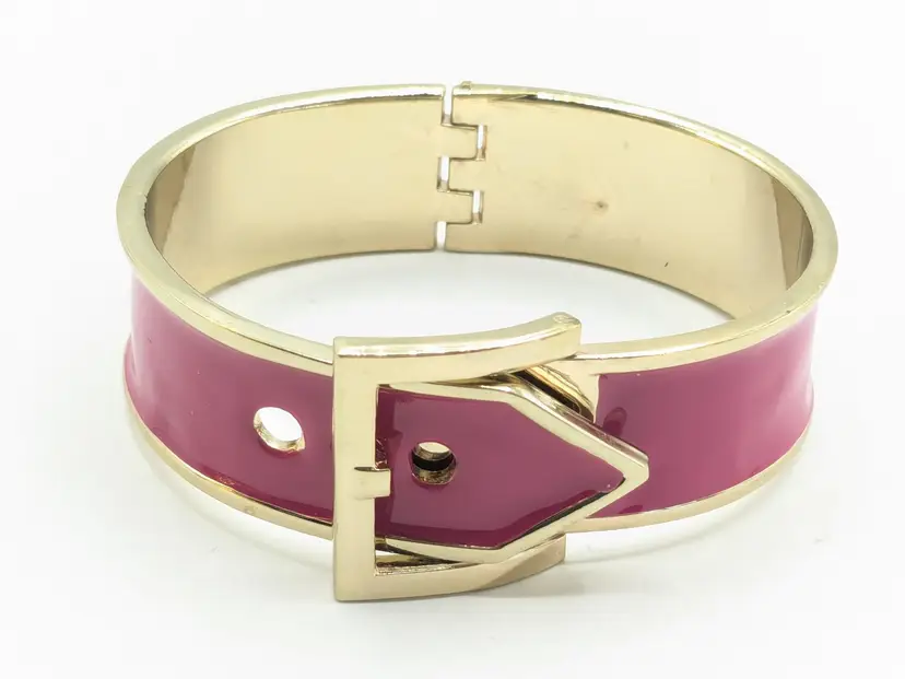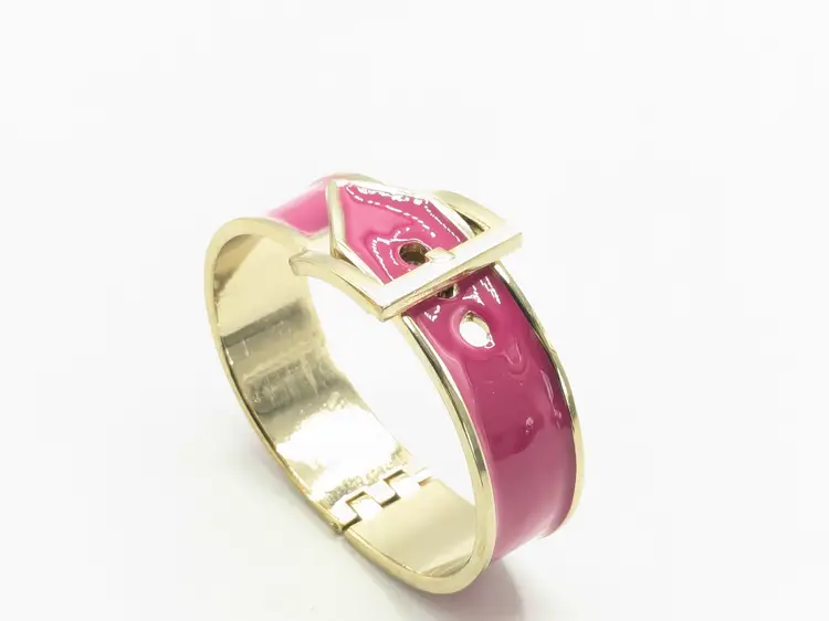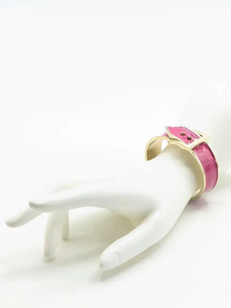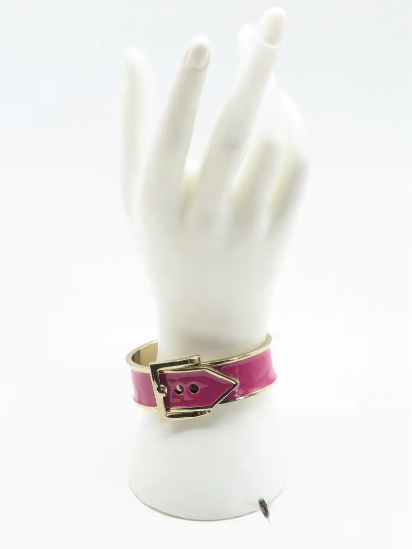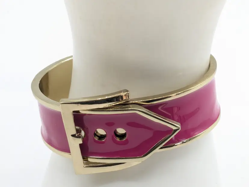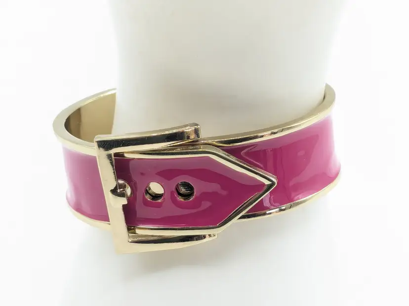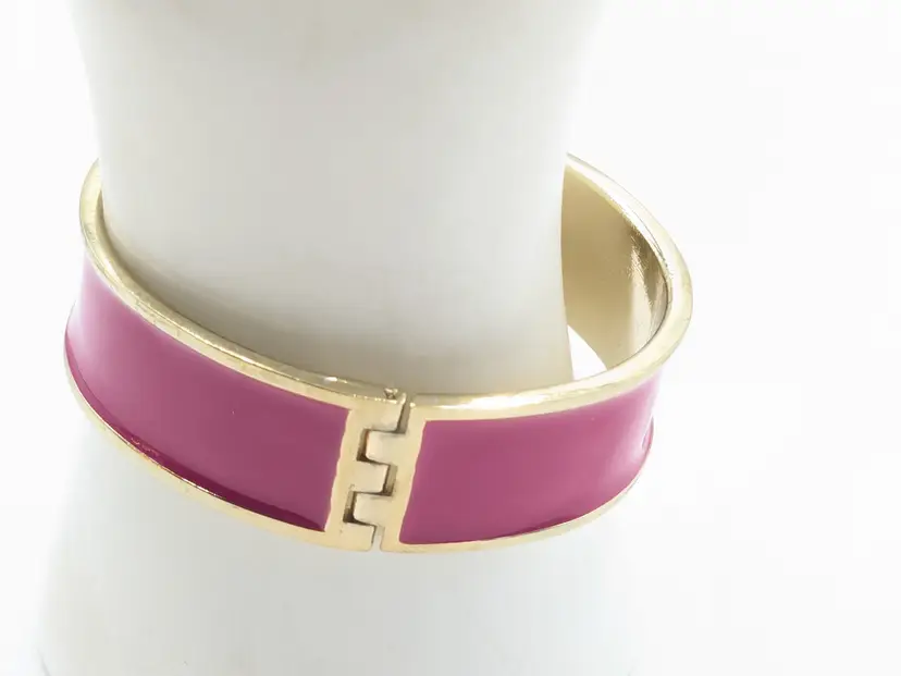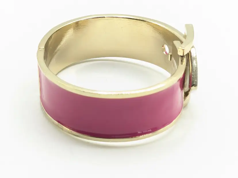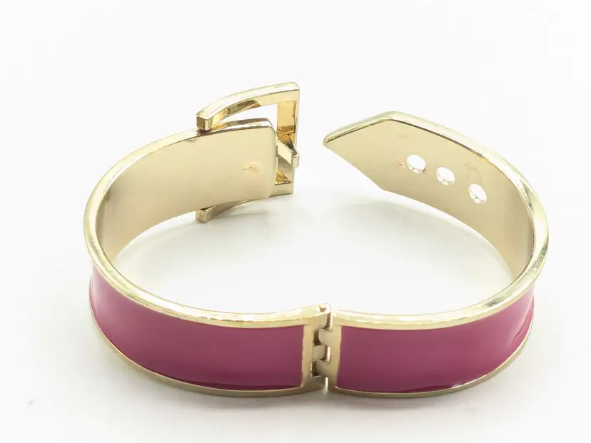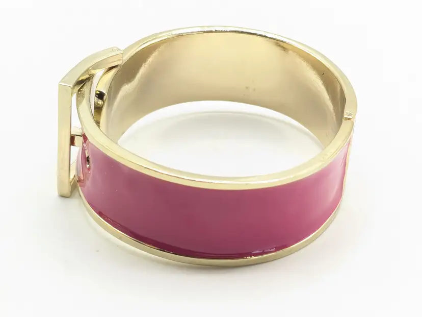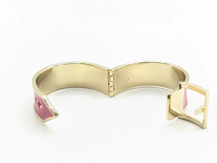 Good condition. No color loss to the pink enamel or silver tone. Bright and shiny. Bracelet measures 6 3/4" to 7 1/2" and 3/4" wide. EN2