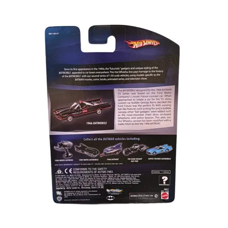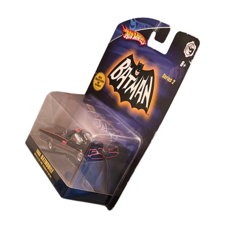 The Hot Wheels 1966 TV Series Batmobile is a diecast toy vehicle in 1:50 scale, featuring the iconic black color and design of the Batmobile from the Batman TV series. This limited edition special edition model is sealed in its original unopened box, making it a highly collectible piece for fans of Batman and diecast vehicles. With its detailed craftsmanship and connection to the beloved Batman franchise, this toy is sure to delight collectors and enthusiasts aged 8 and above. Light storage wear to cardboard backing.