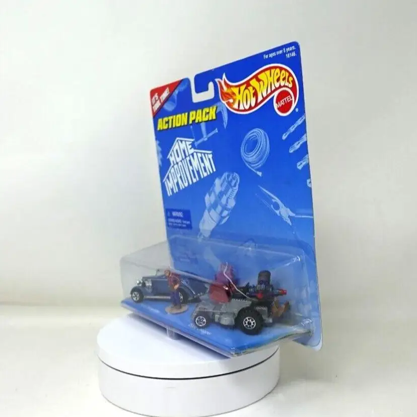 This Hot Wheels HOME IMPROVEMENT Action Pack is a highly collectible diecast car with a 1:64 scale. The blue and silver car features the iconic phrase "IT'S TOOL TIME" made famous by Tim Allen's character in the TV show. The limited edition car was manufactured in 1996 and is part of the HOME IMPROVEMENT Action Pack series. The car is in excellent condition and perfect for any Hot Wheels or HOME IMPROVEMENT fan.