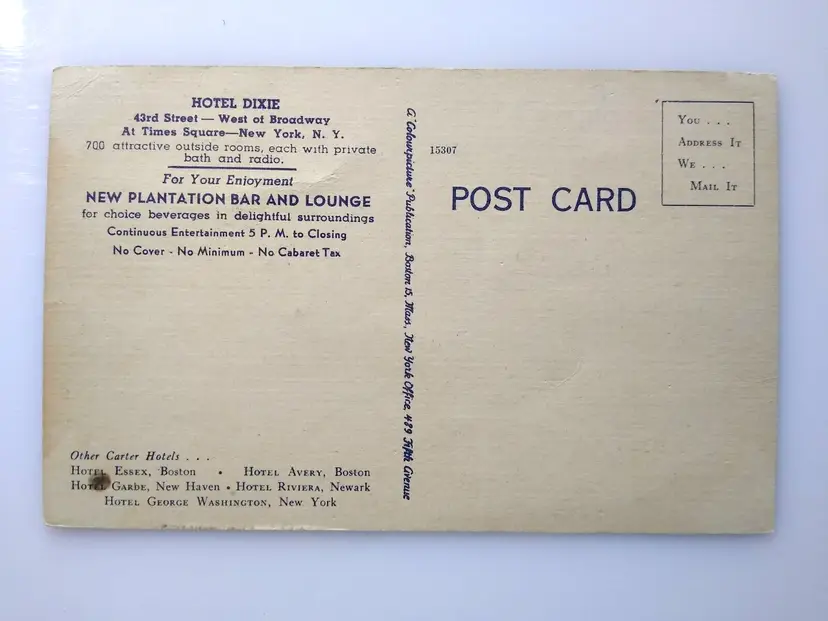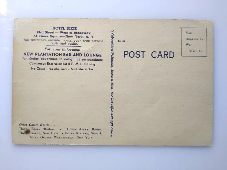 Number of Items in Set: 1 Unit of Sale: Single Unit Artist: Unknown Occasion: Sayings & Quotes Size: Standard (5.5 x 3.5 in) Signed: No Custom Bundle: No Year Manufactured: 1945 Material: Paper City: New York City Original/Licensed Reprint: Original Franchise: Does Not Apply Brand/Publisher: Colourpicture Subject: Hotel Continent: North America Type: Printed (Lithograph) Era: Linen (1930-1945) Region: New York Country: USA Theme: Architecture, Greetings, Hotel & Restaurant, Buildings, Old Cars, Car, Automobiles, Times Square Features: Divided Back Time Period Manufactured: 1940-1949 Country/Region of Manufacture: United States Postage Condition: Unposted