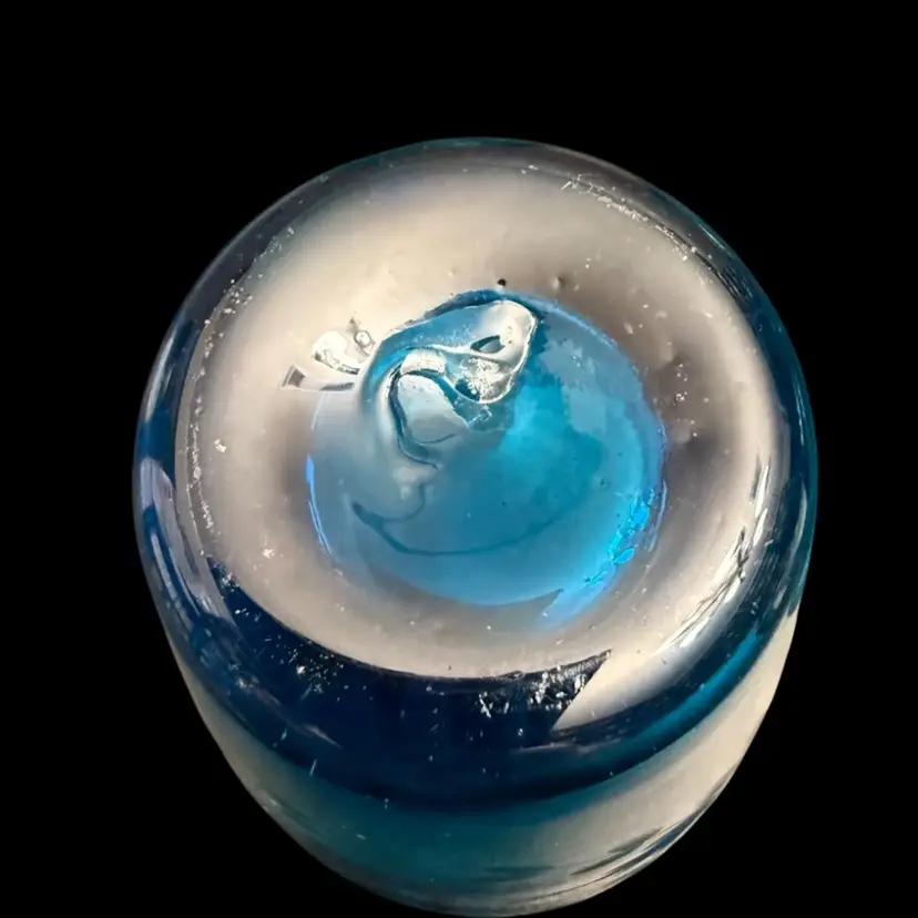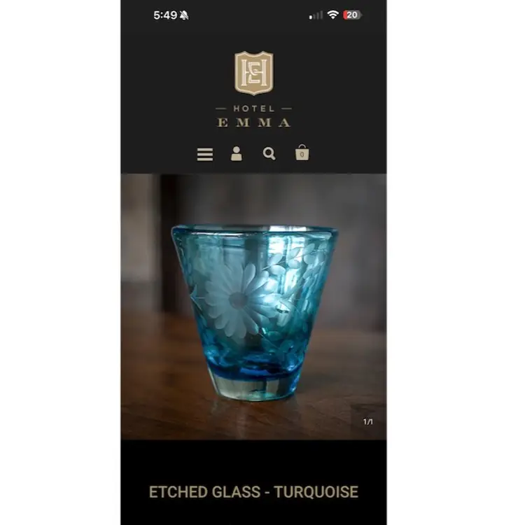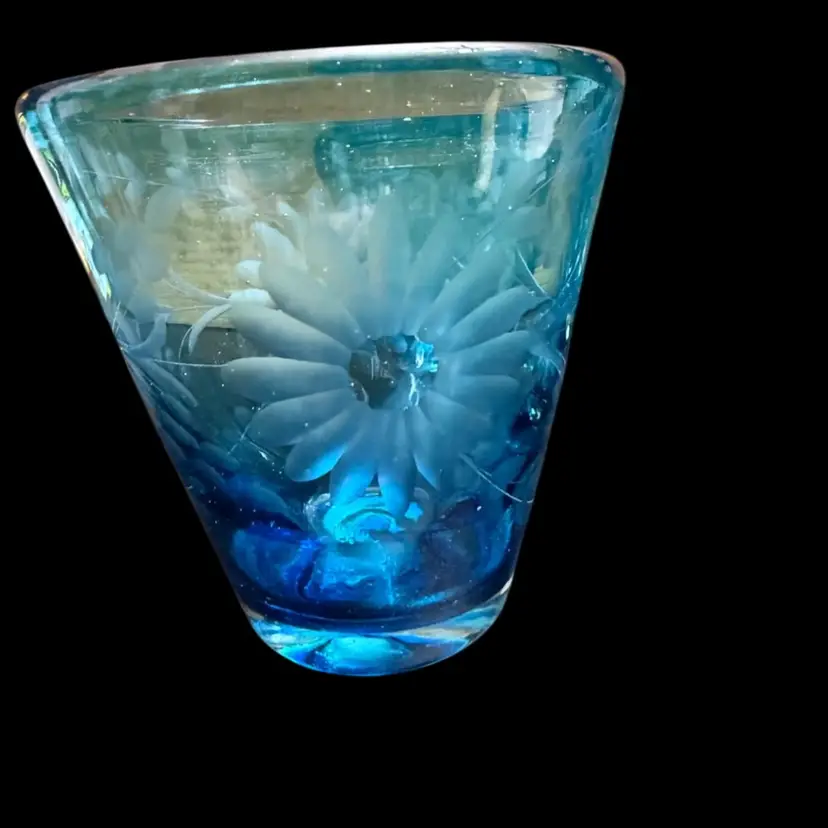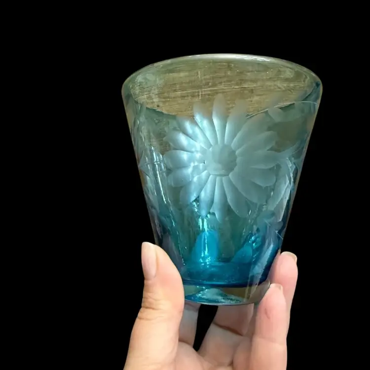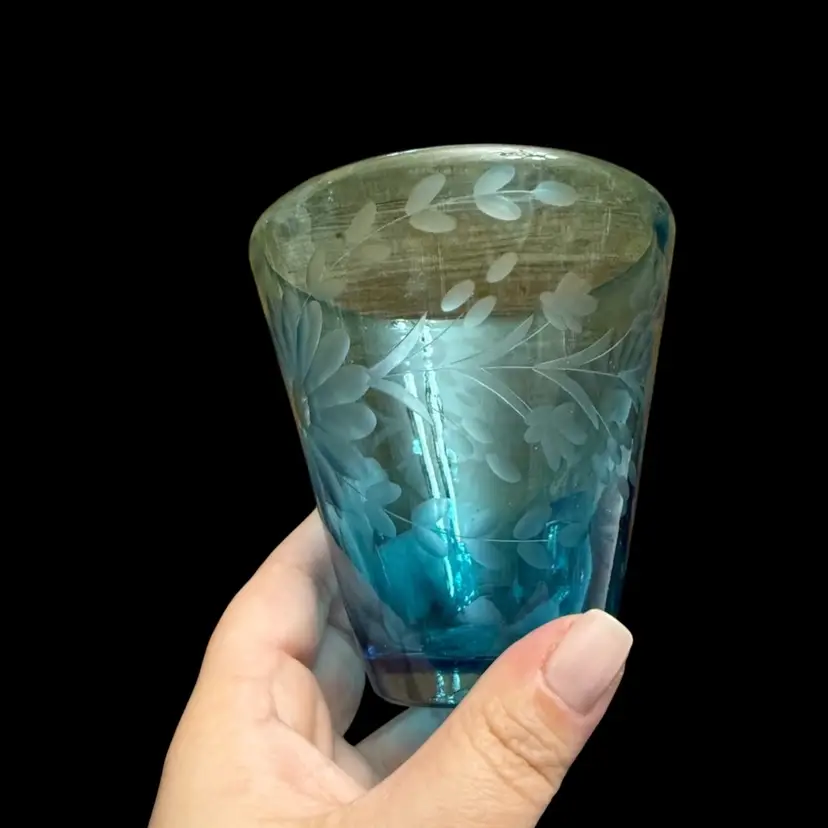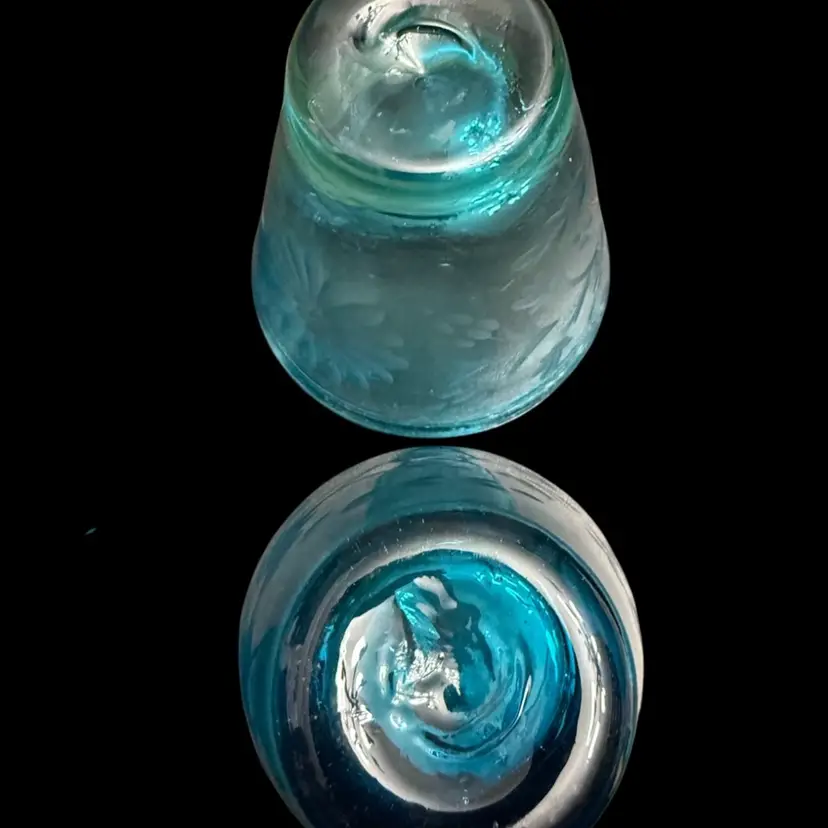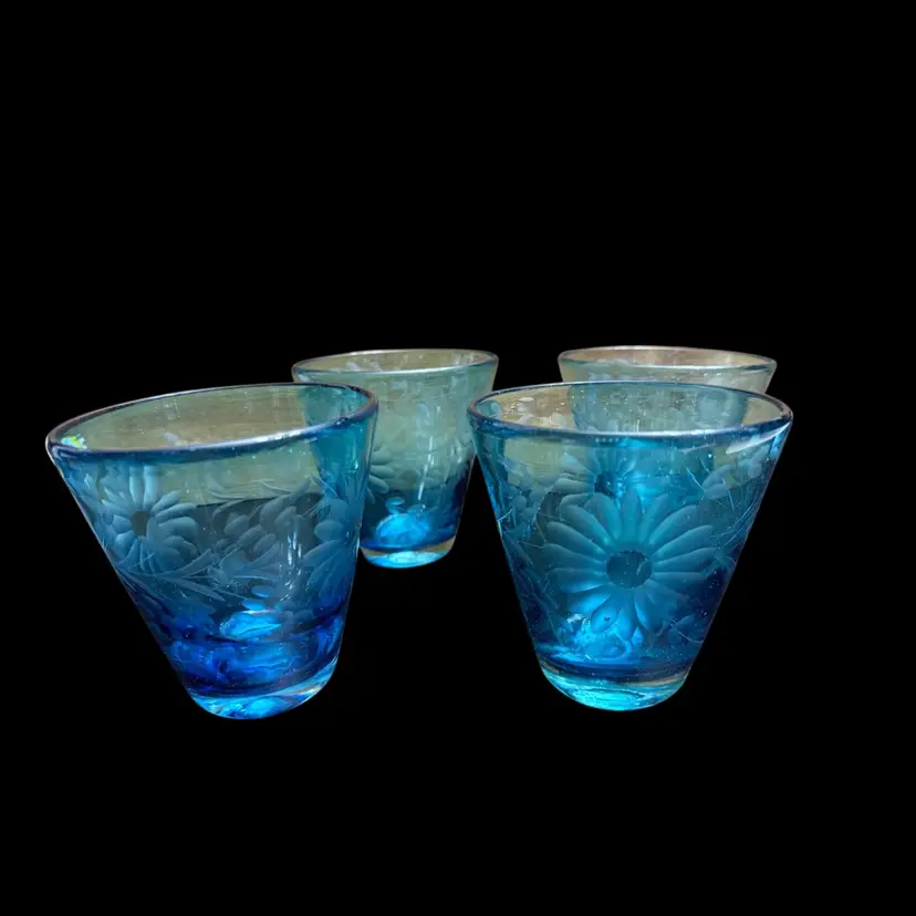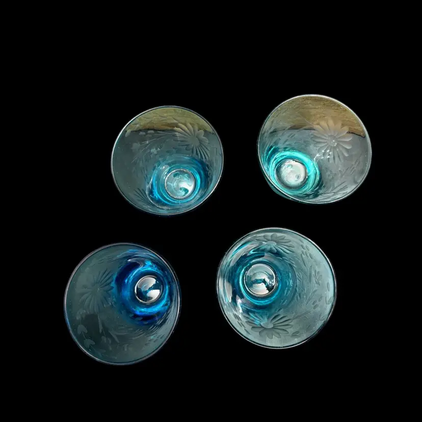 These are a gorgeous turquoise blue with deep deep tones. Beautiful etched flowers in the glasses. No chips no scratches. Amazing quality. I included a picture from the hotel Emma website for you to see the actual color. These were extremely hard to photograph to get the actual rich blue. No matter what background I used it just kinda faded it out.