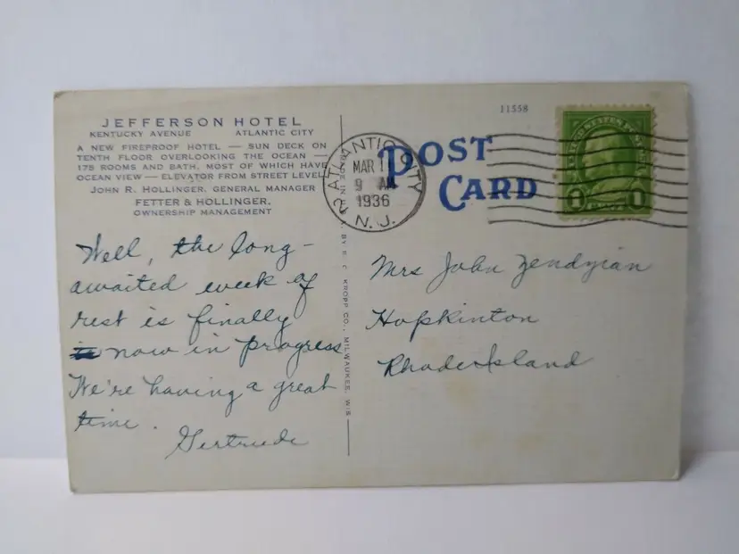 Size: Standard (5.5 x 3.5 in) Custom Bundle: No Continent: North America Region: New Jersey Country: USA Type: Linen Postcard Number of Items in Set: 1 Original/Licensed Reprint: Original City: Atlantic City Time Period Manufactured: 1930-1939 Unit of Sale: Single Unit Era: Inter-War (1918-1939) Country/Region of Manufacture: United States Material: Paper Theme: Beach Town, Agriculture, Greetings, Hotel & Restaurant Features: Divided Back Subject: Hotel Postage Condition: Posted Brand/Publisher: EC Kropp