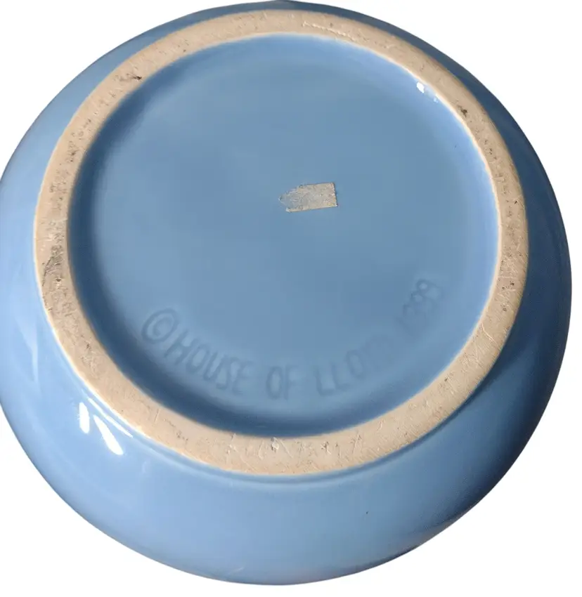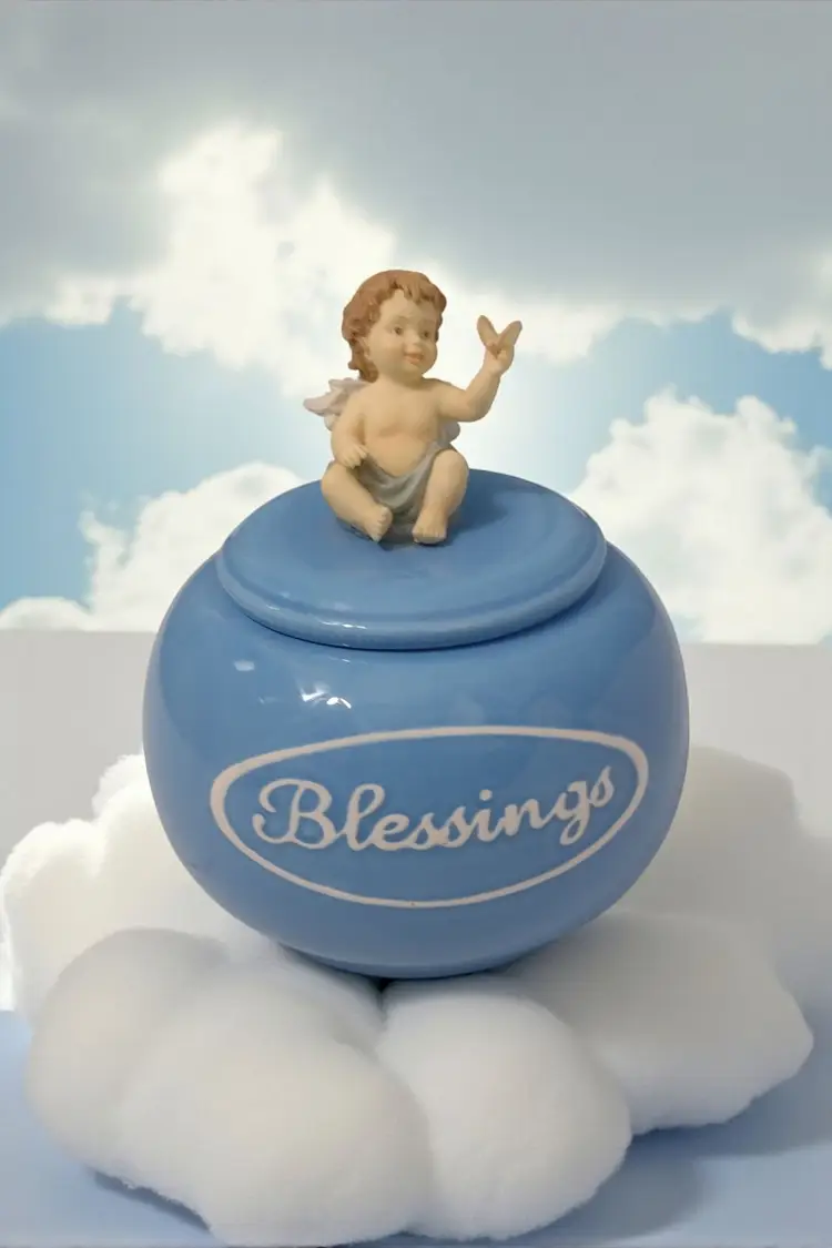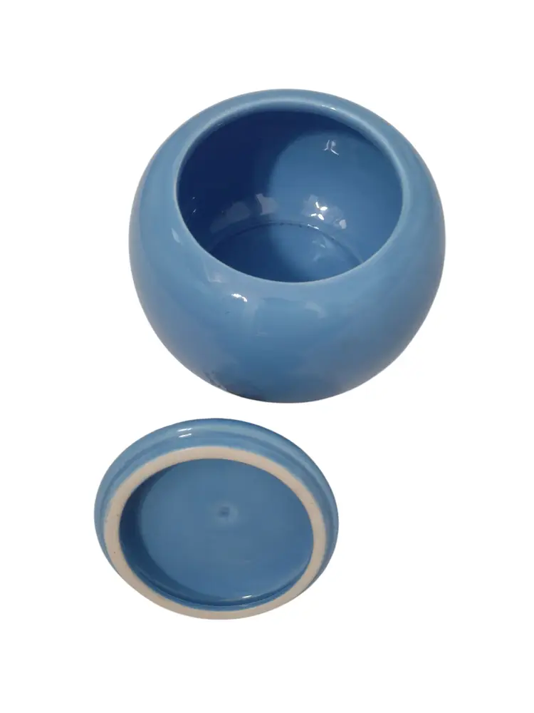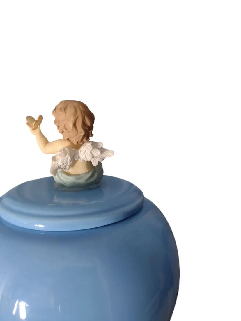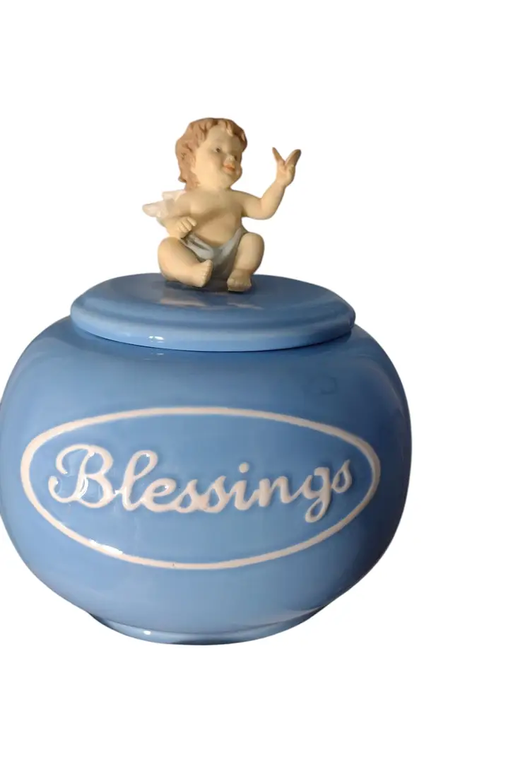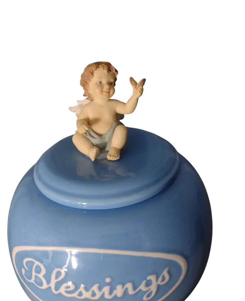 This is an adorable porcelain decorative lidded jar in a sky blue with a 3-D cherub baby. Jar measures 5.5" tall x 5" wide.