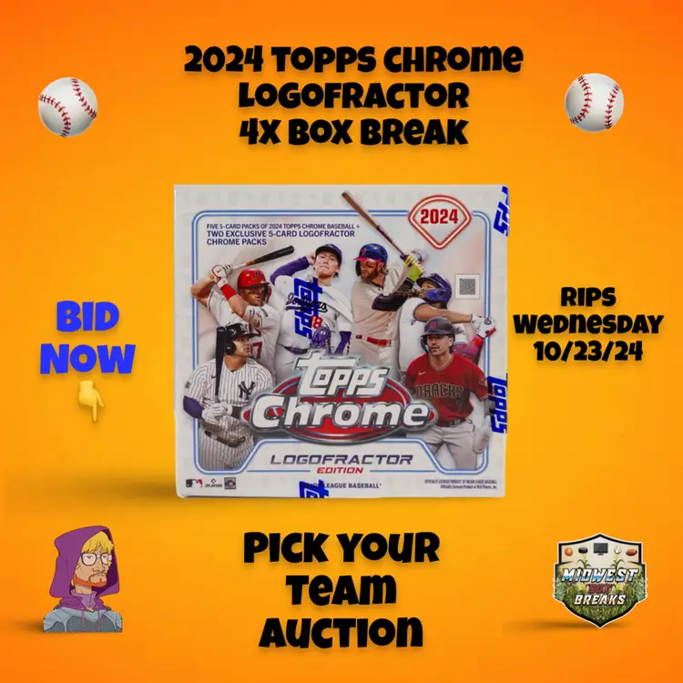You are bidding on all the cards of the team listed in the title in this 2024 Topps Chrome Logofractor 4x Box rip. Rip will happen on the main Midwest Box Breaks District community immediately after all teams end Wednesday, October 23rd at apx 11 PM EST / 8 PM PST. US Shipping is $5 per spot - if you win multiple spots across multiple Districts any shipping overages will be refunded to you after shipping labels are completed. Any spot won where no cards of the team are found in the box will receive a sealed pack of Topps retail product.