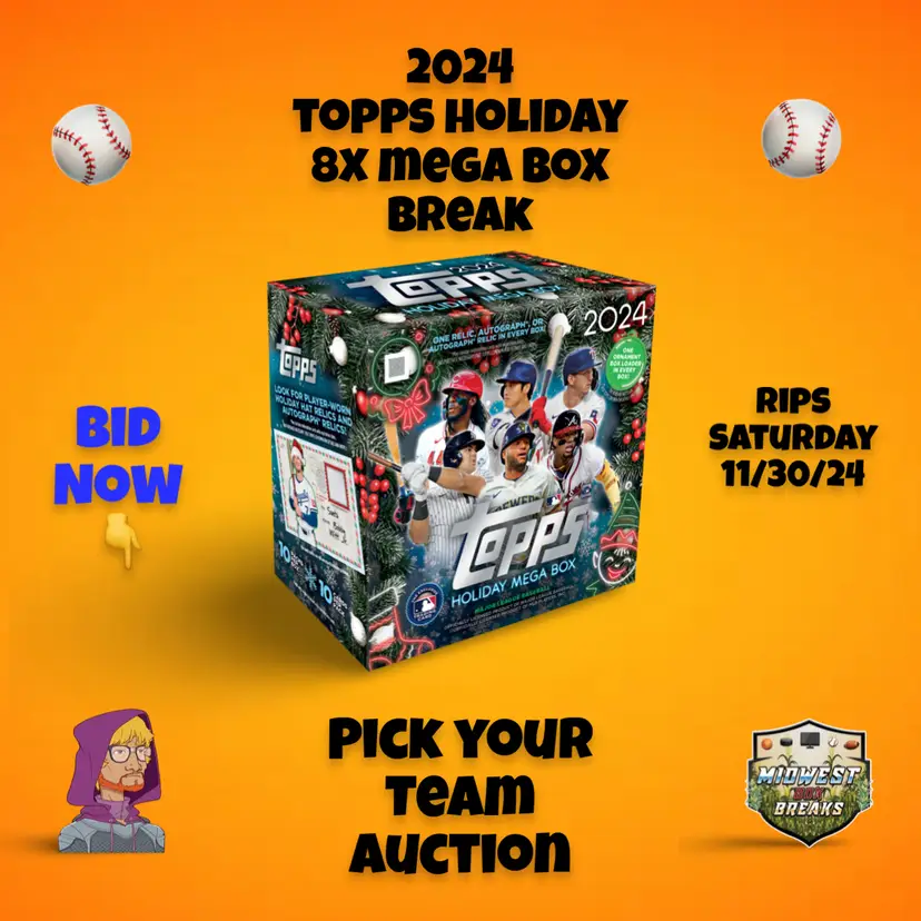 You are bidding on all the cards of the team listed in the title in this 2024 Topps Holiday Baseball Cards Mega Box 8x Box rip. Rip will happen on the main Midwest Box Breaks District community immediately after all teams end Saturday, November 30th at apx 11 PM EST / 8 PM PST. US Shipping is $5 per spot - if you win multiple spots across multiple Districts any shipping overages will be refunded to you after shipping labels are completed. Any spot won where no cards of the team are found in the box will receive a sealed pack of Topps retail product.