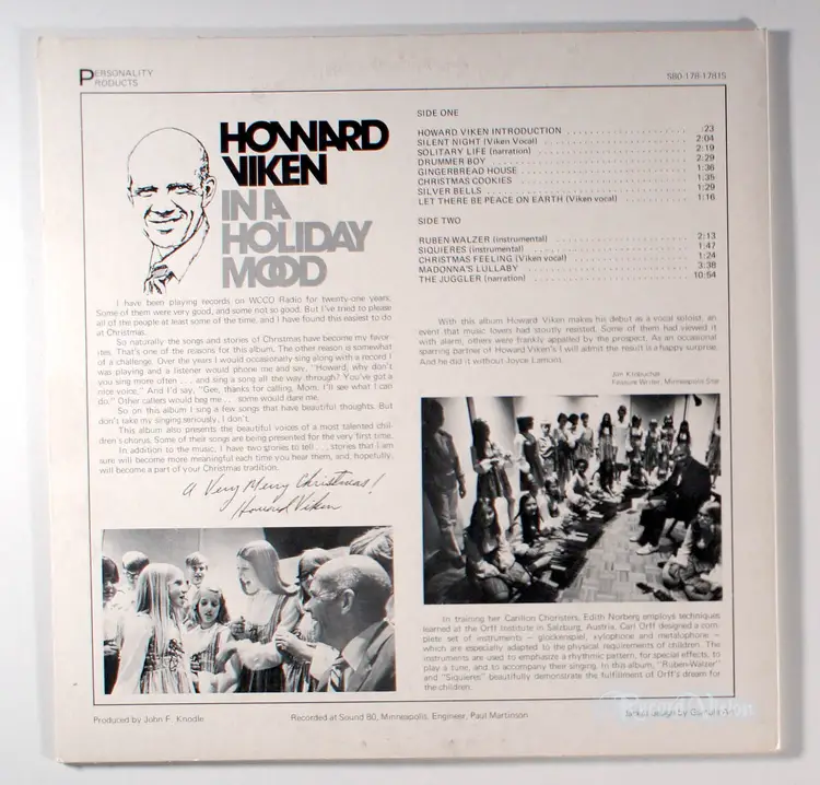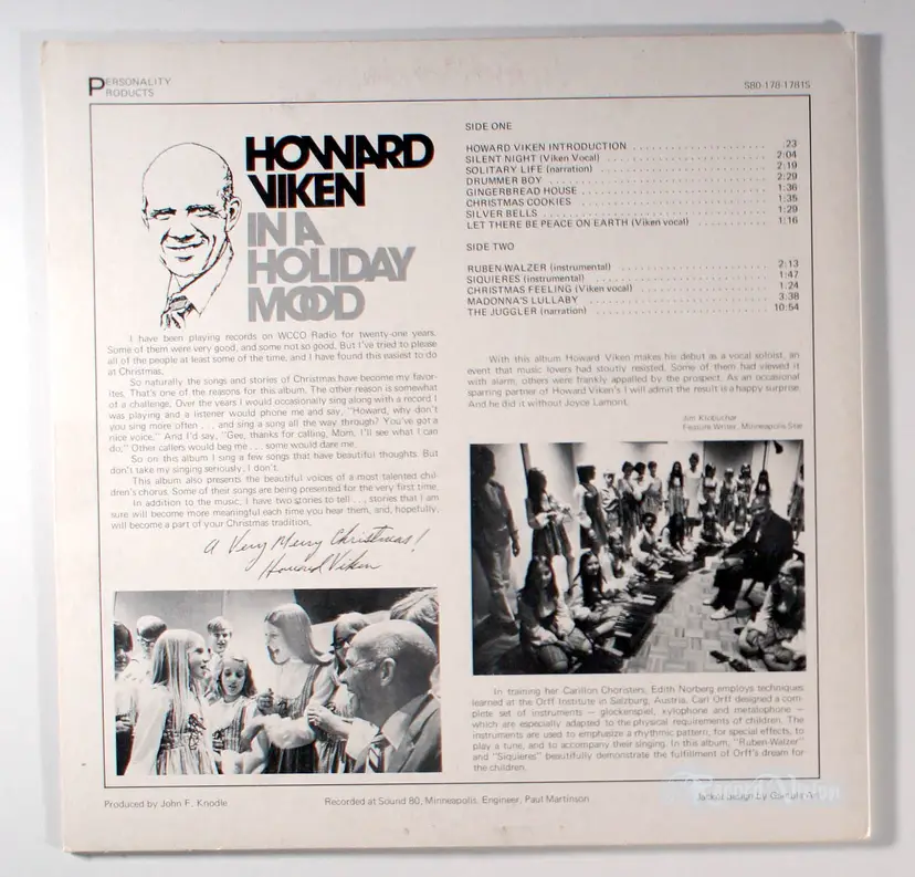 In a Holiday Mood, by Howard Viken, a beloved Minnesota radio personality, is a festive album recorded in 1972, featuring a blend of traditional and unique holiday tracks that evoke nostalgia for listeners, particularly those from 1960s Minnesota. The album, released under Sound 80 Records, showcases Viken's warm vocals and narrations, complemented by the enchanting performances of Edith Norberg's Carillon Choristers, a children's choir that adds a distinctive charm. Tracks like Silent Night, Let There Be Peace On Earth, and Christmas Feeling highlight Viken's vocal contributions, while narrations such as Solitary Life and Gingerbread House offer heartfelt storytelling. Despite its regional release and limited commercial reach, the album holds historical significance as a cultural artifact of Minnesota's broadcasting history, reflecting Viken's influential 39-year career at WCCO Radio. No singles from the album are noted as chart-topping hits, but its unique carols and local appeal make it a cherished collector's item among Christmas music enthusiasts.