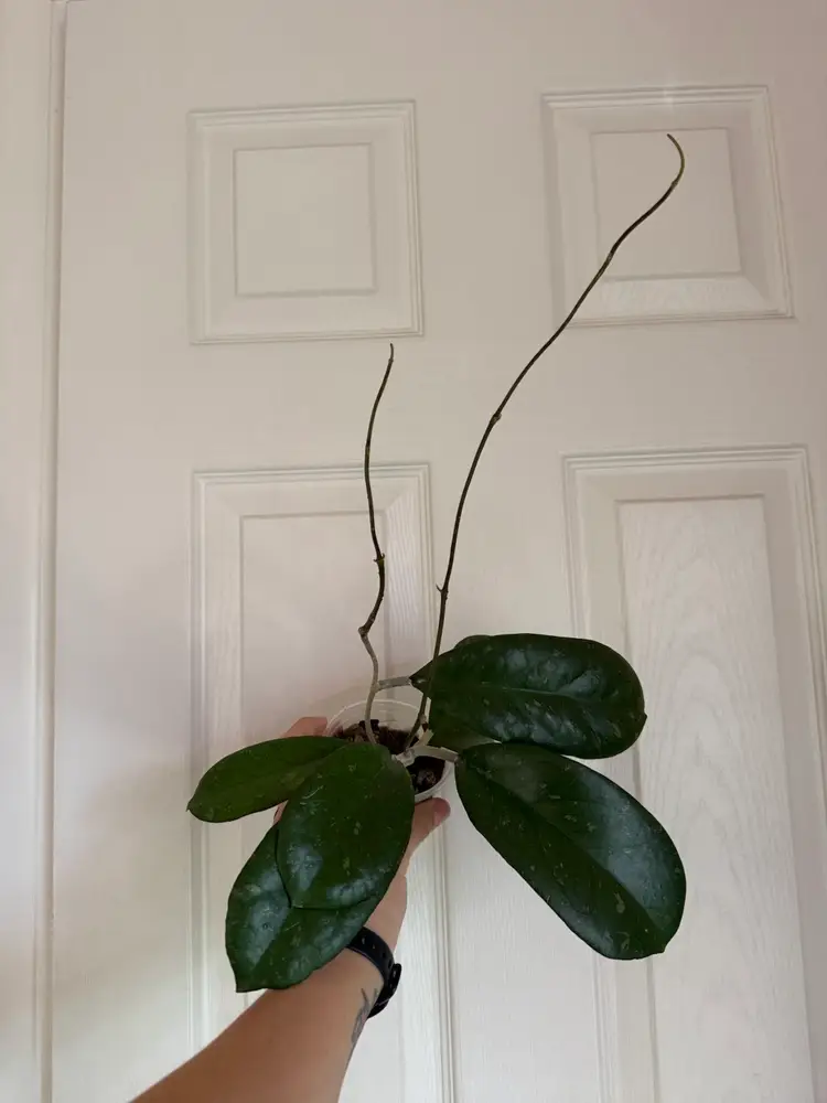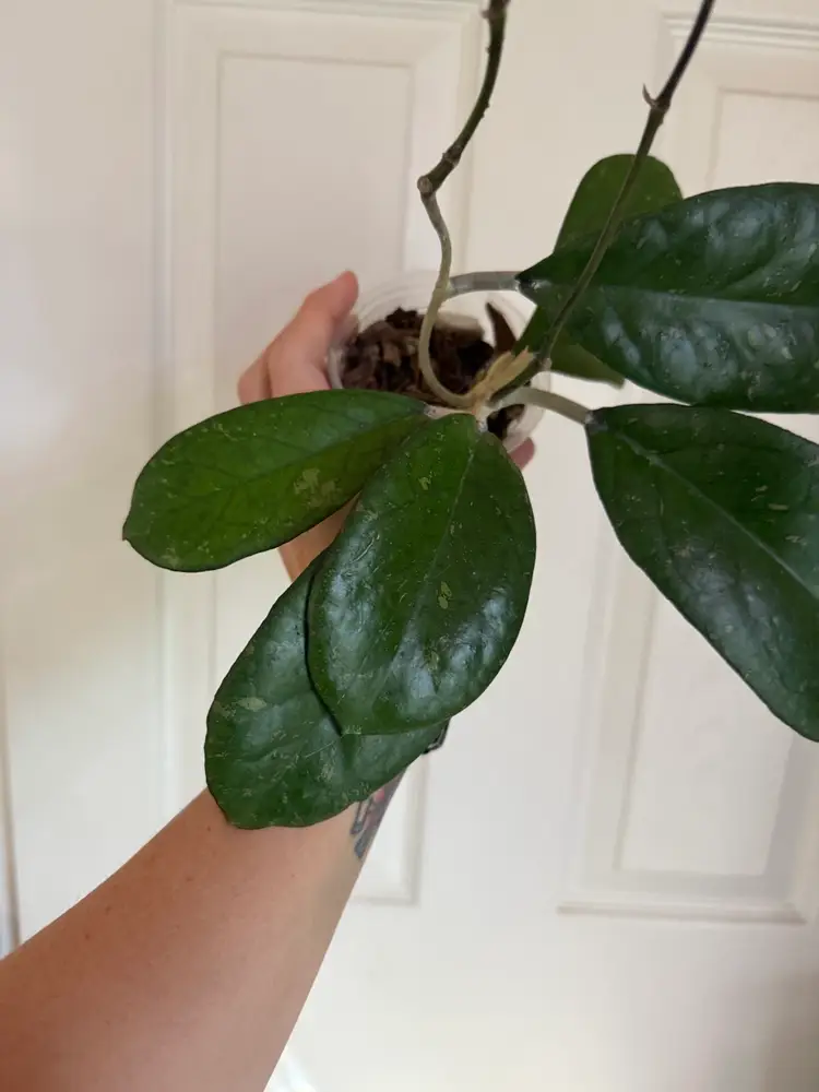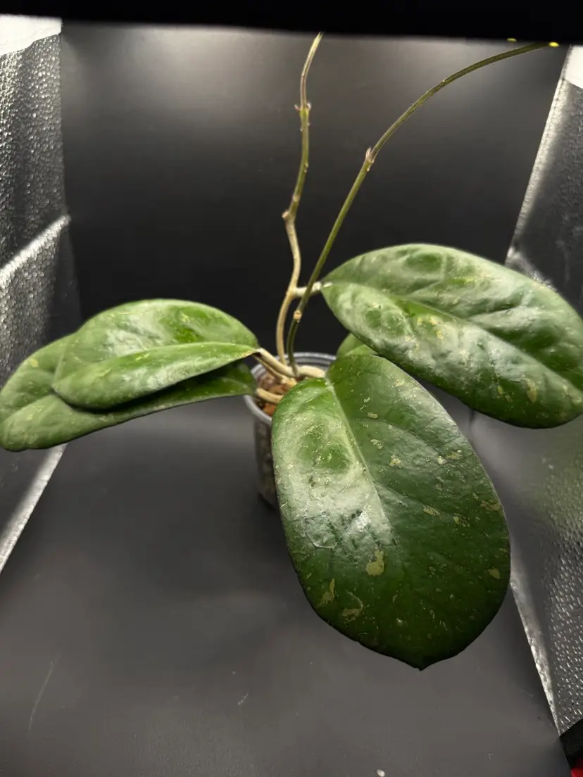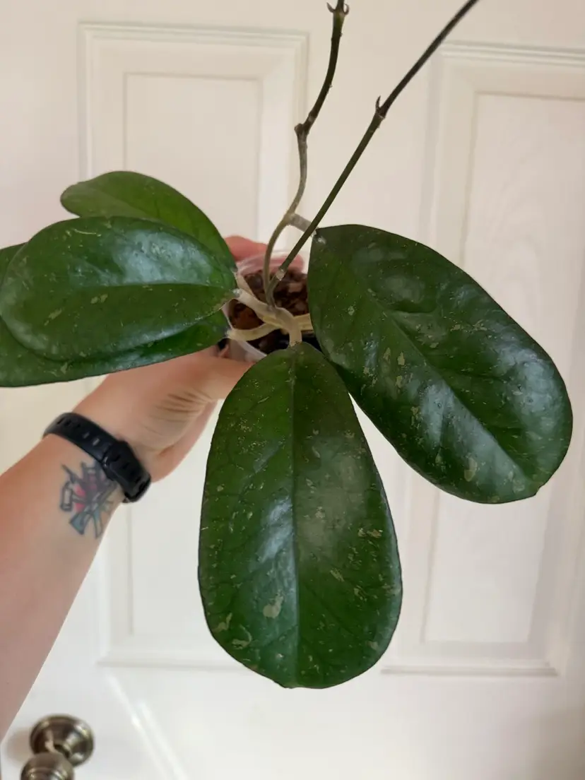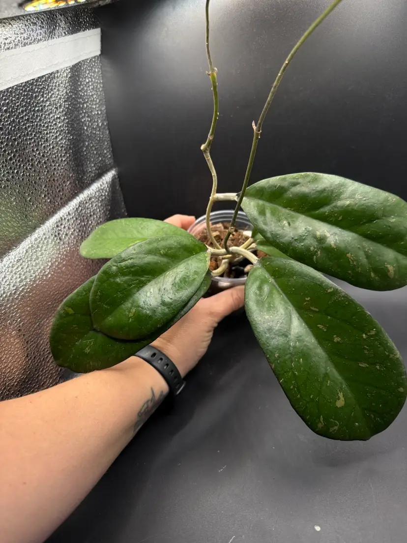 Large pillowy leaves, splash, double runners. Uncomplicated grower. Stunning Hoya!
