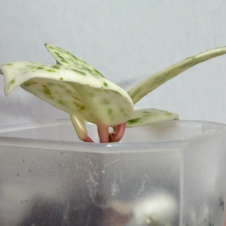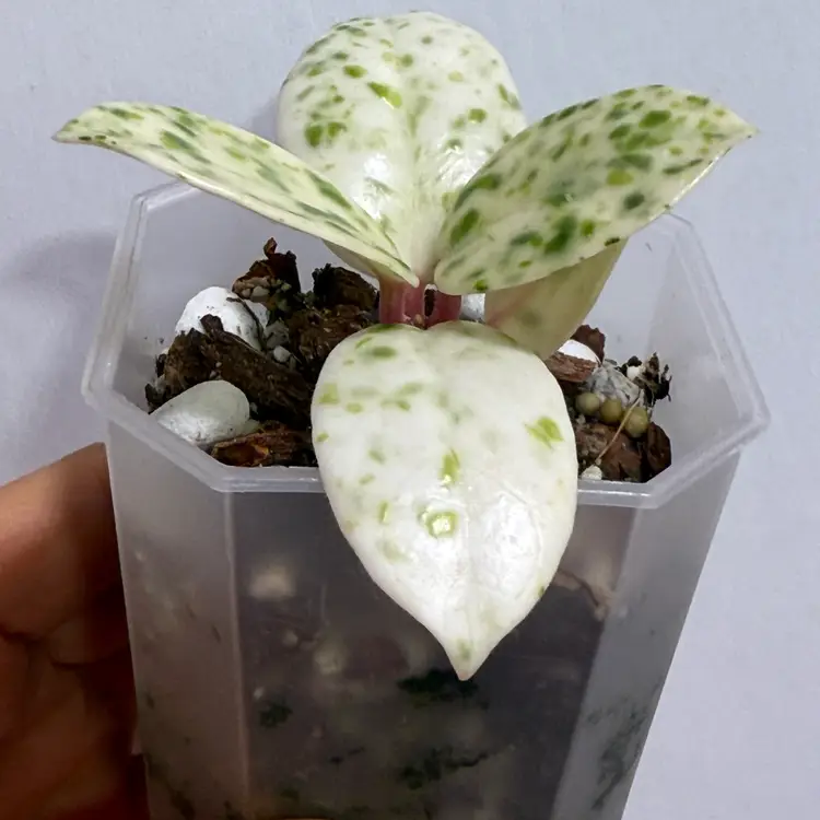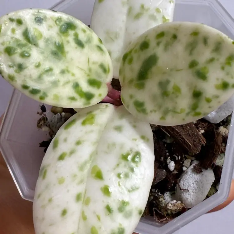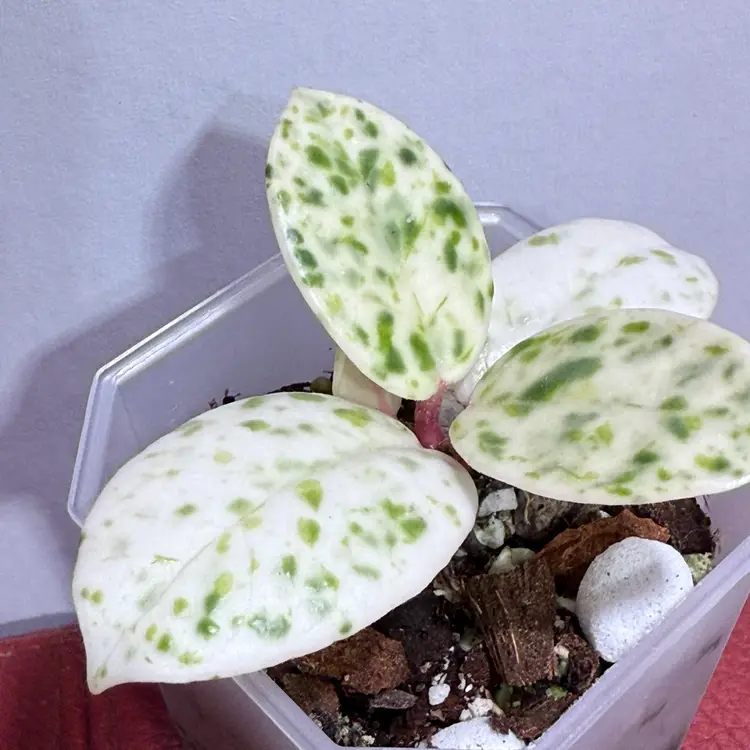 Exceptional unicorn-level variegation on this Hoya Madara ‘Snow Angel’ from Kunzo, Japan. This plant features a stunning white base coloration with speckling in three distinct shades of green, creating a highly unique and collectible pattern.