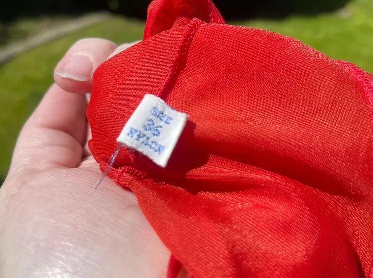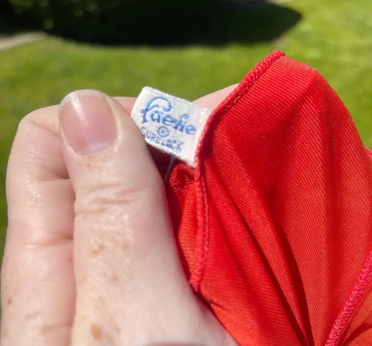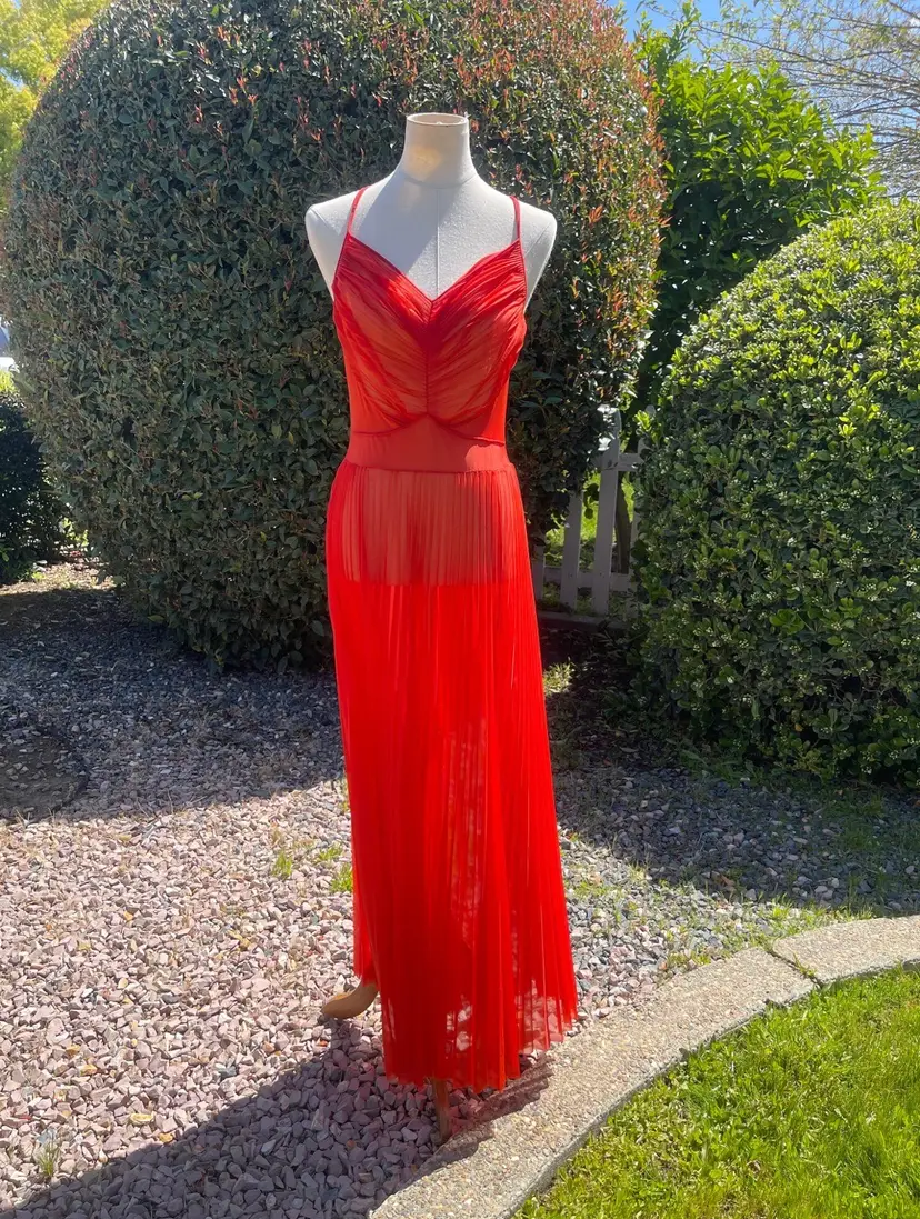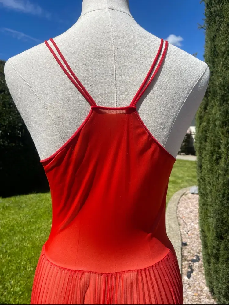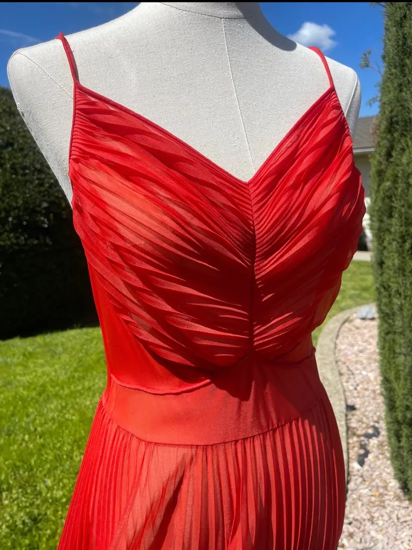 Showstopper sheer red/orange pleated Grecian nightgown Hollywood Regency size 36 which translates to 10/12 This piece is incredibly special! I posted it in an vintage clothing group and everyone went bananas over how lovely it is. I don't believe it's ever been worn. sold in as is vintage condition Bust 36" please see the picture of the cups are pleated so there's room for a range of cup sizes. Waist is 27-36" the hips are free.