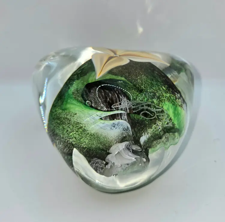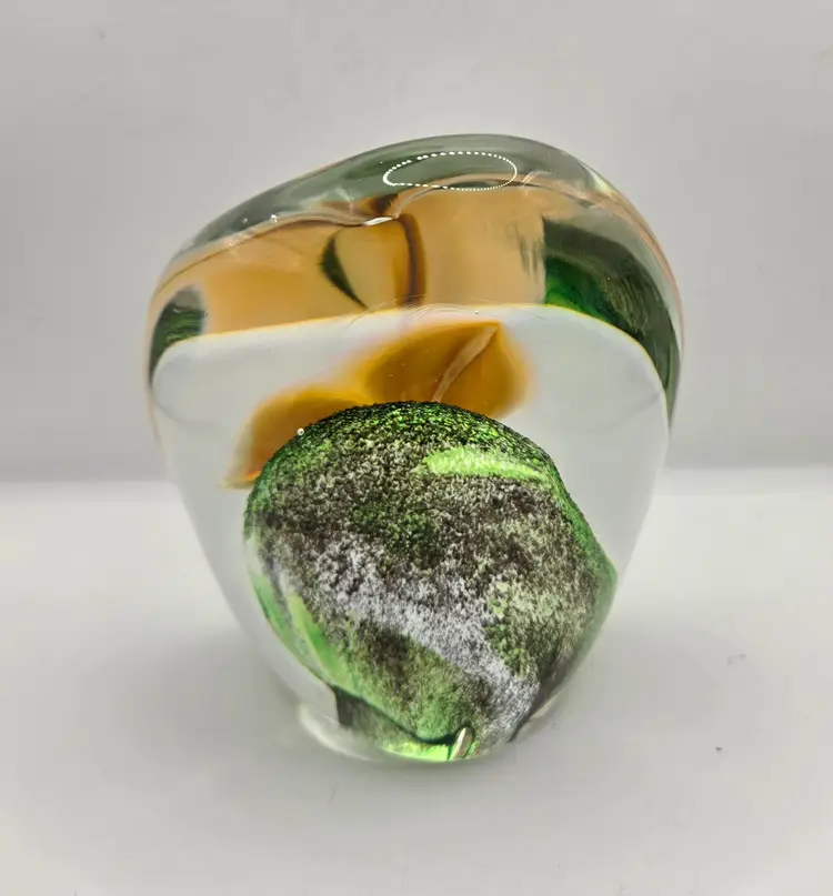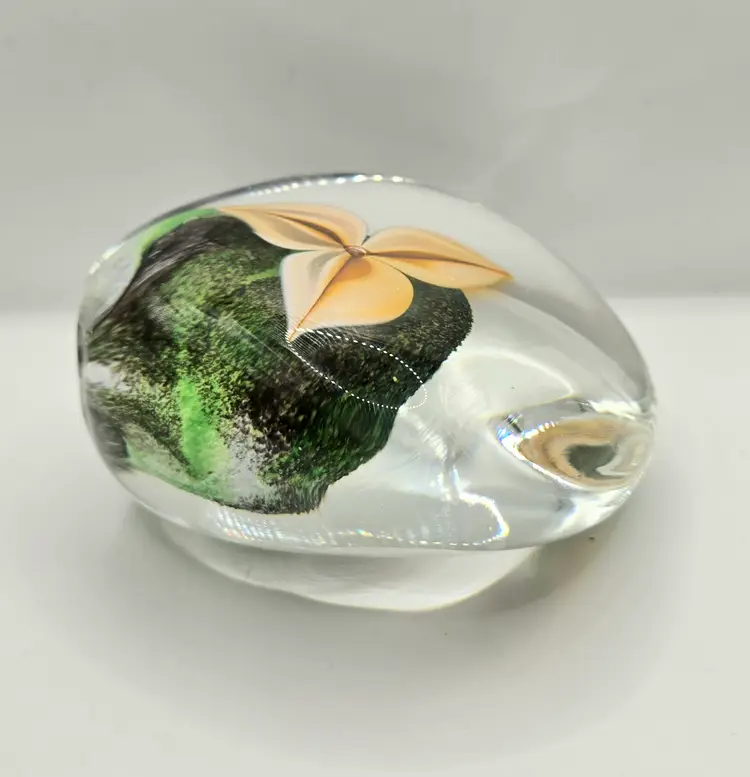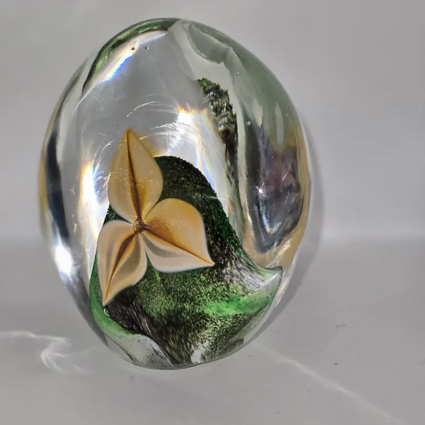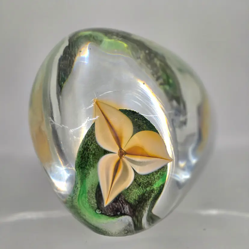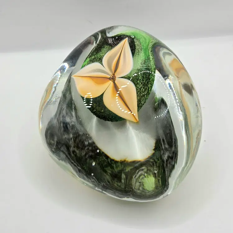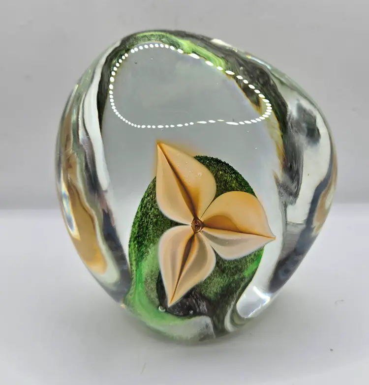 Signed Andrew Kuntz 1999 Paperweight. 4.25" x 4". Gorgeous Trillium flower on colorful rock. Beautiful vibrant colours. No chips, cracks, bruises or scratches. Please see photos as they are part of the description. There are tiny internal bubbles in paperweight plus two tiny, smooth, popped bubbles that occurred during the creation of the piece. No wavy lines...it is my lights doing that. This paperweight is stunning. Item will be well wrapped before shipping. (During Canada postal strike I'm shipping with a cross border shipper. Item will be delivered by USPS)