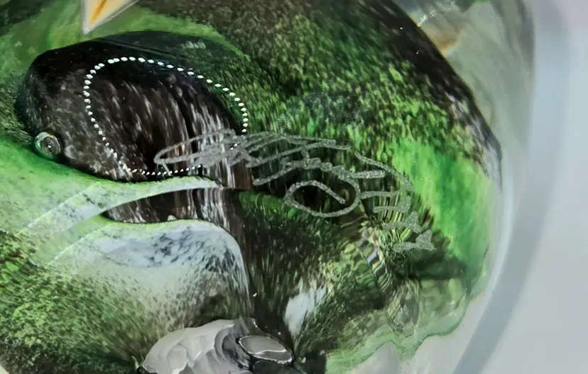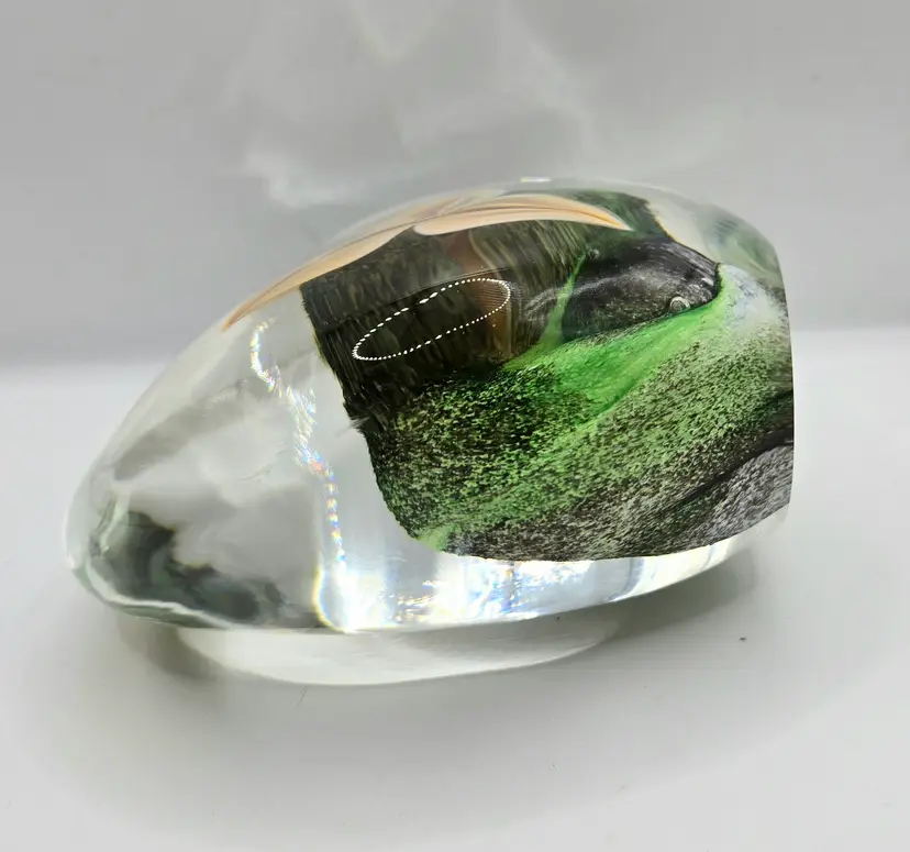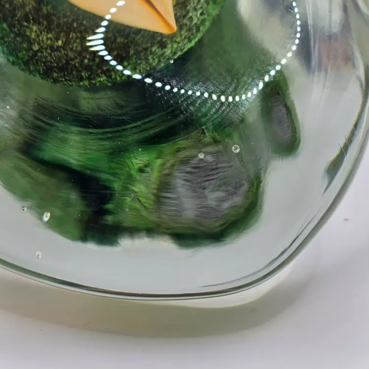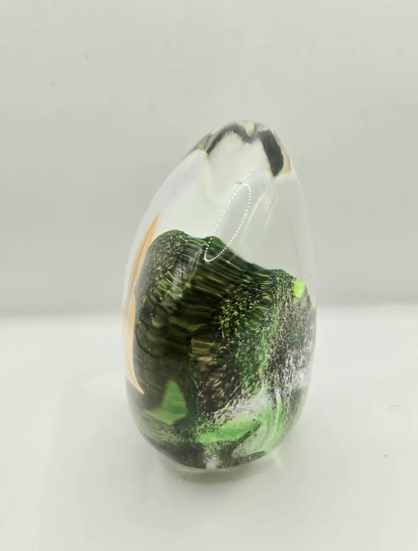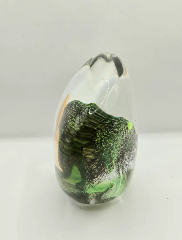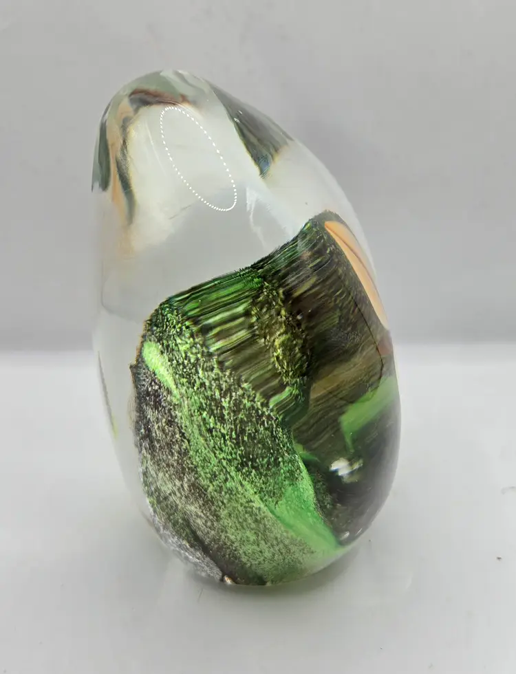 Signed Andrew Kuntz 1999 Paperweight. 4.25" x 4". Gorgeous Trillium flower on colorful rock. Beautiful vibrant colours. No chips, cracks, bruises or scratches. Please see photos as they are part of the description. There are tiny internal bubbles in paperweight plus two tiny, smooth, popped bubbles that occurred during the creation of the piece. No wavy lines...it is my lights doing that. This paperweight is stunning. Item will be well wrapped before shipping. (During Canada postal strike I'm shipping with a cross border shipper. Item will be delivered by USPS)