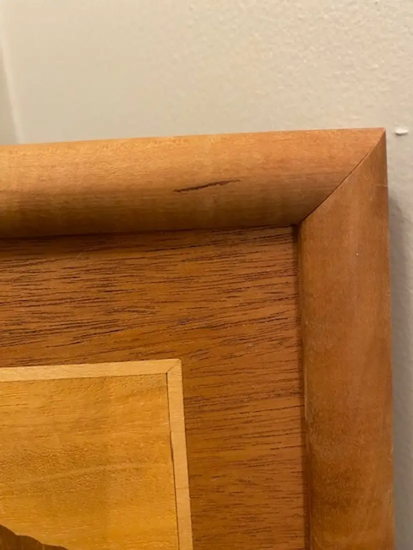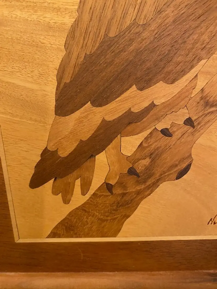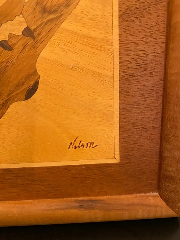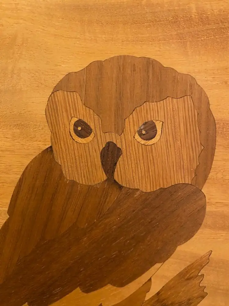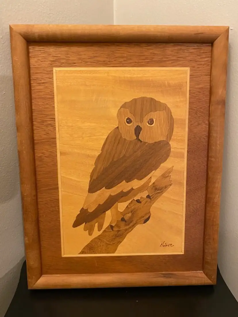 Unique framed wood art owl made by artist Jeff Nelson. Framed art measures 9-1/2" x 12-1/2". Please see photos for condition.