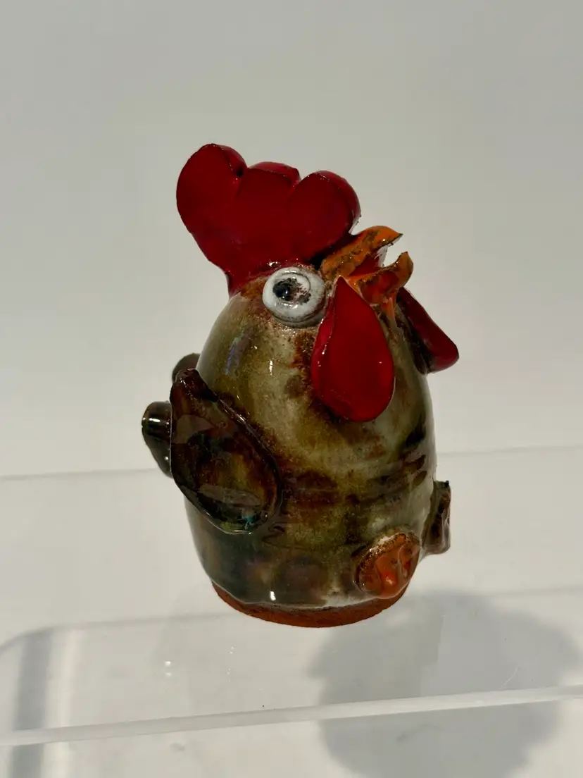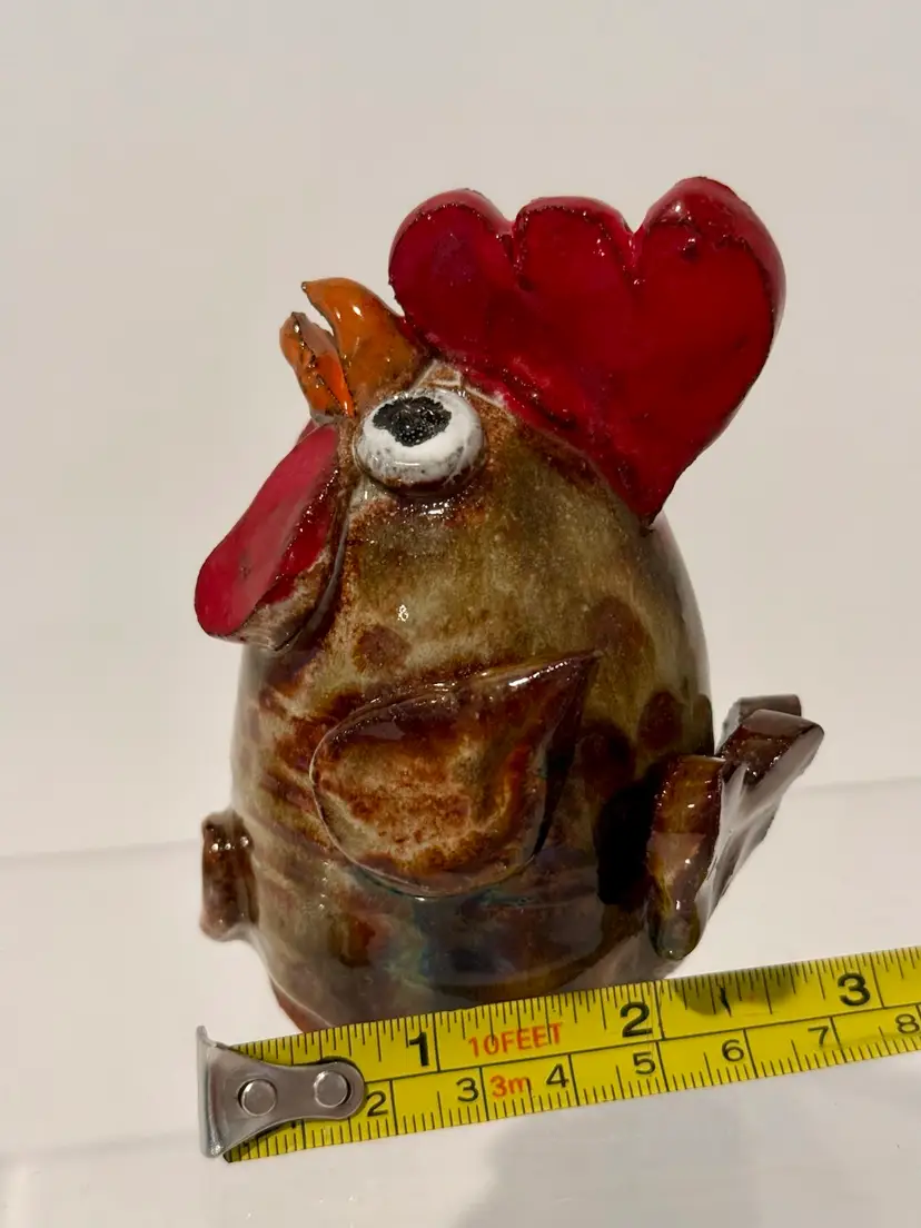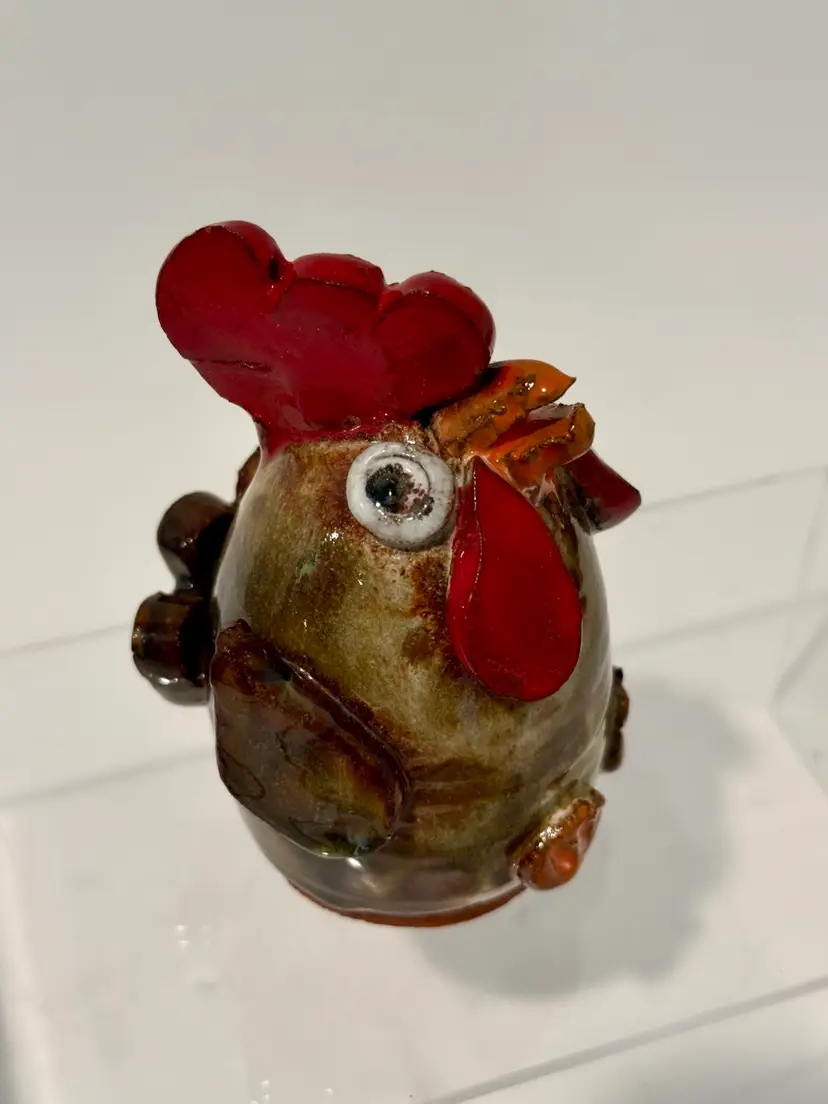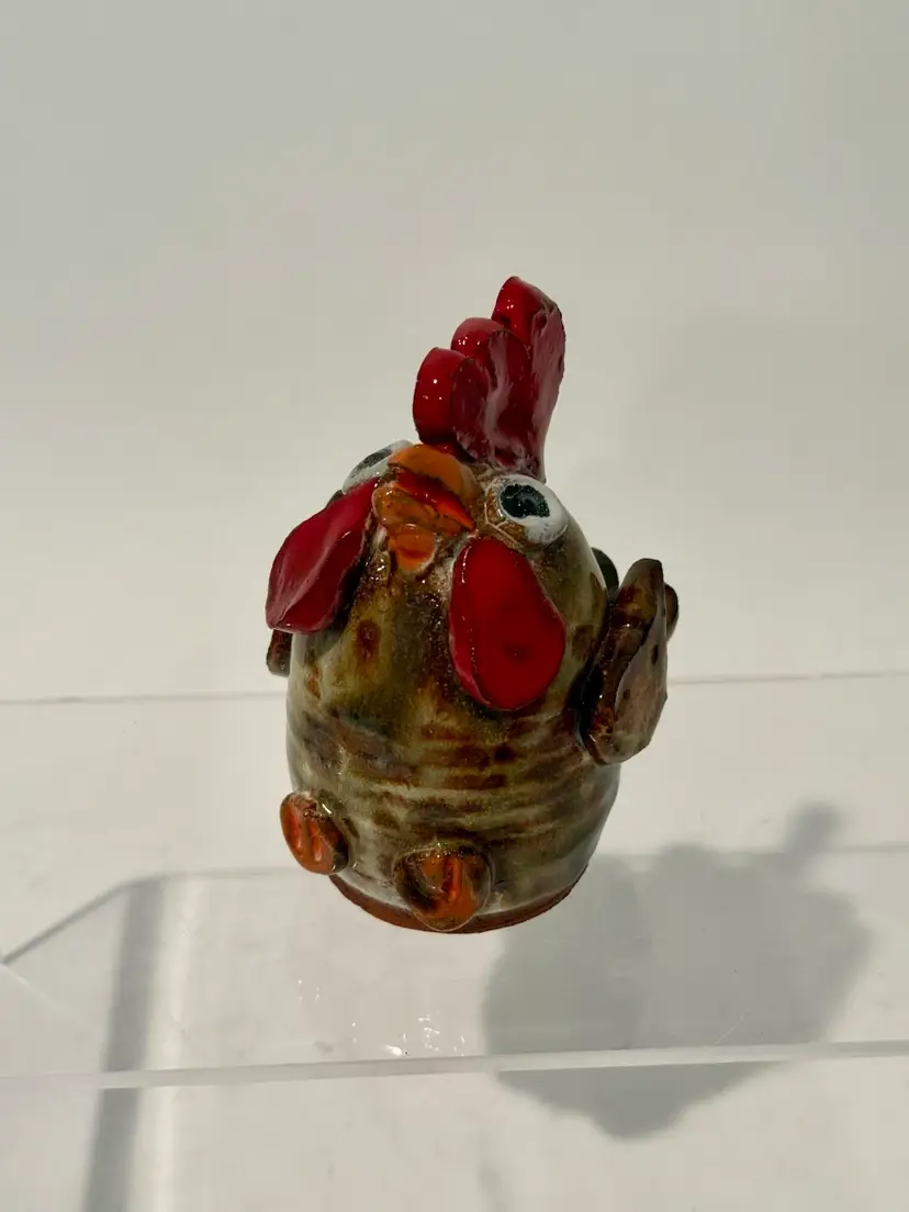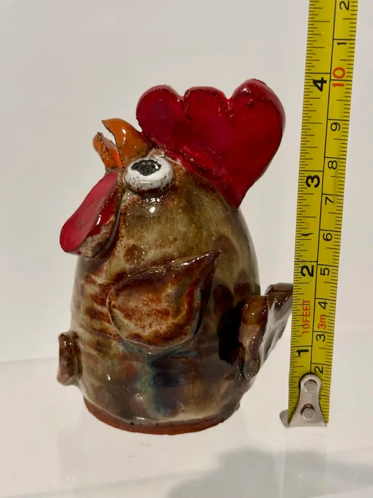 This Huey and Anne Wheeler pottery figurine is a unique addition to any collection. With a red rooster design, this figurine is perfect for those who appreciate southern folk art. Made in Georgia, this figurine is perfect for decoration and is sure to add a touch of art to any room.