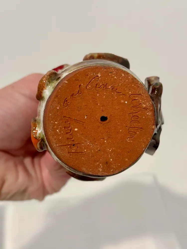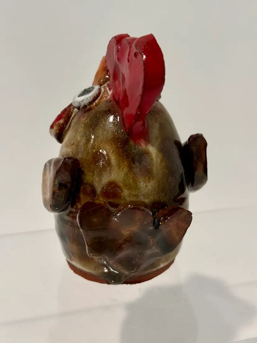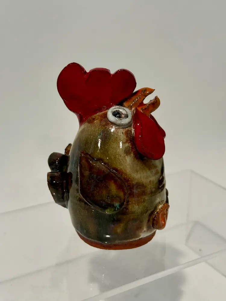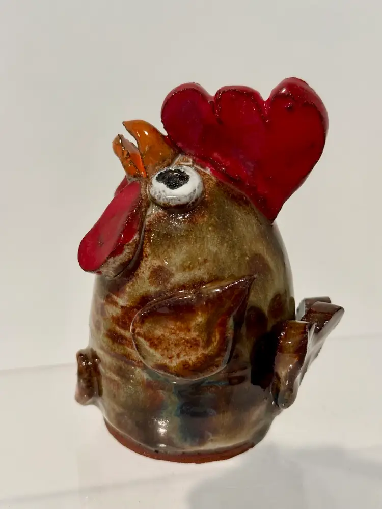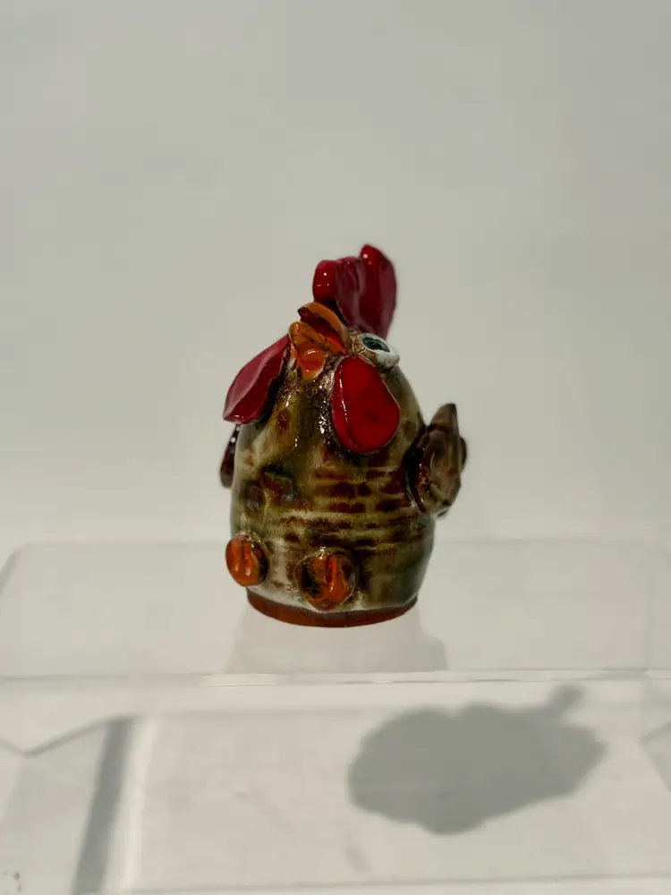 This Huey and Anne Wheeler pottery figurine is a unique addition to any collection. With a red rooster design, this figurine is perfect for those who appreciate southern folk art. Made in Georgia, this figurine is perfect for decoration and is sure to add a touch of art to any room.