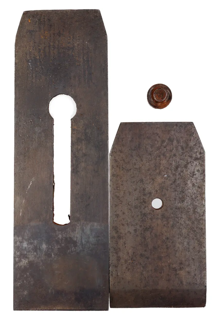 A huge antique 2-1/2" wide thick tapered double iron for wooden fore and jointer planes. It has been given a brand new bevel that is square to the body. The face will still need prepped and it will need honed for use. If it had a maker's mark on it, it is no longer visible. Just under 8" long.