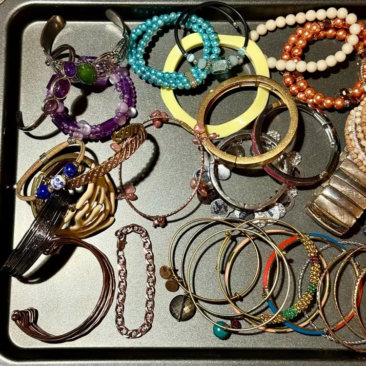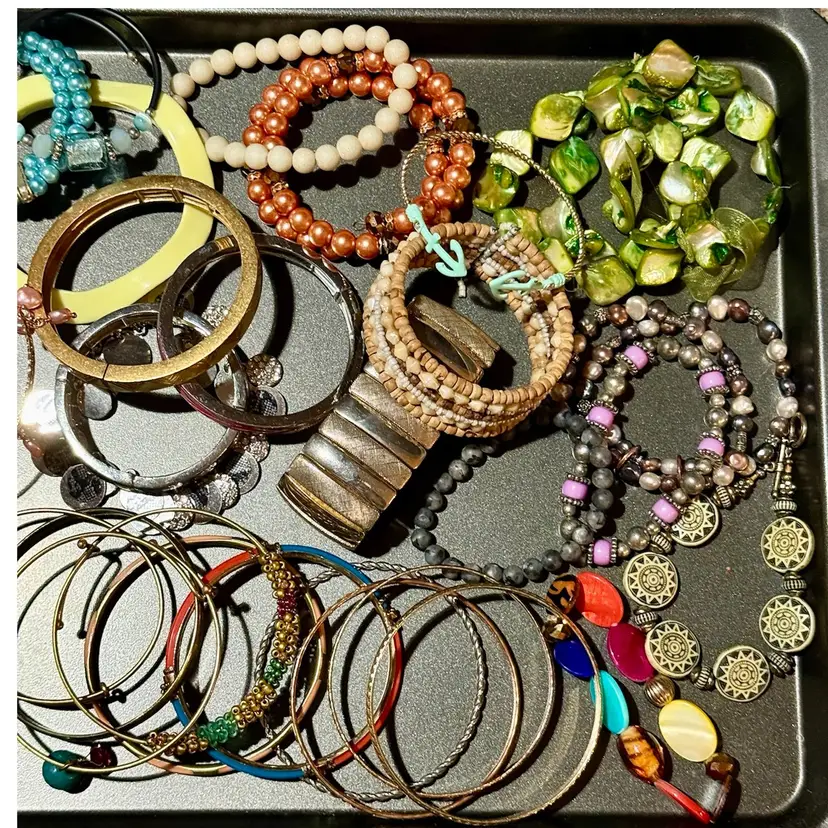 38 total pieces! Huge. Variety of styles — cuffs/stretch/bangles/clampers/etc, made of stone/glass/metal/wood/shell/etc!