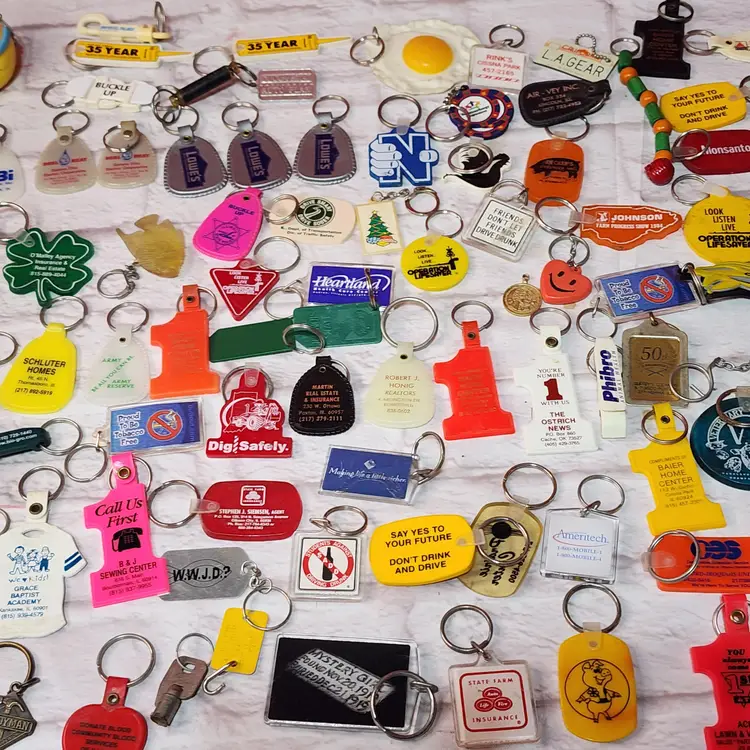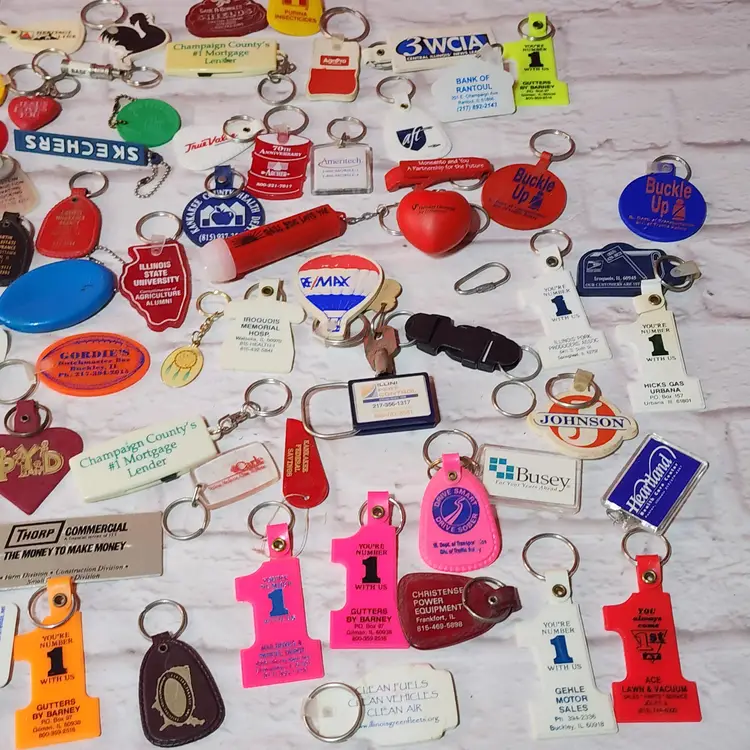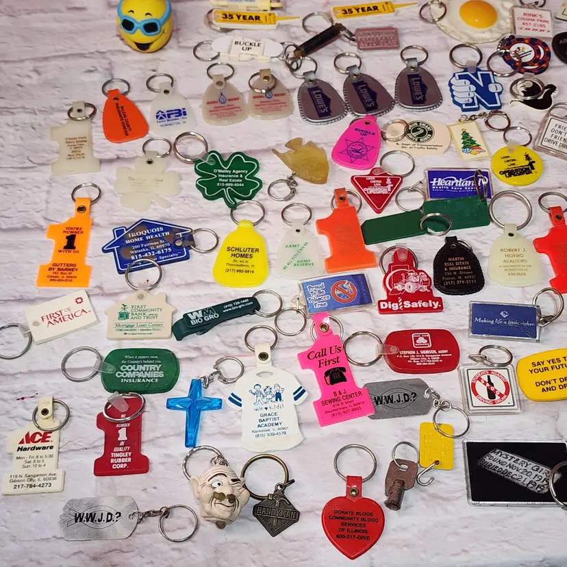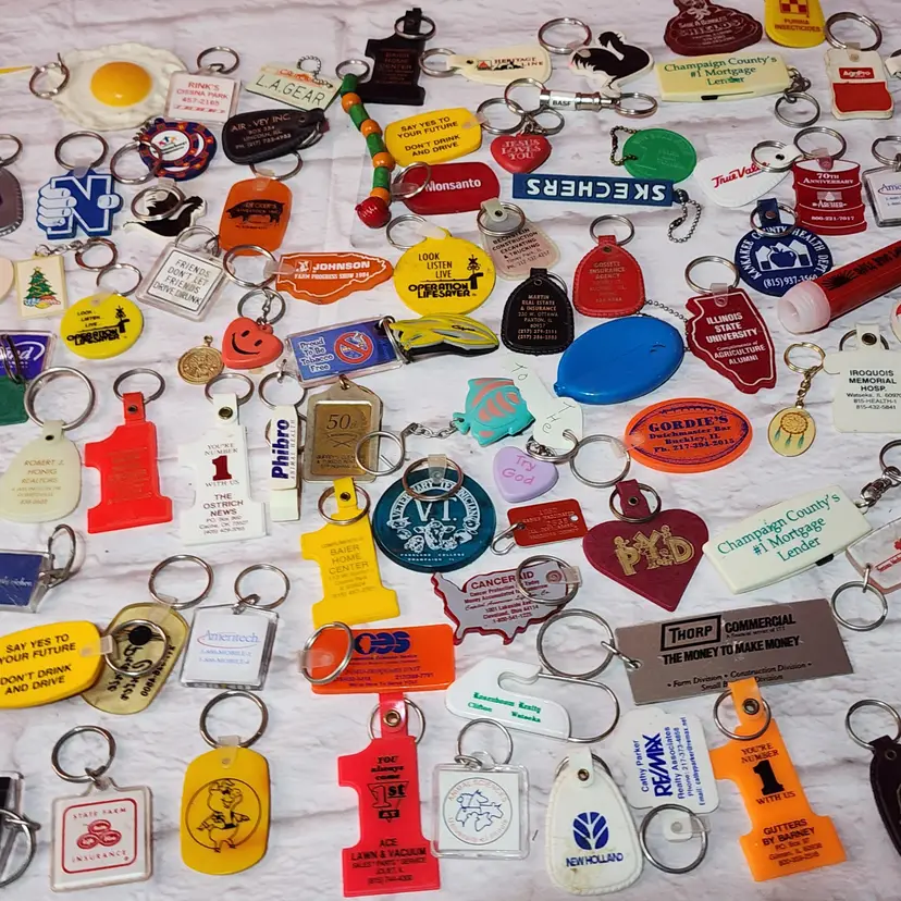 143 vintage Keychains. Most are from Eastern Illinois businesses.