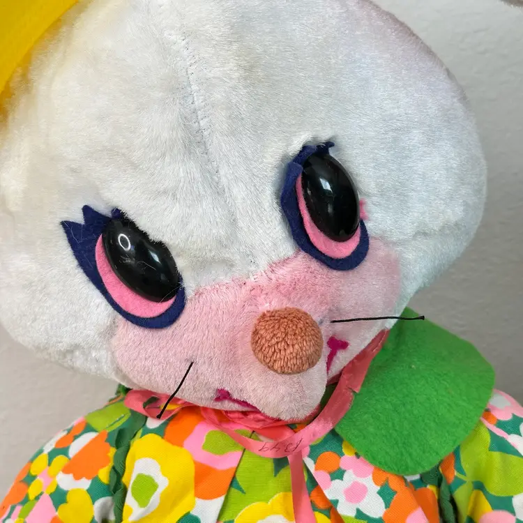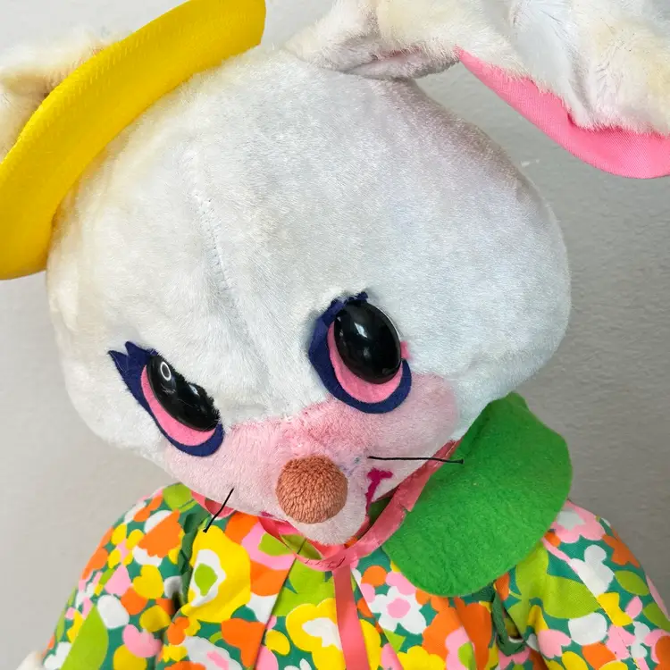From a 60’s estate sale - rare find - believed to be a store window display piece. Has a Rare mister out there somewhere too! See pics for condition and size - she’s huge and so cute and really nicely kept with original hat. This vintage Knickerbocker store display bunny rabbit plush toy promo ad is over 2ft tall and part of the Animals of Distinction character family. Made in the United States, this large plush toy appeals to a wide age range, from infants to adults, making it a unique and charming addition to any toy collection. With its nostalgic appeal and large size, this toy is sure to bring joy and whimsy to anyone who owns it.