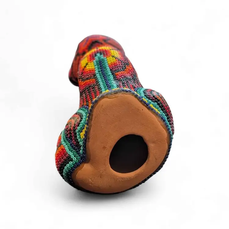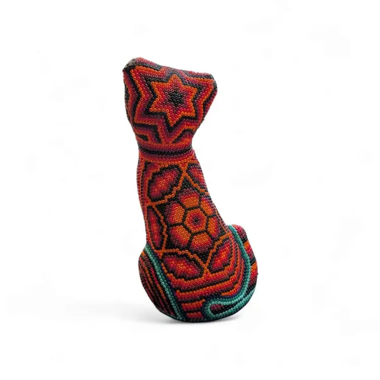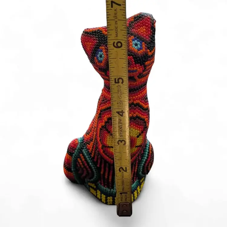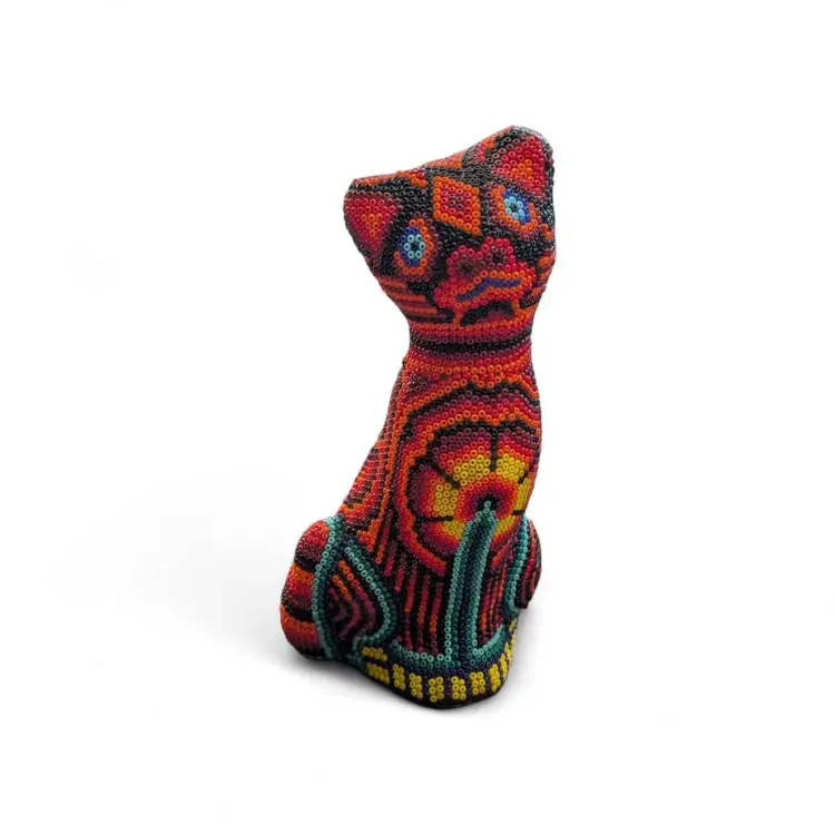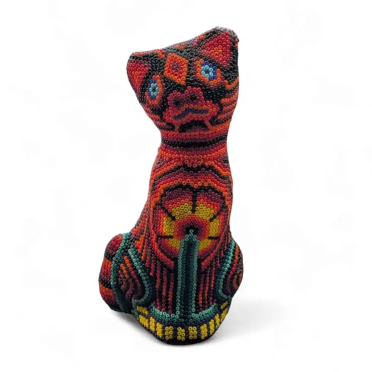 Huichol Beaded Cat Figurine Handmade Mexican Folk Art Kitty Kitten Sculpture. This is an awesome beaded cat figurine - it has gorgeous vibrant colors and design. This appears to be made out of terracotta with the beads glued to the surface. Overall excellent condition - stands about 6.5" tall.