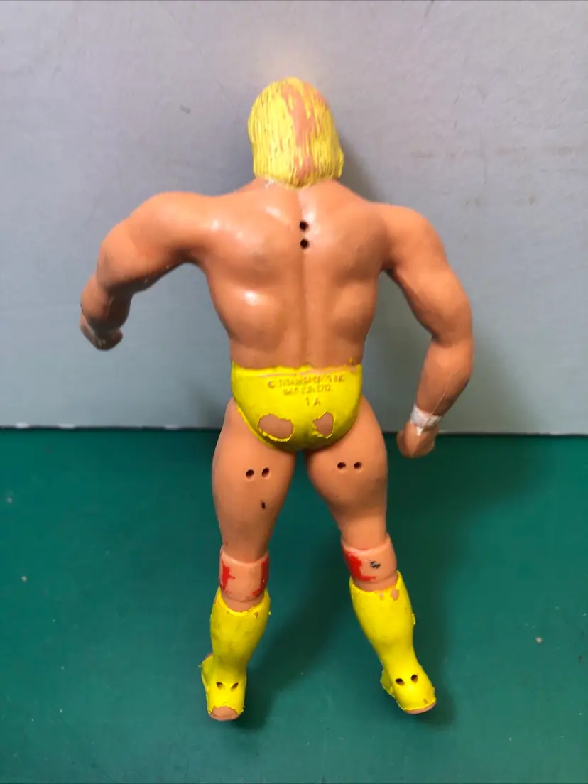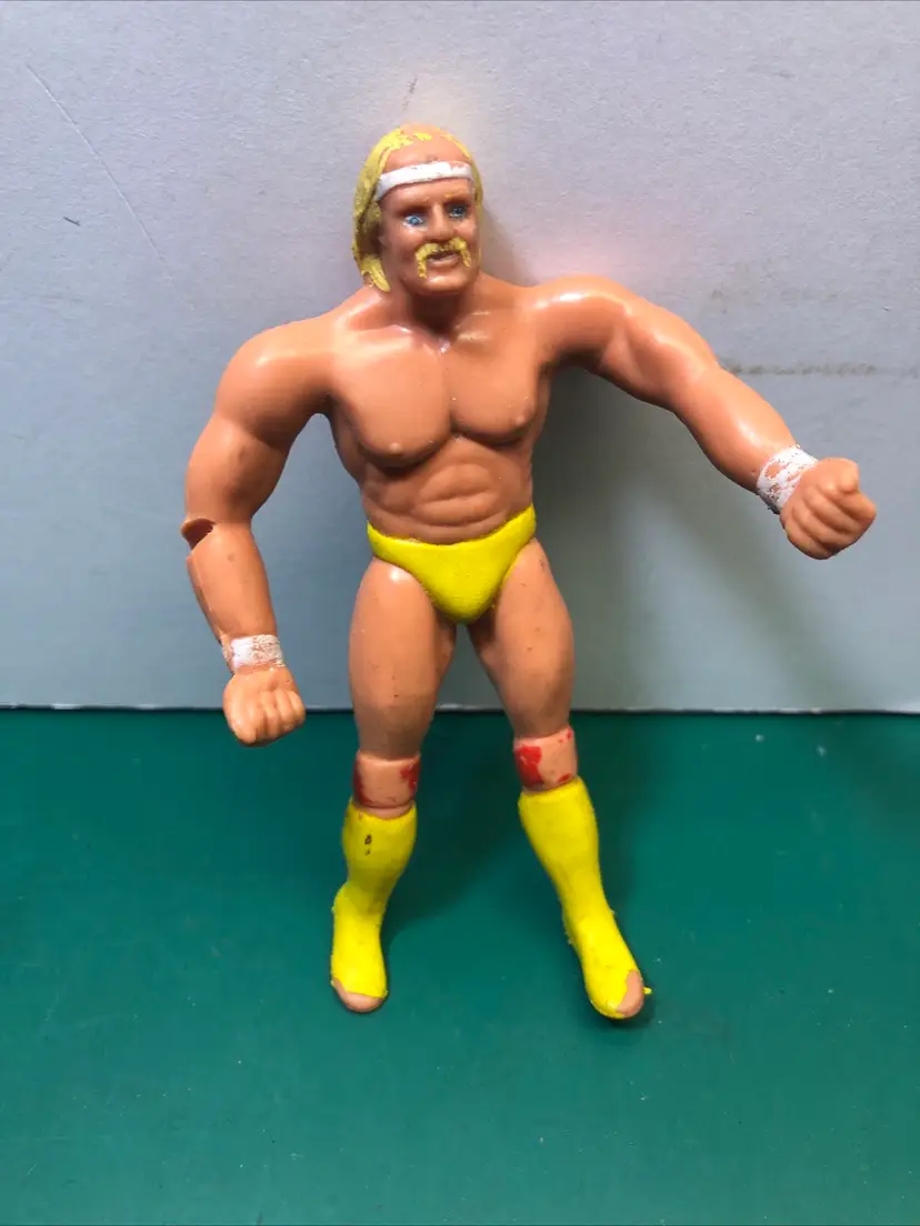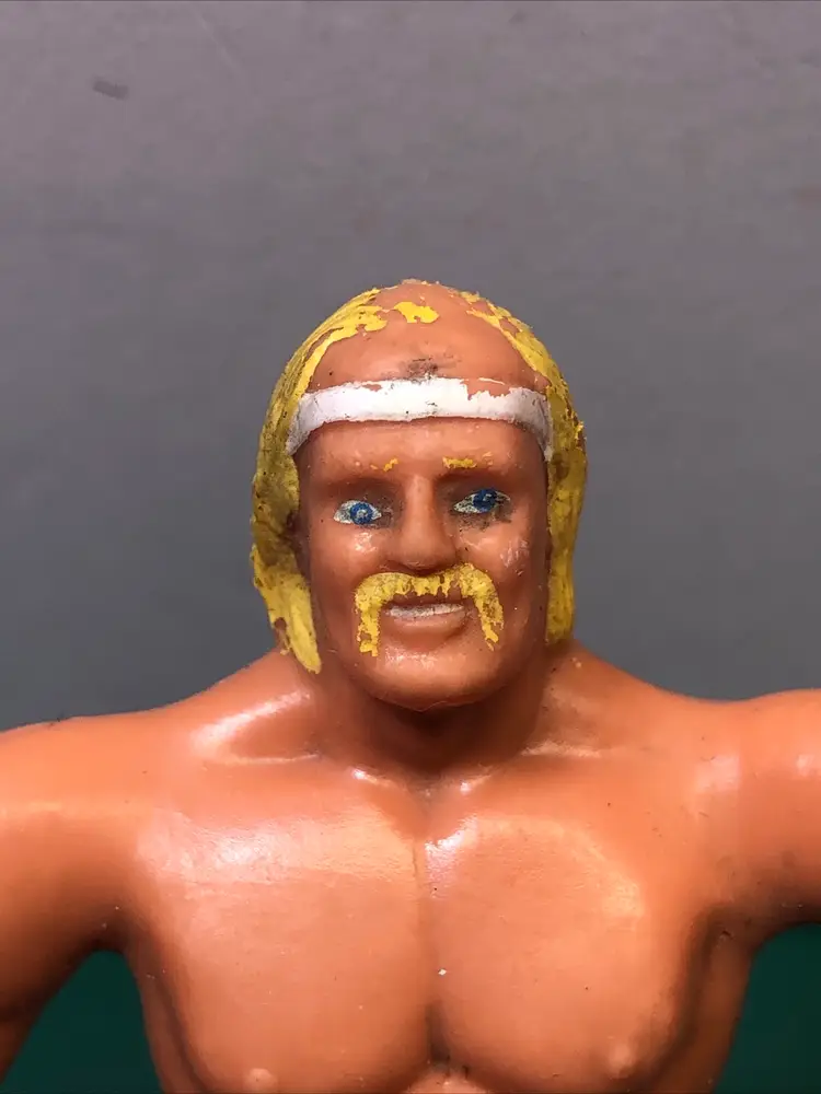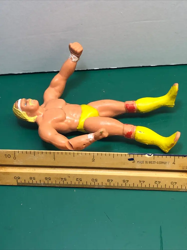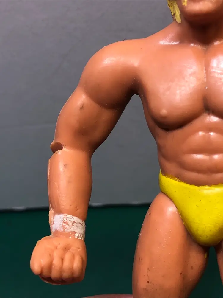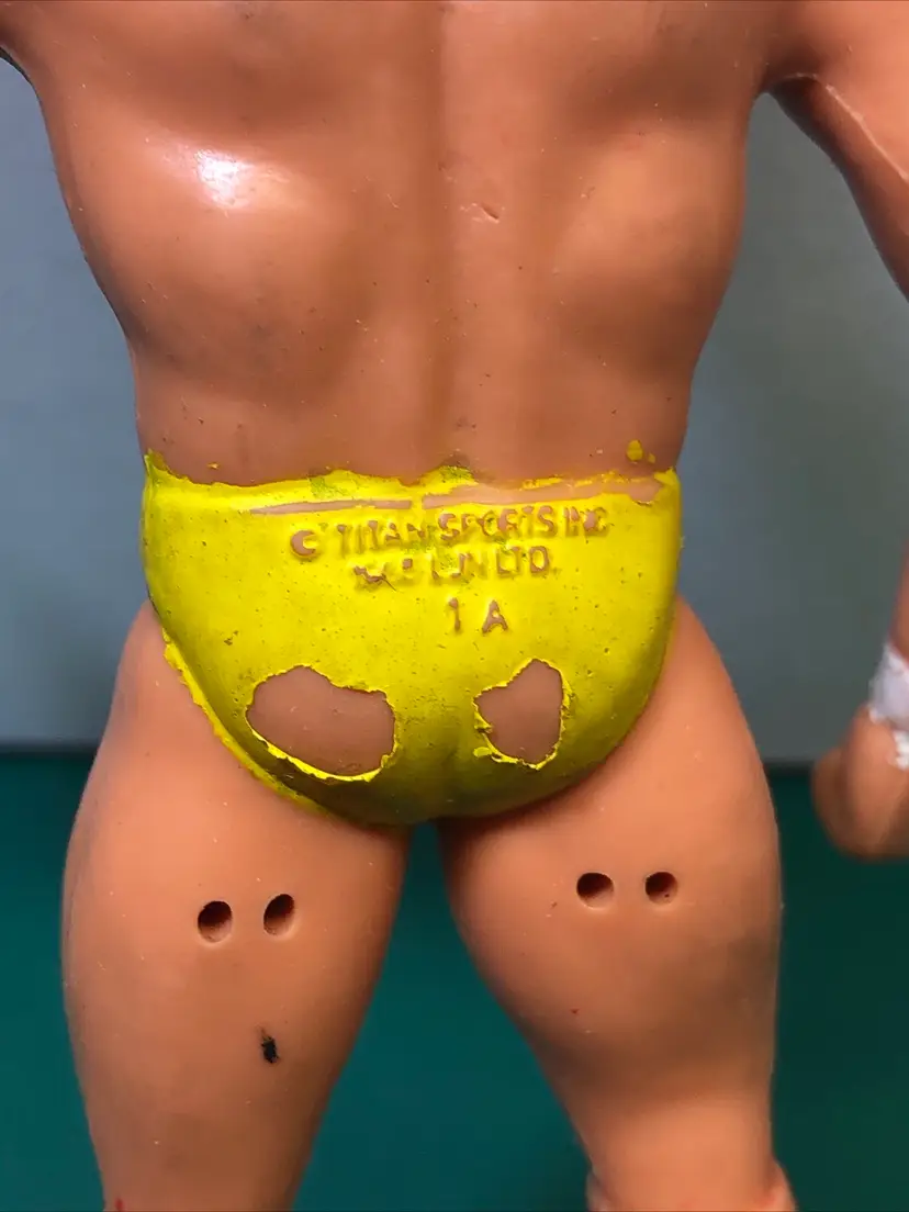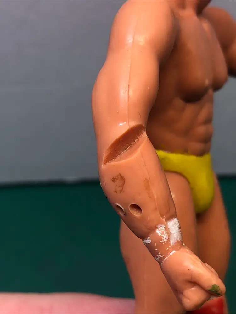 4 inch figure with wear. Has missing paint and wear on rubber. The right arm has a tear in rubber and should be handled with care. Titan Sports. Cool 1980’s toy.