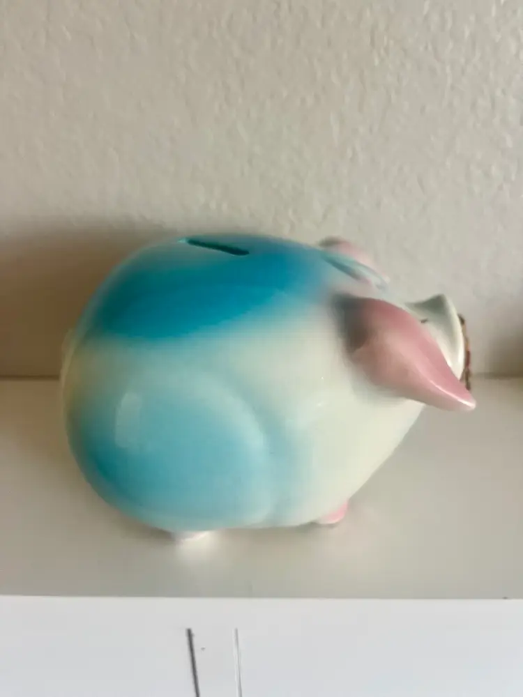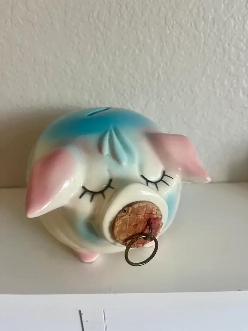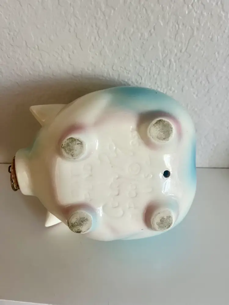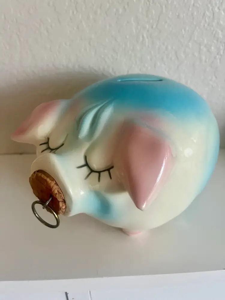 Vintage 1957 Hull Pottery CORKY PIG Piggy Bank. Blue with pink ears. Very nice vintage condition. Has original cork with slight damage. No chips cracks.