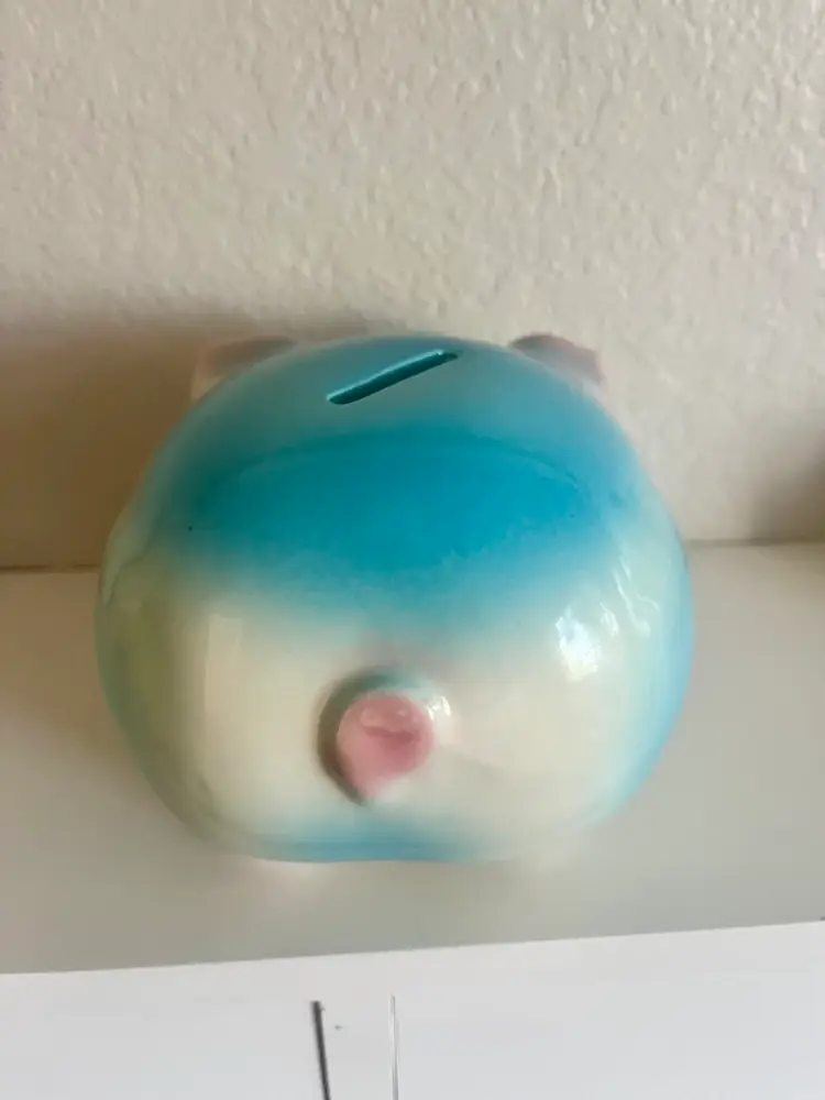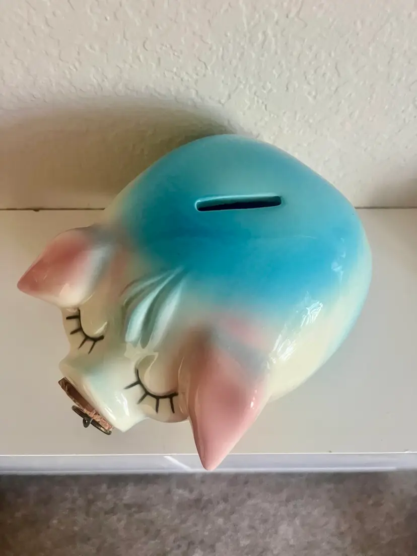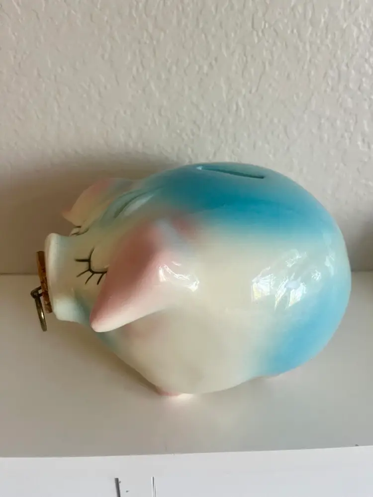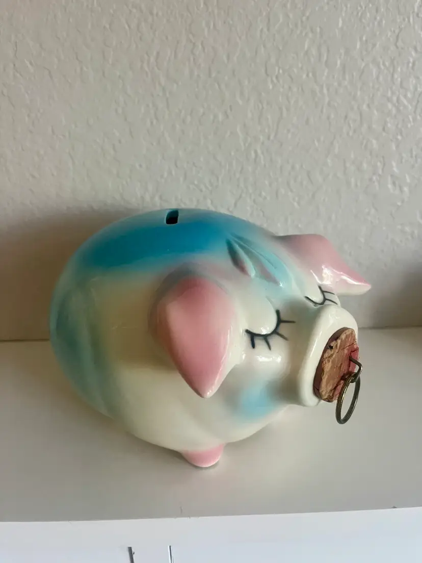 Vintage 1957 Hull Pottery CORKY PIG Piggy Bank. Blue with pink ears. Very nice vintage condition. Has original cork with slight damage. No chips cracks.