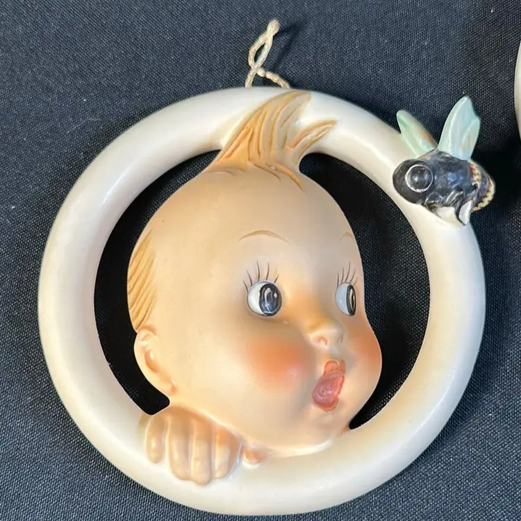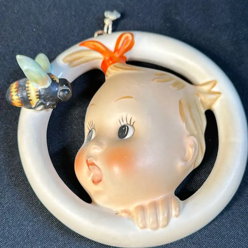 Adorable crown marked Hummel Ba-Bee rings wall hangings. Each ring features an adorable child with a bee. Both are marked on back with the crown and engraved M.J. Hummel. The little boy is numbered 30/0A he is in excellent condition no chips, cracks or crazing. The little girl is numbered 30/0B she has very faint crazing on her head, around her eye and cheek. They measure approximately 5” long x 5” wide x .25” high