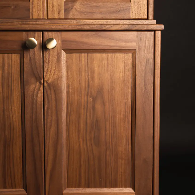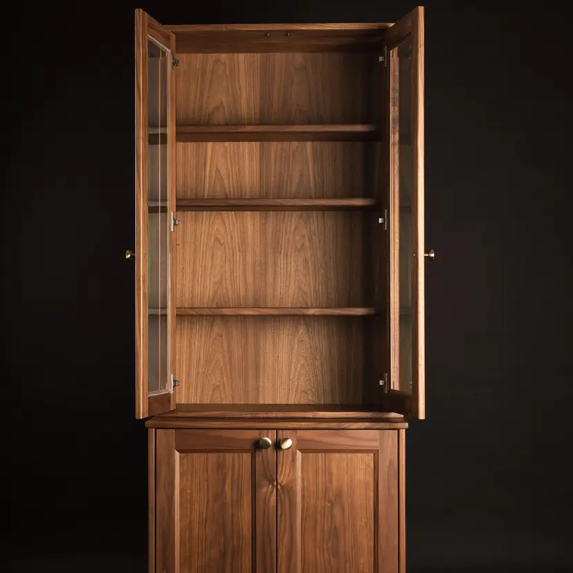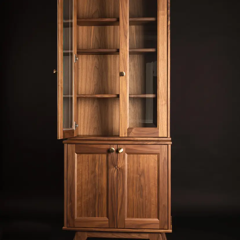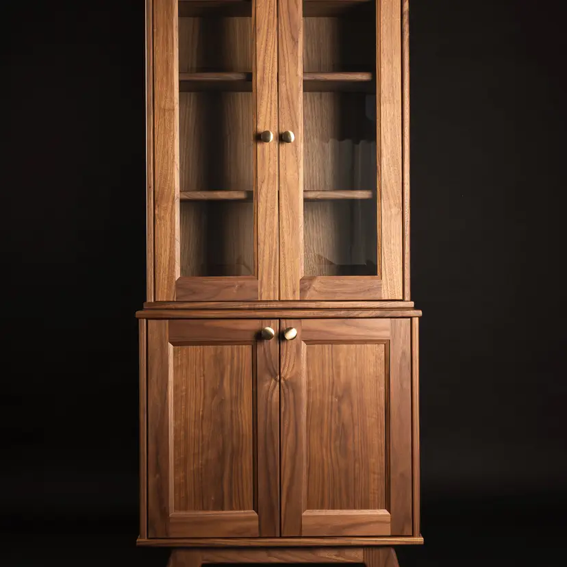 Crafted entirely from solid American walnut, this heirloom-quality cabinet showcases the natural warmth and depth of the wood through continuous book-matched grain that flows seamlessly across every panel and door. The upper section features custom beveled glass doors that highlight your favorite pieces while adding a subtle touch of refinement. Below, solid walnut doors conceal generous storage, offering a clean balance of form and function. Fit with solid brass hardware, every detail is designed to age beautifully over time - a timeless piece built to last for generations.