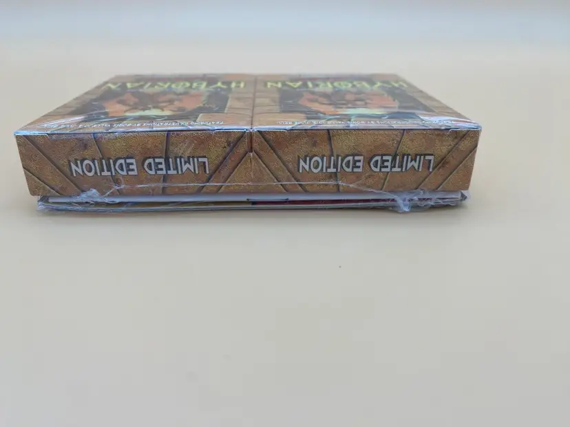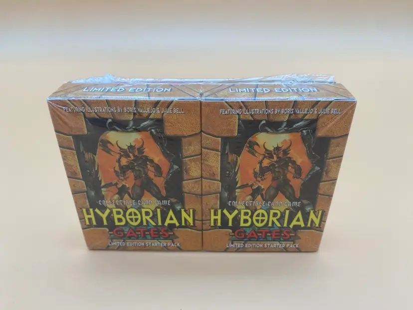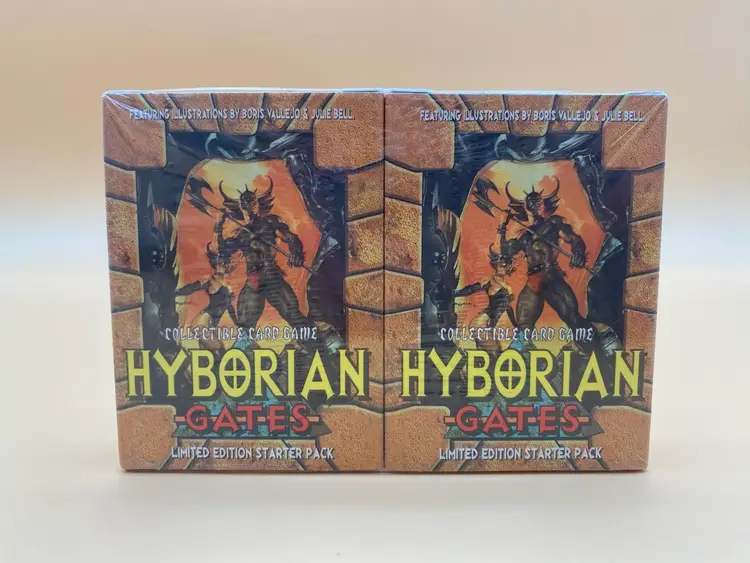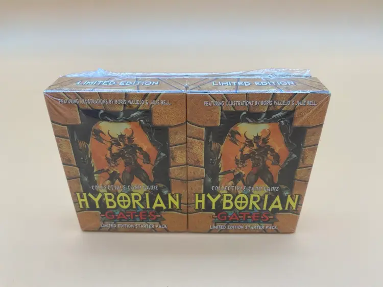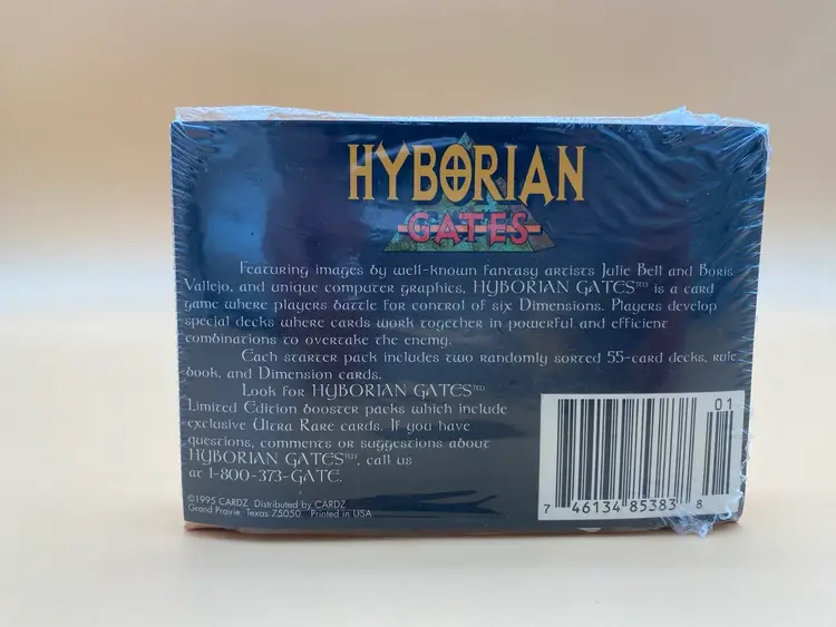 You are purchasing one Hyborian Gates CCG Limited Edition Starter Pack by Cardz from 1995. This Pack includes two 55-Card Decks, Rule Book and Dimension Cards. This Set is new and sealed in its original packaging.