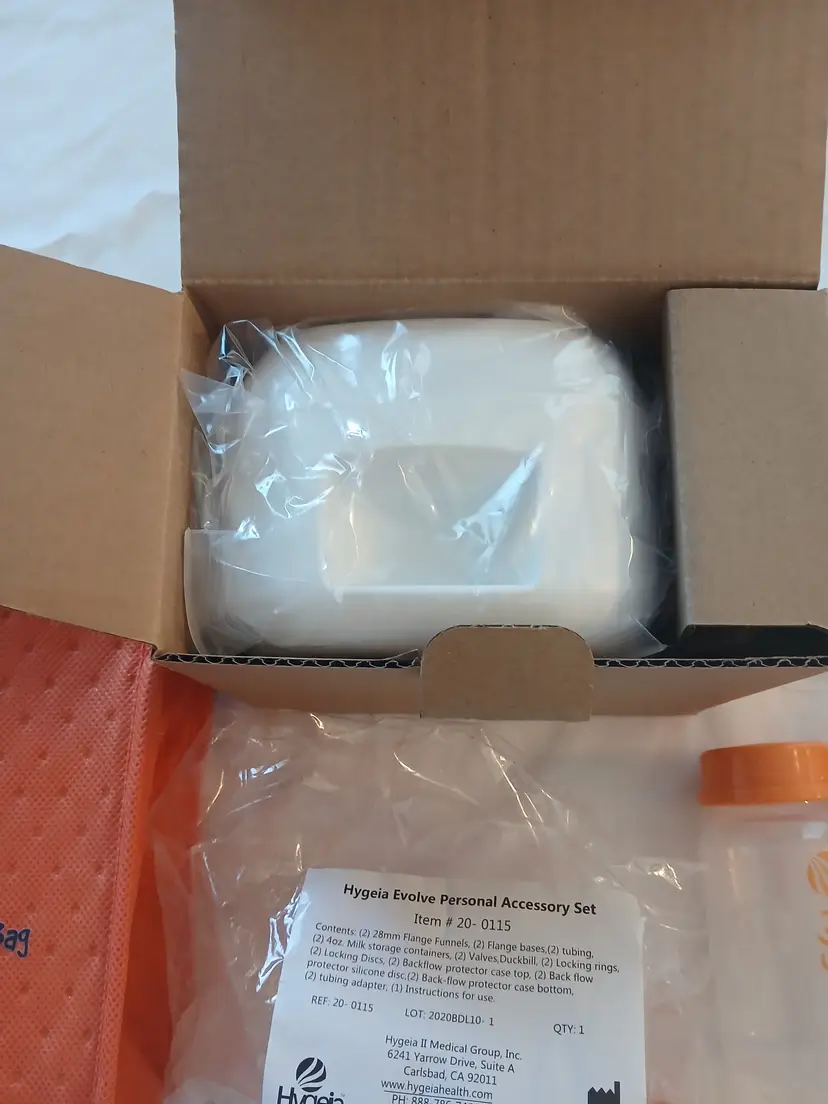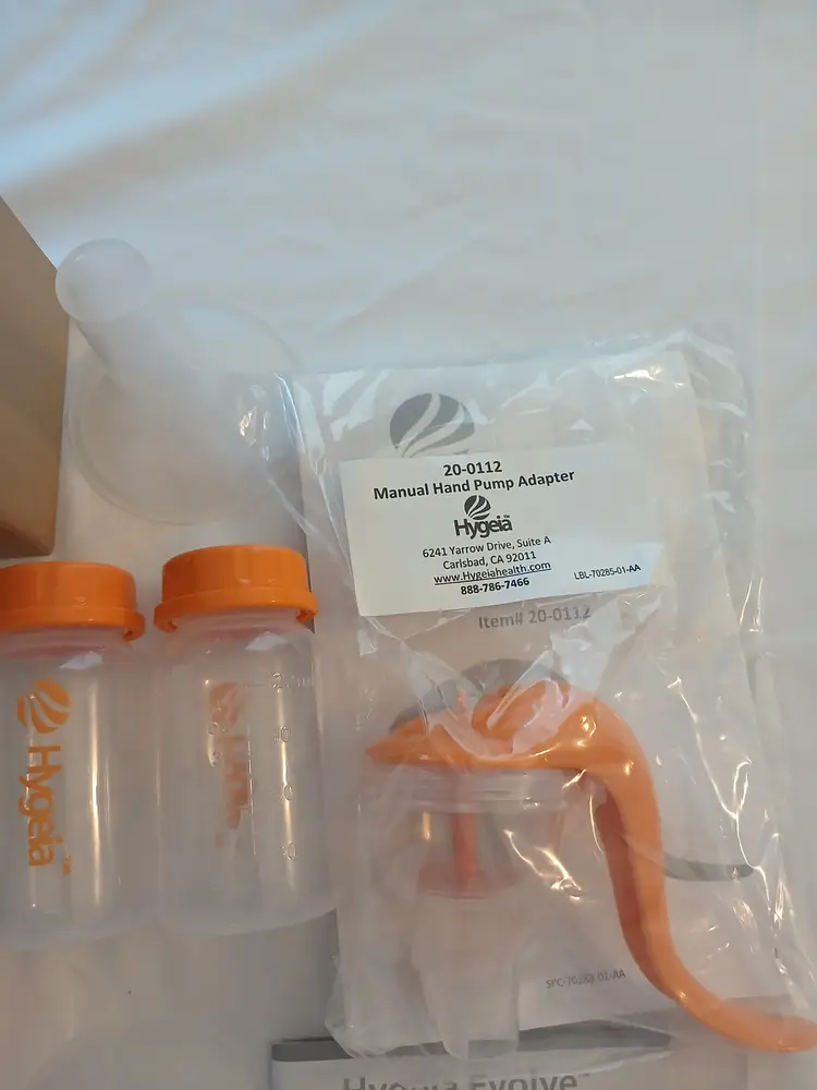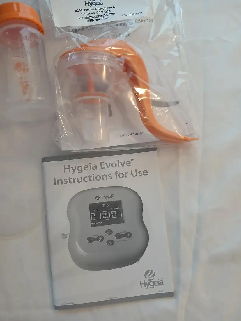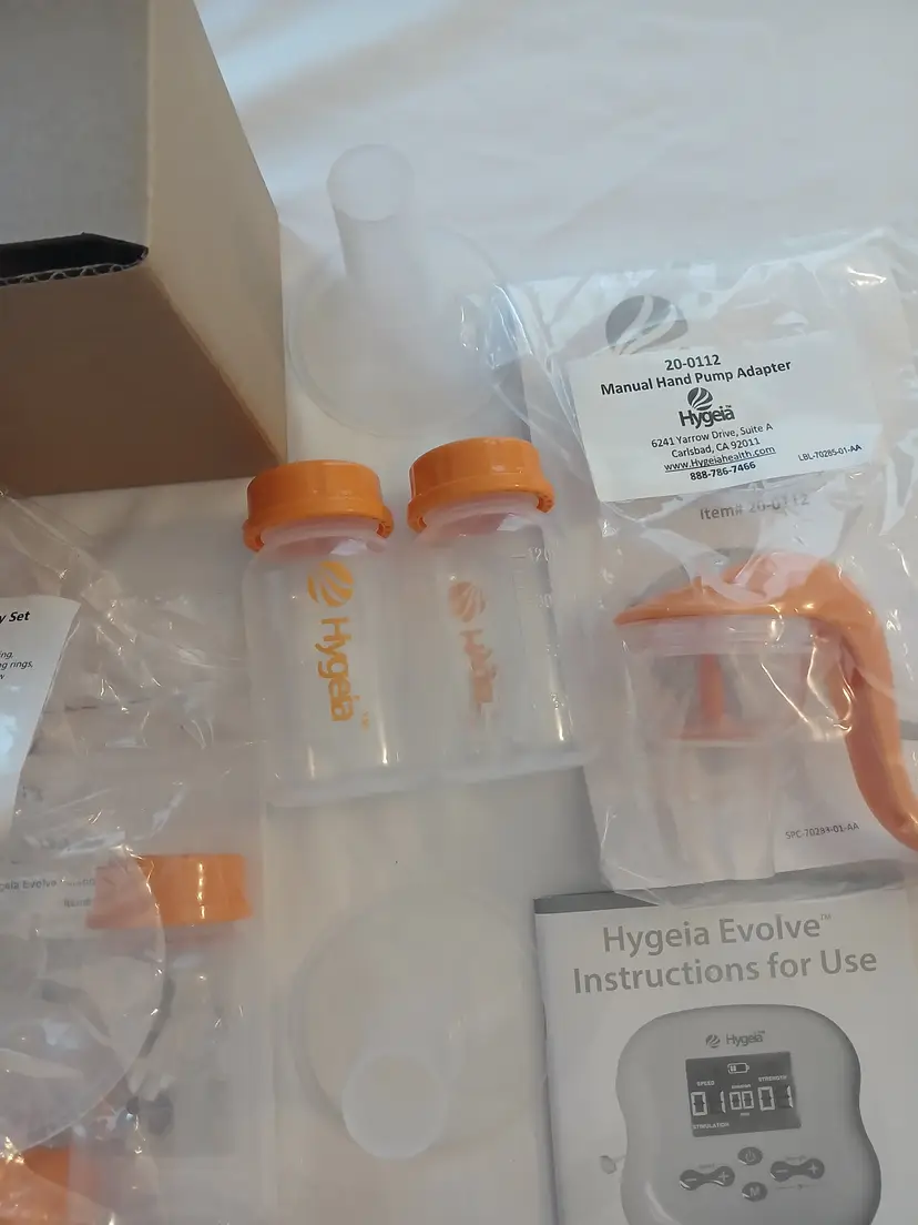 New in box (NIB) Hygeia Evolve Breast Pump Accessory Kit, complete with insulated "Healthy Baby Bag" tote, two 120 ml milk storage bottles, manual hand pump adapter, flange components, tubing adapter, backflow protector, and instruction manual. All original parts included and unused—perfect for spare parts or backup. Condition is pristine.