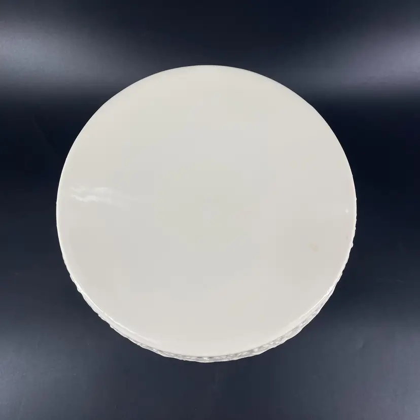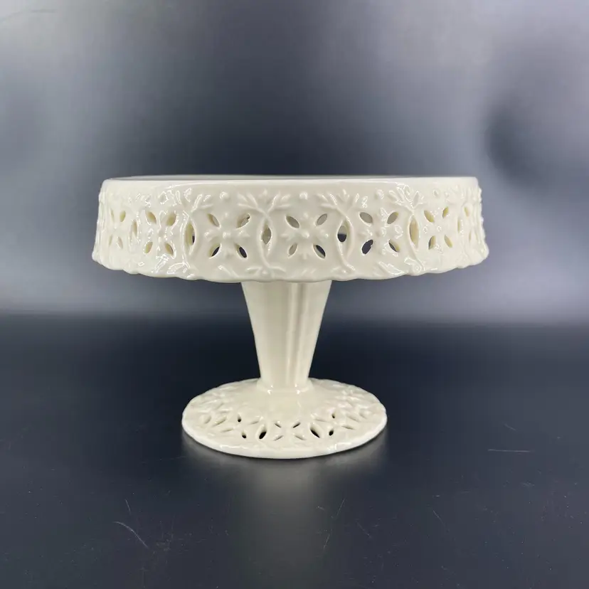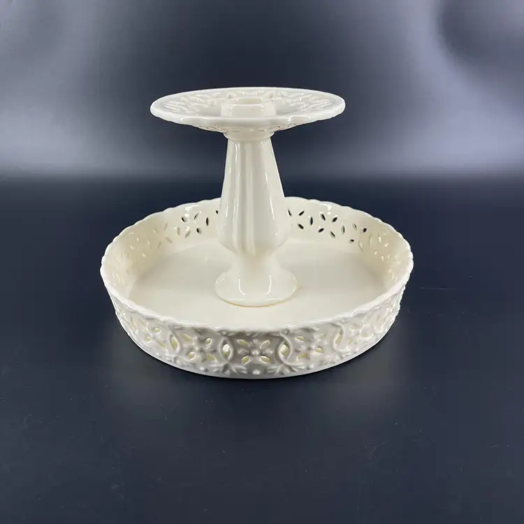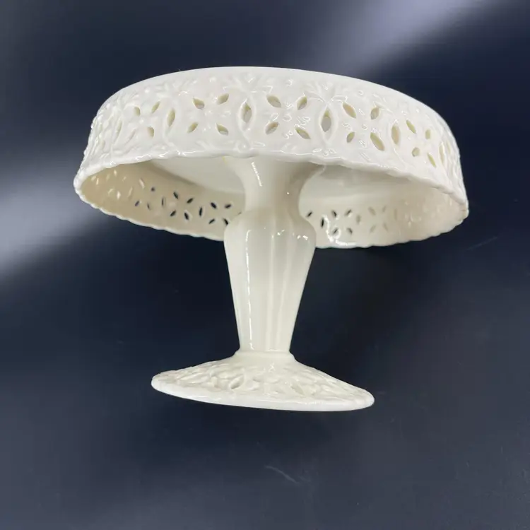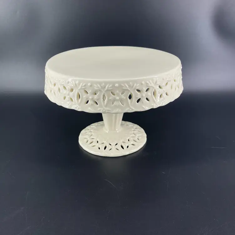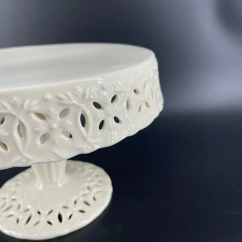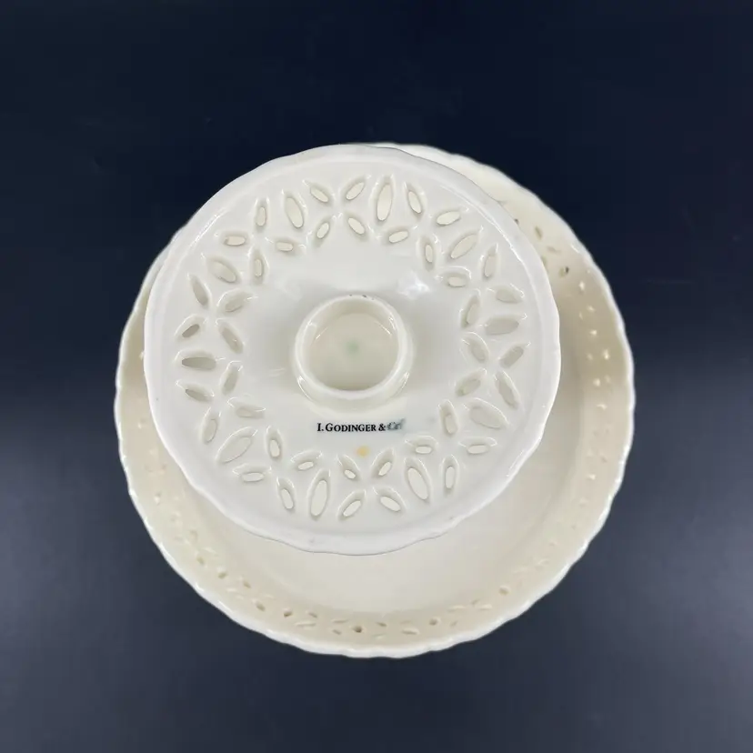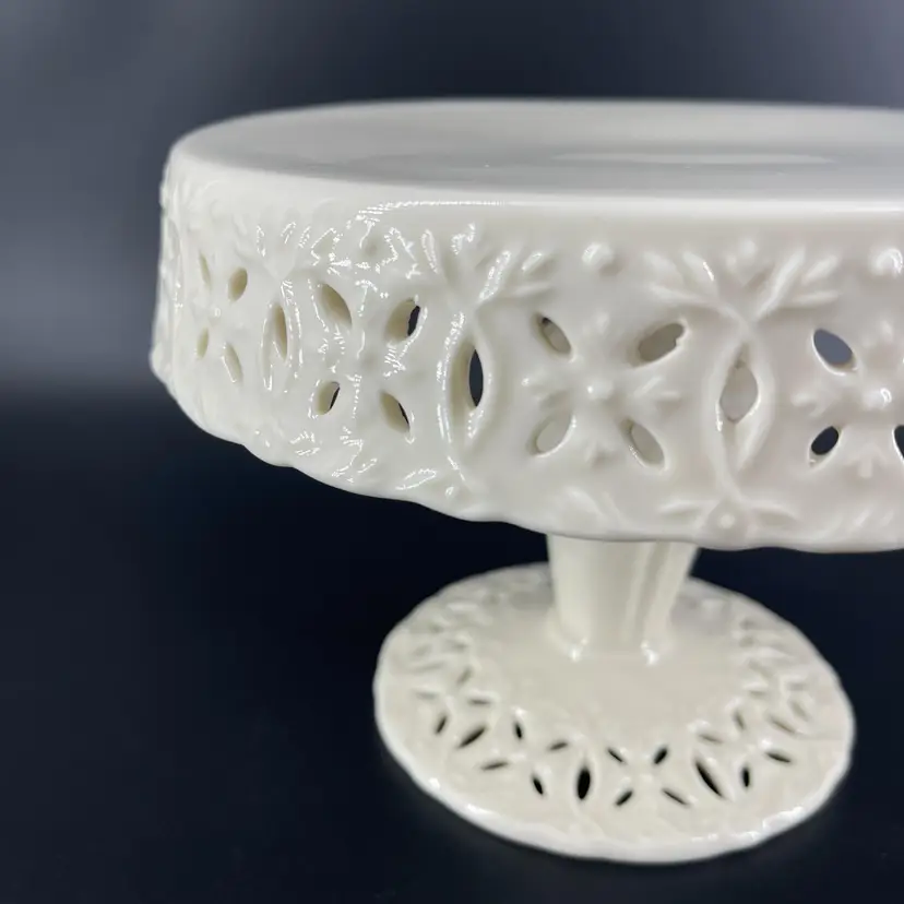 This stunning cake stand was made by I. Godinger & Co and features a lattice edge and base with a ribbed handle. It is 5.25" tall and 8" in diameter at its widest. It is in excellent condition. There are no cracks, breaks, chips or repairs. (See photos).