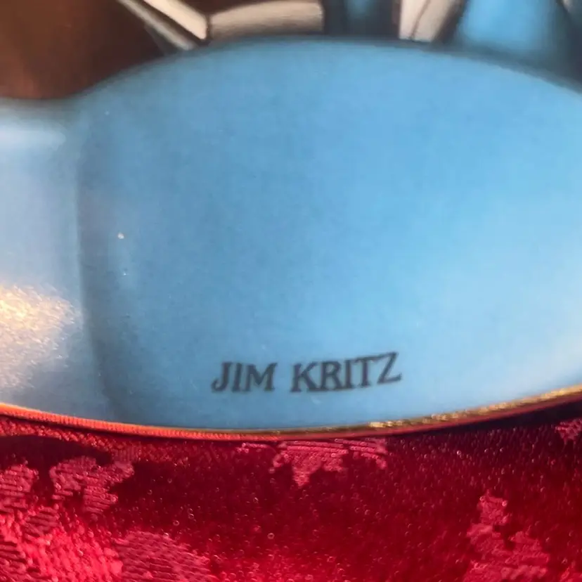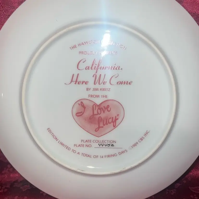 "I Love Lucy" collector plate titled "California, Here We Come". The plate is part of the "I Love Lucy Collection" produced by the Hamilton Collection. It was designed by artist Jim Kritz and issued in 1989. The artwork depicts the four main characters—Lucy and Ricky Ricardo, and Fred and Ethel Mertz—driving in a blue convertible car, a scene from the show's cross-country move storyline. This specific plate is a limited edition item crafted in fine china and is no longer in production