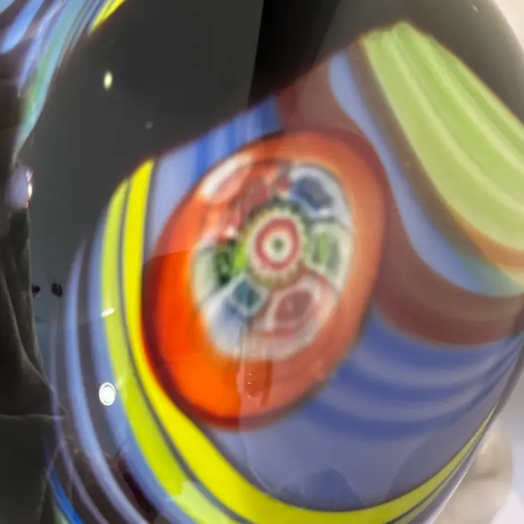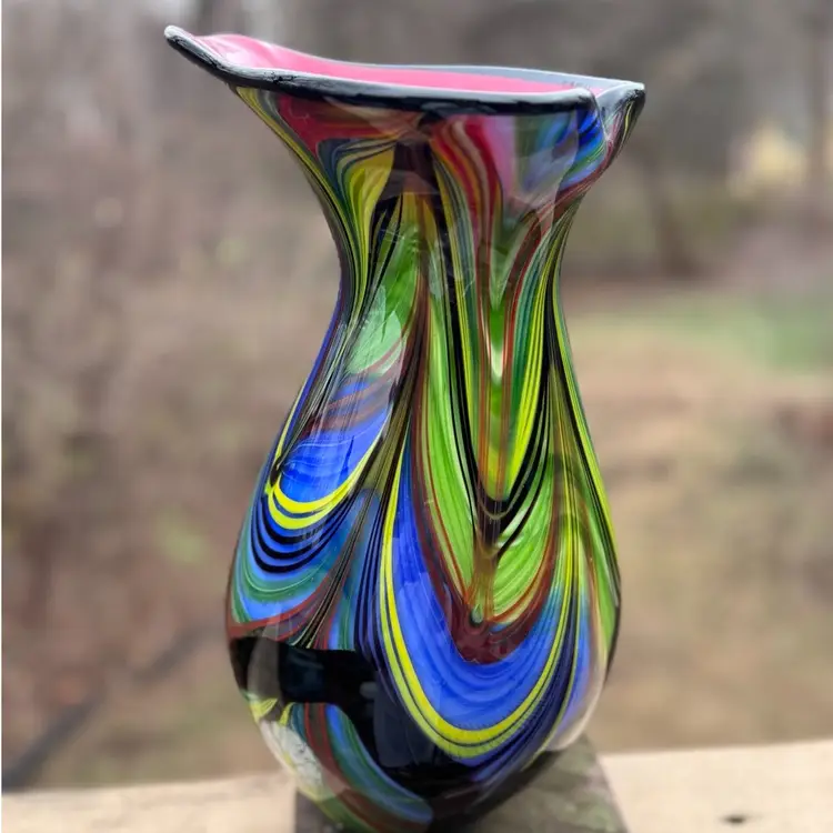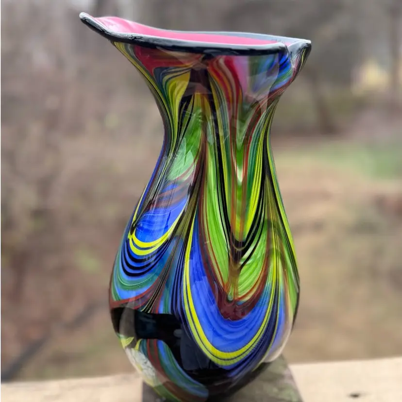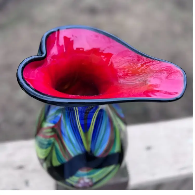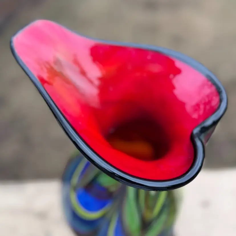 Amazing, vibrant, artisan made glass vase! Red heart shaped top. No chips or cracks! Photos do not do this justice! Would make a beautiful gift for a loved one. Measures 13 inches tall and weighs in at 7 pounds. So if it was fighting another vase, it would be in the heavyweight division.