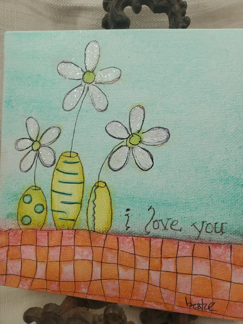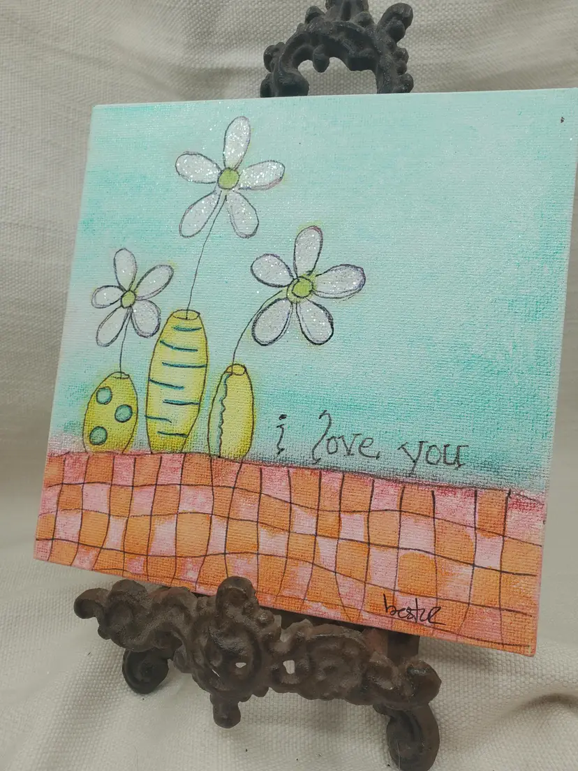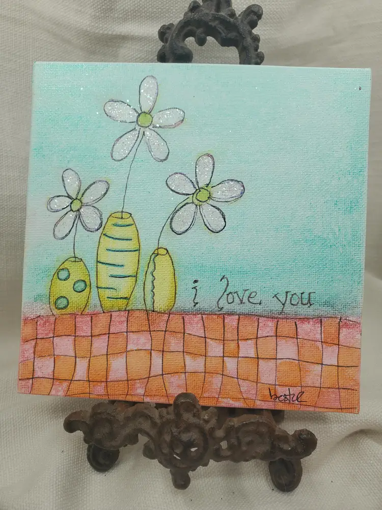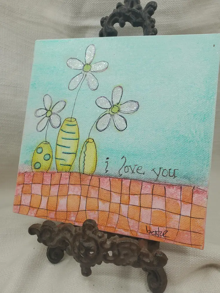 Handpainted Whimsical Flowers In yellow Vase 6" X 6" Canvas Panel Done In India Ink