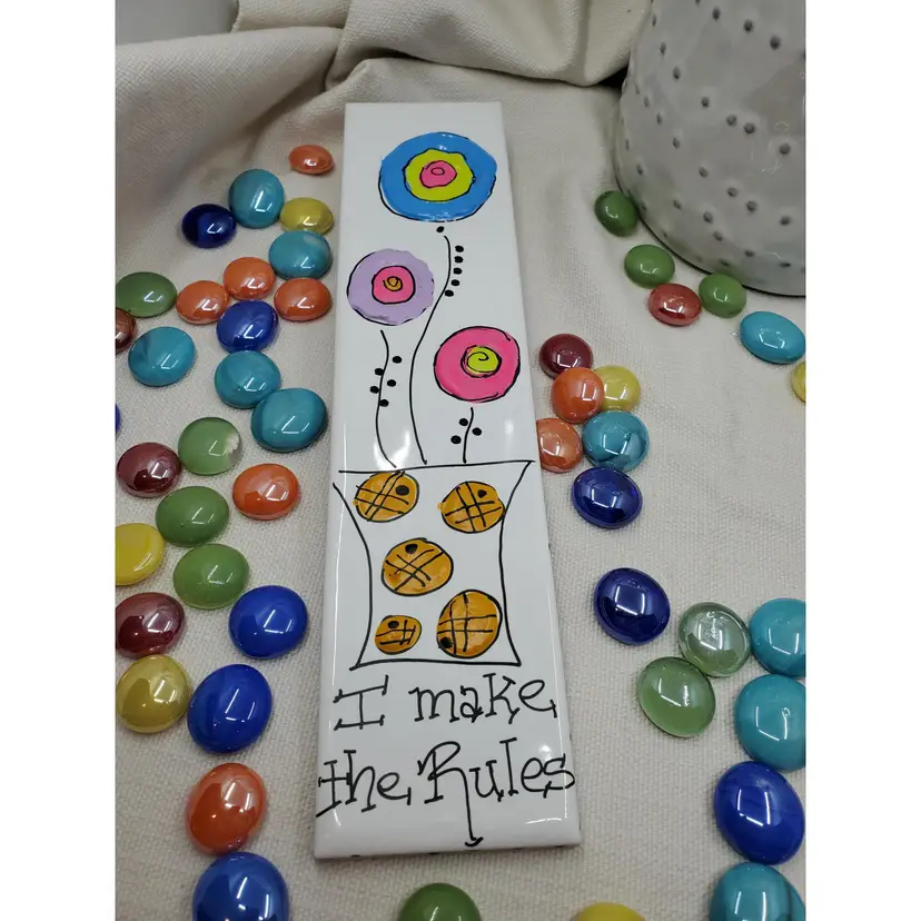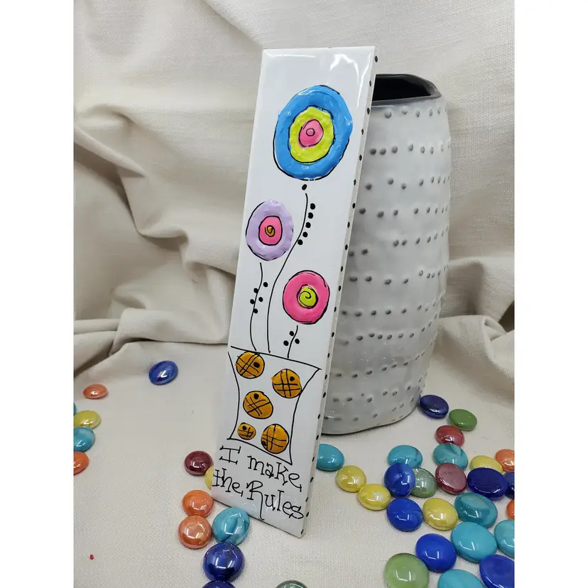 Whimsical Handpainted Flowers On Italian Tile 2.25" X 9.75" Ready To Hang Signed By Artist